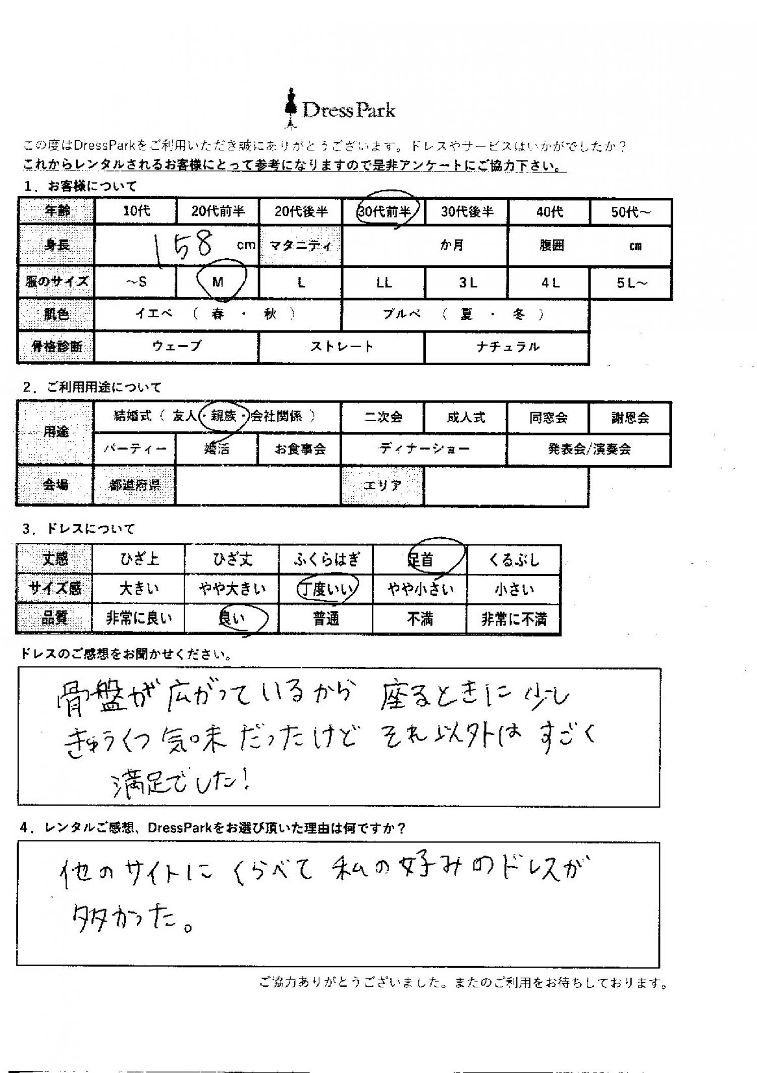 石川県 M.D様158㎝ Mサイズ #30代#M/L#155~159㎝#結婚式(親族)#石川県 ◆レンタルしたドレスはこちら ◆レンタルしたサイズは:M ◆レンタルした日付:2025/10/04 ドレスの着用感 ◆点数: (4点) ◆丈感:足首 ◆サイズ感:丁度いい ◆品質:良い ドレスの感想 骨盤が広がっているから、座るときに少し窮屈気味だったけど、それ以外はすごく満足でした! レンタルのご感想、DressParkをお選び頂いた理由 他のサイトに比べて私の好みのドレスが多かった。 CUSTOMER REVIEWS お客様の声 気になるカテゴリー別にご利用の感想をチェック! ◆AGE 年代で見る 10代 20代 30代 40代 50代~ ◆SIZE サイズで見る SS/S M/L 大きいサイズLL~ ◆HIGHT 身長で見る 140~149㎝ 150~154㎝ 155~159㎝ 160~164㎝ 165~169㎝ 170㎝以上 ◆マタニティ ~3か月 4~6か月 7~8か月 9~10か月 ◆肌色 イエベ ブルべ ◆骨格診断 ウェーブ ストレート ナチュラル ◆利用シーン 結婚式(友人) 結婚式(親族) 結婚式(会社関係) 二次会 成人式 謝恩会 パーティー その他 CUSTOMER REVIEWS都道府県別お客様の声 都道府県別にのお客様の声をチェック! 北海道 青森県 岩手県 宮城県 秋田県 山形県 福島県 茨城県 栃木県 群馬県 埼玉県 千葉県 東京都 神奈川県 新潟県 富山県 石川県 福井県 山梨県 長野県 岐阜県 静岡県 愛知県 三重県 滋賀県 京都府 大阪府 兵庫県 奈良県 和歌山県 鳥取県 島根県 岡山県 広島県 山口県 徳島県 香川県 愛媛県 高知県 福岡県 佐賀県 長崎県 熊本県 大分県 宮崎県 鹿児島県 沖縄県 CUSTOMER REVIEWSエリア別お客様の声 都道府県別にのお客様の声をチェック! 札幌 仙台 名古屋 軽井沢 金沢 神戸・芦屋 博多 那覇 梅田・新大阪 難波・心斎橋 鎌倉・湘南 横浜・みなとみらい 舞浜・浦安・幕張 大宮・浦和 青山・表参道 六本木・麻布 渋谷・恵比寿 新宿 池袋 銀座・丸の内 お台場・汐留 鹿児島市 郡山市 福島市 東予 甲府・石和 LINEでお問い合わせ このサイトではJavaScriptを使用しています