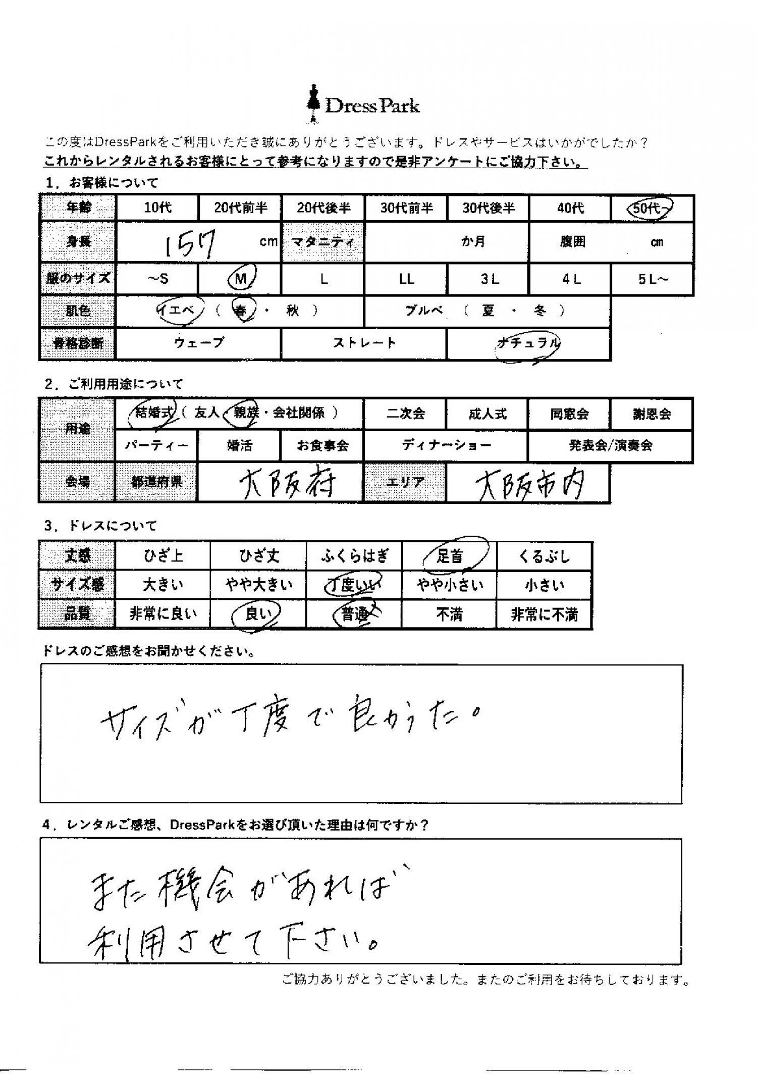 大阪府 M.S様157㎝ Mサイズ #50代~#M/L#155~159㎝#結婚式(親族)#大阪府 ◆レンタルしたドレスはこちら ◆レンタルしたサイズは:M ◆レンタルした日付:2025/10/05 ドレスの着用感 ◆点数: (4点) ◆丈感:足首 ◆サイズ感:丁度いい ◆品質:良い ◆肌色:イエベ ◆骨格診断:ナチュラル ドレスの感想 サイズがちょうどで良かった。 レンタルのご感想、DressParkをお選び頂いた理由 また機会があれば利用させてください。 CUSTOMER REVIEWS お客様の声 気になるカテゴリー別にご利用の感想をチェック! ◆AGE 年代で見る 10代 20代 30代 40代 50代~ ◆SIZE サイズで見る SS/S M/L 大きいサイズLL~ ◆HIGHT 身長で見る 140~149㎝ 150~154㎝ 155~159㎝ 160~164㎝ 165~169㎝ 170㎝以上 ◆マタニティ ~3か月 4~6か月 7~8か月 9~10か月 ◆肌色 イエベ ブルべ ◆骨格診断 ウェーブ ストレート ナチュラル ◆利用シーン 結婚式(友人) 結婚式(親族) 結婚式(会社関係) 二次会 成人式 謝恩会 パーティー その他 CUSTOMER REVIEWS都道府県別お客様の声 都道府県別にのお客様の声をチェック! 北海道 青森県 岩手県 宮城県 秋田県 山形県 福島県 茨城県 栃木県 群馬県 埼玉県 千葉県 東京都 神奈川県 新潟県 富山県 石川県 福井県 山梨県 長野県 岐阜県 静岡県 愛知県 三重県 滋賀県 京都府 大阪府 兵庫県 奈良県 和歌山県 鳥取県 島根県 岡山県 広島県 山口県 徳島県 香川県 愛媛県 高知県 福岡県 佐賀県 長崎県 熊本県 大分県 宮崎県 鹿児島県 沖縄県 CUSTOMER REVIEWSエリア別お客様の声 都道府県別にのお客様の声をチェック! 札幌 仙台 名古屋 軽井沢 金沢 神戸・芦屋 博多 那覇 梅田・新大阪 難波・心斎橋 鎌倉・湘南 横浜・みなとみらい 舞浜・浦安・幕張 大宮・浦和 青山・表参道 六本木・麻布 渋谷・恵比寿 新宿 池袋 銀座・丸の内 お台場・汐留 鹿児島市 郡山市 福島市 東予 甲府・石和 LINEでお問い合わせ このサイトではJavaScriptを使用しています