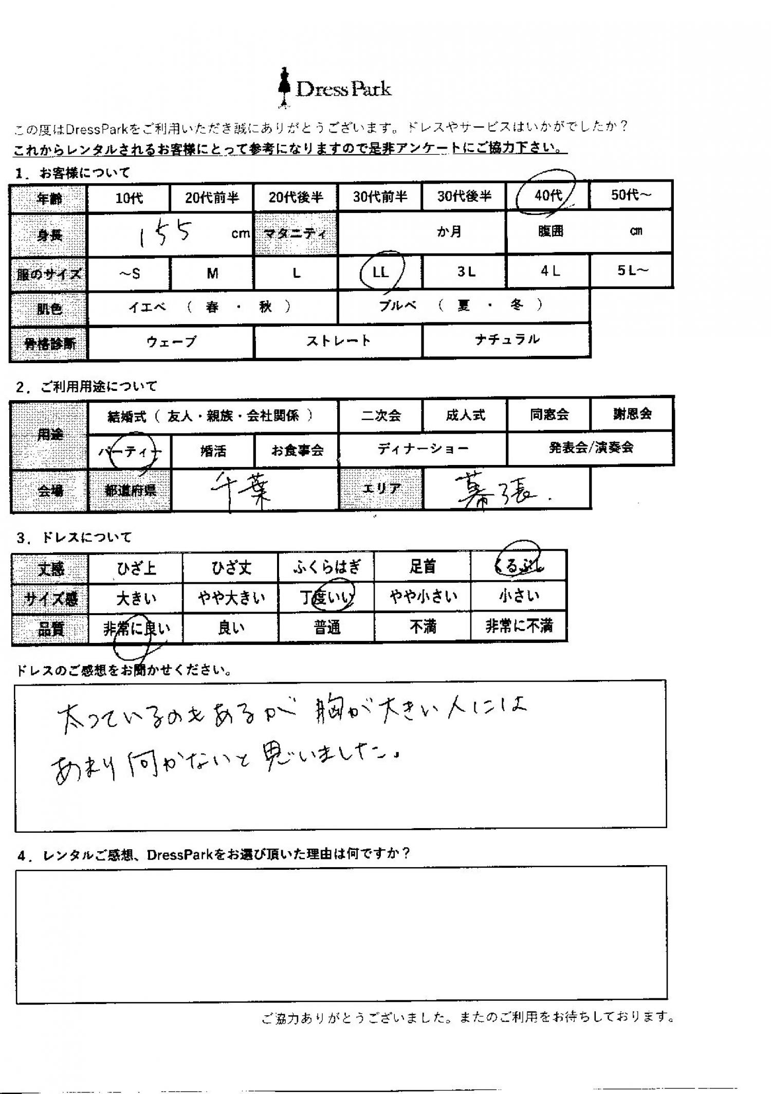 千葉県 M.K様155㎝ LLサイズ舞浜・浦安・幕張 #40代#大きいサイズLL~#155~159㎝#パーティー#千葉県#舞浜・浦安・幕張 ◆レンタルしたドレスはこちら ◆レンタルしたサイズは:3L ◆レンタルした日付:2025/10/09 ドレスの着用感 ◆点数: (5点) ◆丈感:くるぶし ◆サイズ感:丁度いい ◆品質:非常に良い ドレスの感想 太っているのもあるが、胸が大きい人にはあまり向かないと思いました。 CUSTOMER REVIEWS お客様の声 気になるカテゴリー別にご利用の感想をチェック! ◆AGE 年代で見る 10代 20代 30代 40代 50代~ ◆SIZE サイズで見る SS/S M/L 大きいサイズLL~ ◆HIGHT 身長で見る 140~149㎝ 150~154㎝ 155~159㎝ 160~164㎝ 165~169㎝ 170㎝以上 ◆マタニティ ~3か月 4~6か月 7~8か月 9~10か月 ◆肌色 イエベ ブルべ ◆骨格診断 ウェーブ ストレート ナチュラル ◆利用シーン 結婚式(友人) 結婚式(親族) 結婚式(会社関係) 二次会 成人式 謝恩会 パーティー その他 CUSTOMER REVIEWS都道府県別お客様の声 都道府県別にのお客様の声をチェック! 北海道 青森県 岩手県 宮城県 秋田県 山形県 福島県 茨城県 栃木県 群馬県 埼玉県 千葉県 東京都 神奈川県 新潟県 富山県 石川県 福井県 山梨県 長野県 岐阜県 静岡県 愛知県 三重県 滋賀県 京都府 大阪府 兵庫県 奈良県 和歌山県 鳥取県 島根県 岡山県 広島県 山口県 徳島県 香川県 愛媛県 高知県 福岡県 佐賀県 長崎県 熊本県 大分県 宮崎県 鹿児島県 沖縄県 CUSTOMER REVIEWSエリア別お客様の声 都道府県別にのお客様の声をチェック! 札幌 仙台 名古屋 軽井沢 金沢 神戸・芦屋 博多 那覇 梅田・新大阪 難波・心斎橋 鎌倉・湘南 横浜・みなとみらい 舞浜・浦安・幕張 大宮・浦和 青山・表参道 六本木・麻布 渋谷・恵比寿 新宿 池袋 銀座・丸の内 お台場・汐留 鹿児島市 郡山市 福島市 東予 甲府・石和 LINEでお問い合わせ このサイトではJavaScriptを使用しています