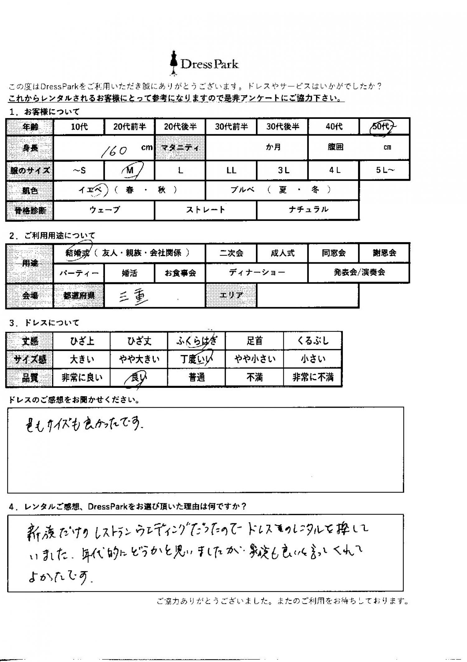 三重県 N.I様160㎝ Mサイズ #50代~#M/L#160~164㎝#結婚式(親族)#三重県 ◆レンタルしたドレスはこちら ◆レンタルしたサイズは:M ◆レンタルした日付:2025/10/04 ドレスの着用感 ◆点数: (4点) ◆丈感:ふくらはぎ ◆サイズ感:丁度いい ◆品質:良い ◆肌色:イエベ ドレスの感想 色もサイズもよかったです。 レンタルのご感想、DressParkをお選び頂いた理由 親族だけのレストランウェディングだったので、ドレスのレンタルを探していました。年代的にどうかと思いましたが、家族も良いと言ってくれてよかったです。 CUSTOMER REVIEWS お客様の声 気になるカテゴリー別にご利用の感想をチェック! ◆AGE 年代で見る 10代 20代 30代 40代 50代~ ◆SIZE サイズで見る SS/S M/L 大きいサイズLL~ ◆HIGHT 身長で見る 140~149㎝ 150~154㎝ 155~159㎝ 160~164㎝ 165~169㎝ 170㎝以上 ◆マタニティ ~3か月 4~6か月 7~8か月 9~10か月 ◆肌色 イエベ ブルべ ◆骨格診断 ウェーブ ストレート ナチュラル ◆利用シーン 結婚式(友人) 結婚式(親族) 結婚式(会社関係) 二次会 成人式 謝恩会 パーティー その他 CUSTOMER REVIEWS都道府県別お客様の声 都道府県別にのお客様の声をチェック! 北海道 青森県 岩手県 宮城県 秋田県 山形県 福島県 茨城県 栃木県 群馬県 埼玉県 千葉県 東京都 神奈川県 新潟県 富山県 石川県 福井県 山梨県 長野県 岐阜県 静岡県 愛知県 三重県 滋賀県 京都府 大阪府 兵庫県 奈良県 和歌山県 鳥取県 島根県 岡山県 広島県 山口県 徳島県 香川県 愛媛県 高知県 福岡県 佐賀県 長崎県 熊本県 大分県 宮崎県 鹿児島県 沖縄県 CUSTOMER REVIEWSエリア別お客様の声 都道府県別にのお客様の声をチェック! 札幌 仙台 名古屋 軽井沢 金沢 神戸・芦屋 博多 那覇 梅田・新大阪 難波・心斎橋 鎌倉・湘南 横浜・みなとみらい 舞浜・浦安・幕張 大宮・浦和 青山・表参道 六本木・麻布 渋谷・恵比寿 新宿 池袋 銀座・丸の内 お台場・汐留 鹿児島市 郡山市 福島市 東予 甲府・石和 LINEでお問い合わせ このサイトではJavaScriptを使用しています