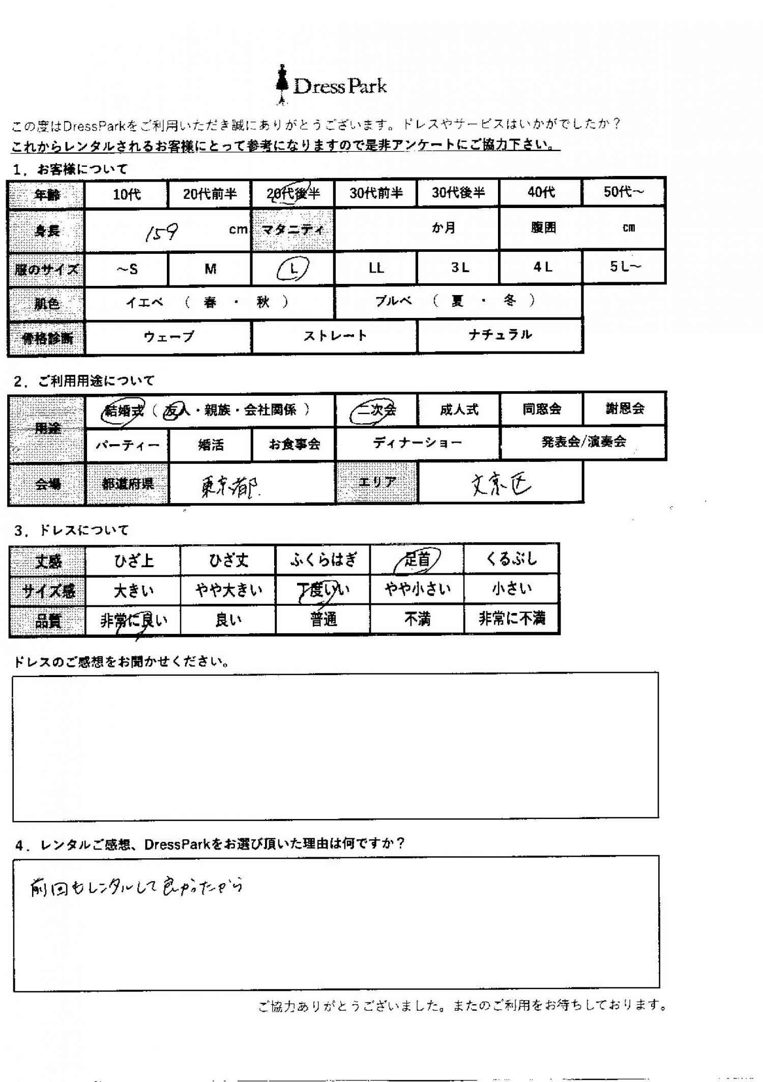 東京都 M.I様159㎝ Lサイズ #20代#M/L#155~159㎝#結婚式(友人)#東京都 ◆レンタルしたドレスはこちら ◆レンタルしたサイズは:M ◆レンタルした日付:2025/10/09 ドレスの着用感 ◆点数: (5点) ◆丈感:足首 ◆サイズ感:丁度いい ◆品質:非常に良い レンタルのご感想、DressParkをお選び頂いた理由 前回もレンタルして良かったから。 CUSTOMER REVIEWS お客様の声 気になるカテゴリー別にご利用の感想をチェック! ◆AGE 年代で見る 10代 20代 30代 40代 50代~ ◆SIZE サイズで見る SS/S M/L 大きいサイズLL~ ◆HIGHT 身長で見る 140~149㎝ 150~154㎝ 155~159㎝ 160~164㎝ 165~169㎝ 170㎝以上 ◆マタニティ ~3か月 4~6か月 7~8か月 9~10か月 ◆肌色 イエベ ブルべ ◆骨格診断 ウェーブ ストレート ナチュラル ◆利用シーン 結婚式(友人) 結婚式(親族) 結婚式(会社関係) 二次会 成人式 謝恩会 パーティー その他 CUSTOMER REVIEWS都道府県別お客様の声 都道府県別にのお客様の声をチェック! 北海道 青森県 岩手県 宮城県 秋田県 山形県 福島県 茨城県 栃木県 群馬県 埼玉県 千葉県 東京都 神奈川県 新潟県 富山県 石川県 福井県 山梨県 長野県 岐阜県 静岡県 愛知県 三重県 滋賀県 京都府 大阪府 兵庫県 奈良県 和歌山県 鳥取県 島根県 岡山県 広島県 山口県 徳島県 香川県 愛媛県 高知県 福岡県 佐賀県 長崎県 熊本県 大分県 宮崎県 鹿児島県 沖縄県 CUSTOMER REVIEWSエリア別お客様の声 都道府県別にのお客様の声をチェック! 札幌 仙台 名古屋 軽井沢 金沢 神戸・芦屋 博多 那覇 梅田・新大阪 難波・心斎橋 鎌倉・湘南 横浜・みなとみらい 舞浜・浦安・幕張 大宮・浦和 青山・表参道 六本木・麻布 渋谷・恵比寿 新宿 池袋 銀座・丸の内 お台場・汐留 鹿児島市 郡山市 福島市 東予 甲府・石和 LINEでお問い合わせ このサイトではJavaScriptを使用しています