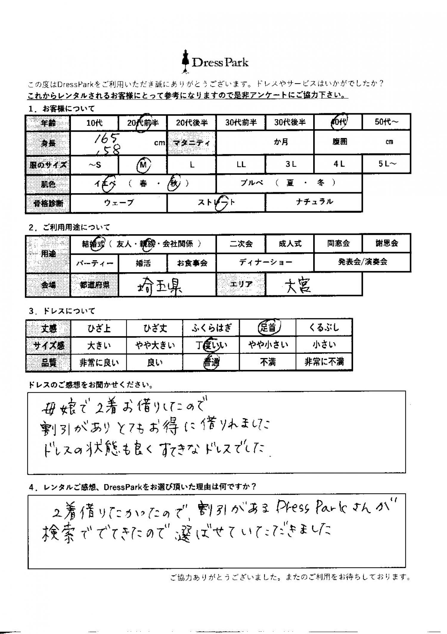 埼玉県 H.I様158㎝ Mサイズ大宮・浦和 #40代#M/L#155~159㎝#結婚式(親族)#埼玉県#大宮・浦和 ◆レンタルしたドレスはこちら ◆レンタルしたサイズは:M ◆レンタルした日付:2025/10/10 ドレスの着用感 ◆点数: (4点) ◆丈感:足首 ◆サイズ感:丁度いい ◆品質:普通 ◆肌色:イエベ ◆骨格診断:ストレート ドレスの感想 母娘で2着をお借りしたので割引がありとてもお得に借りれました。ドレスの状態も良く素敵なドレスでした。 レンタルのご感想、DressParkをお選び頂いた理由 2着借りたかったので、割引があるドレスパークさんが検索で出てきたので、選ばせていただきました。 CUSTOMER REVIEWS お客様の声 気になるカテゴリー別にご利用の感想をチェック! ◆AGE 年代で見る 10代 20代 30代 40代 50代~ ◆SIZE サイズで見る SS/S M/L 大きいサイズLL~ ◆HIGHT 身長で見る 140~149㎝ 150~154㎝ 155~159㎝ 160~164㎝ 165~169㎝ 170㎝以上 ◆マタニティ ~3か月 4~6か月 7~8か月 9~10か月 ◆肌色 イエベ ブルべ ◆骨格診断 ウェーブ ストレート ナチュラル ◆利用シーン 結婚式(友人) 結婚式(親族) 結婚式(会社関係) 二次会 成人式 謝恩会 パーティー その他 CUSTOMER REVIEWS都道府県別お客様の声 都道府県別にのお客様の声をチェック! 北海道 青森県 岩手県 宮城県 秋田県 山形県 福島県 茨城県 栃木県 群馬県 埼玉県 千葉県 東京都 神奈川県 新潟県 富山県 石川県 福井県 山梨県 長野県 岐阜県 静岡県 愛知県 三重県 滋賀県 京都府 大阪府 兵庫県 奈良県 和歌山県 鳥取県 島根県 岡山県 広島県 山口県 徳島県 香川県 愛媛県 高知県 福岡県 佐賀県 長崎県 熊本県 大分県 宮崎県 鹿児島県 沖縄県 CUSTOMER REVIEWSエリア別お客様の声 都道府県別にのお客様の声をチェック! 札幌 仙台 名古屋 軽井沢 金沢 神戸・芦屋 博多 那覇 梅田・新大阪 難波・心斎橋 鎌倉・湘南 横浜・みなとみらい 舞浜・浦安・幕張 大宮・浦和 青山・表参道 六本木・麻布 渋谷・恵比寿 新宿 池袋 銀座・丸の内 お台場・汐留 鹿児島市 郡山市 福島市 東予 甲府・石和 LINEでお問い合わせ このサイトではJavaScriptを使用しています