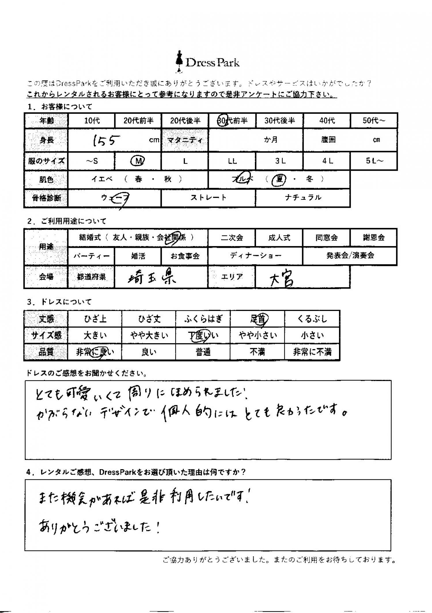 埼玉県 Y.M様155㎝ Mサイズ大宮・浦和 #30代#M/L#155~159㎝#結婚式(会社関係)#埼玉県#大宮・浦和 ◆レンタルしたドレスはこちら ◆レンタルしたサイズは:M ◆レンタルした日付:2025/10/10 ドレスの着用感 ◆点数: (5点) ◆丈感:足首 ◆サイズ感:丁度いい ◆品質:非常に良い ◆肌色:ブルべ ◆骨格診断:ウェーブ ドレスの感想 とても可愛くて周りに褒められました!かぶらないデザインで、個人的にはとても良かったです。 レンタルのご感想、DressParkをお選び頂いた理由 また機会があれば、ぜひ利用したいです!ありがとうございました! CUSTOMER REVIEWS お客様の声 気になるカテゴリー別にご利用の感想をチェック! ◆AGE 年代で見る 10代 20代 30代 40代 50代~ ◆SIZE サイズで見る SS/S M/L 大きいサイズLL~ ◆HIGHT 身長で見る 140~149㎝ 150~154㎝ 155~159㎝ 160~164㎝ 165~169㎝ 170㎝以上 ◆マタニティ ~3か月 4~6か月 7~8か月 9~10か月 ◆肌色 イエベ ブルべ ◆骨格診断 ウェーブ ストレート ナチュラル ◆利用シーン 結婚式(友人) 結婚式(親族) 結婚式(会社関係) 二次会 成人式 謝恩会 パーティー その他 CUSTOMER REVIEWS都道府県別お客様の声 都道府県別にのお客様の声をチェック! 北海道 青森県 岩手県 宮城県 秋田県 山形県 福島県 茨城県 栃木県 群馬県 埼玉県 千葉県 東京都 神奈川県 新潟県 富山県 石川県 福井県 山梨県 長野県 岐阜県 静岡県 愛知県 三重県 滋賀県 京都府 大阪府 兵庫県 奈良県 和歌山県 鳥取県 島根県 岡山県 広島県 山口県 徳島県 香川県 愛媛県 高知県 福岡県 佐賀県 長崎県 熊本県 大分県 宮崎県 鹿児島県 沖縄県 CUSTOMER REVIEWSエリア別お客様の声 都道府県別にのお客様の声をチェック! 札幌 仙台 名古屋 軽井沢 金沢 神戸・芦屋 博多 那覇 梅田・新大阪 難波・心斎橋 鎌倉・湘南 横浜・みなとみらい 舞浜・浦安・幕張 大宮・浦和 青山・表参道 六本木・麻布 渋谷・恵比寿 新宿 池袋 銀座・丸の内 お台場・汐留 鹿児島市 郡山市 福島市 東予 甲府・石和 LINEでお問い合わせ このサイトではJavaScriptを使用しています