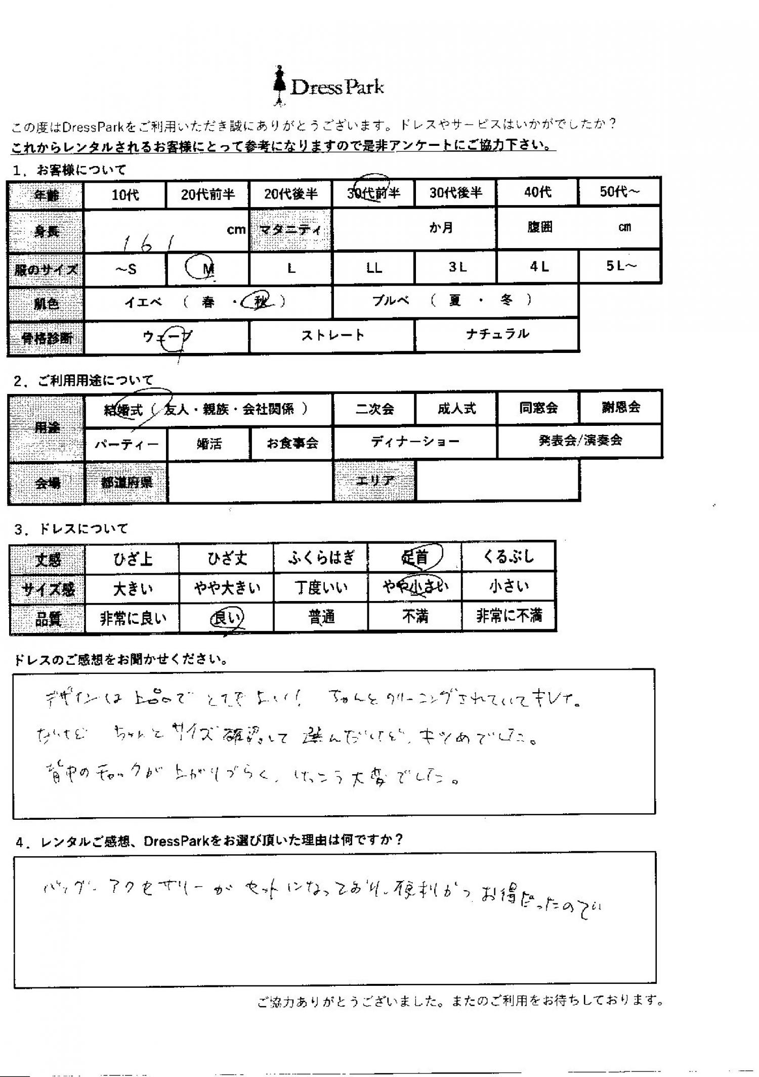 千葉県 M.S様161㎝ Mサイズ舞浜・浦安・幕張 #30代#M/L#160~164㎝#結婚式(友人)#千葉県#舞浜・浦安・幕張 ◆レンタルしたドレスはこちら ◆レンタルしたサイズは:M ◆レンタルした日付:2025/10/11 ドレスの着用感 ◆点数: (4点) ◆丈感:足首 ◆サイズ感:やや小さい ◆品質:良い ◆肌色:イエベ ◆骨格診断:ウェーブ ドレスの感想 デザインは上品でとても良い!ちゃんとクリーニングされていてきれい。だけどちゃんとサイズ確認して選んだけどきつめでした。背中のチャックが上がりづらく結構大変でした。 レンタルのご感想、DressParkをお選び頂いた理由 バッグ、アクセサリーがセットになっており、便利かつお得だったので。 CUSTOMER REVIEWS お客様の声 気になるカテゴリー別にご利用の感想をチェック! ◆AGE 年代で見る 10代 20代 30代 40代 50代~ ◆SIZE サイズで見る SS/S M/L 大きいサイズLL~ ◆HIGHT 身長で見る 140~149㎝ 150~154㎝ 155~159㎝ 160~164㎝ 165~169㎝ 170㎝以上 ◆マタニティ ~3か月 4~6か月 7~8か月 9~10か月 ◆肌色 イエベ ブルべ ◆骨格診断 ウェーブ ストレート ナチュラル ◆利用シーン 結婚式(友人) 結婚式(親族) 結婚式(会社関係) 二次会 成人式 謝恩会 パーティー その他 CUSTOMER REVIEWS都道府県別お客様の声 都道府県別にのお客様の声をチェック! 北海道 青森県 岩手県 宮城県 秋田県 山形県 福島県 茨城県 栃木県 群馬県 埼玉県 千葉県 東京都 神奈川県 新潟県 富山県 石川県 福井県 山梨県 長野県 岐阜県 静岡県 愛知県 三重県 滋賀県 京都府 大阪府 兵庫県 奈良県 和歌山県 鳥取県 島根県 岡山県 広島県 山口県 徳島県 香川県 愛媛県 高知県 福岡県 佐賀県 長崎県 熊本県 大分県 宮崎県 鹿児島県 沖縄県 CUSTOMER REVIEWSエリア別お客様の声 都道府県別にのお客様の声をチェック! 札幌 仙台 名古屋 軽井沢 金沢 神戸・芦屋 博多 那覇 梅田・新大阪 難波・心斎橋 鎌倉・湘南 横浜・みなとみらい 舞浜・浦安・幕張 大宮・浦和 青山・表参道 六本木・麻布 渋谷・恵比寿 新宿 池袋 銀座・丸の内 お台場・汐留 鹿児島市 郡山市 福島市 東予 甲府・石和 LINEでお問い合わせ このサイトではJavaScriptを使用しています
