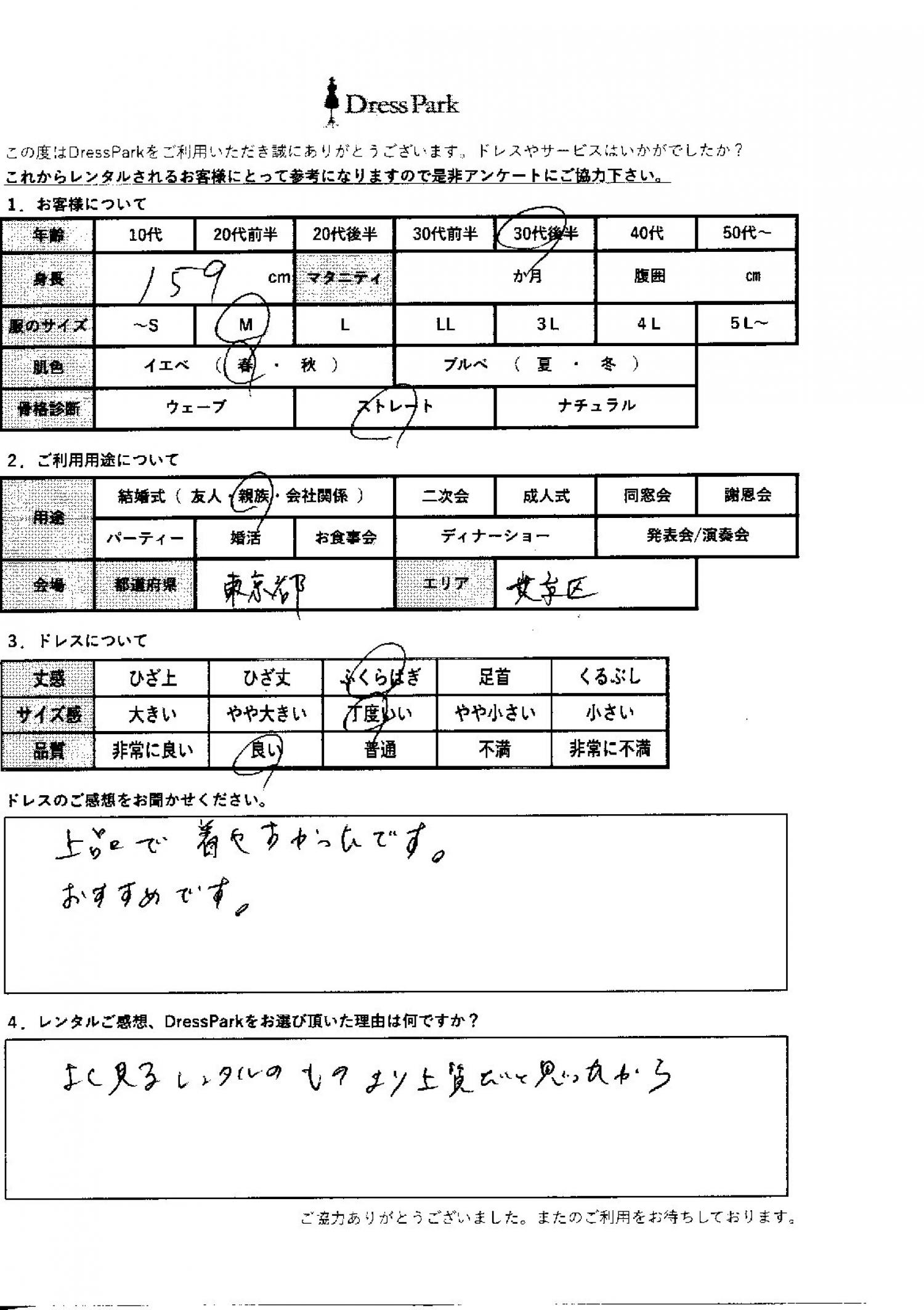 東京都 H.T様159㎝ Mサイズ #30代#M/L#155~159㎝#結婚式(親族)#東京都 ◆レンタルしたドレスはこちら ◆レンタルしたサイズは:M ◆レンタルした日付:2025/10/11 ドレスの着用感 ◆点数: (5点) ◆丈感:ふくらはぎ ◆サイズ感:丁度いい ◆品質:良い ◆肌色:イエベ ◆骨格診断:ストレート ドレスの感想 上品で着やすかったです。お勧めです。 レンタルのご感想、DressParkをお選び頂いた理由 よく見るレンタルのものより上質だと思ったから。 CUSTOMER REVIEWS お客様の声 気になるカテゴリー別にご利用の感想をチェック! ◆AGE 年代で見る 10代 20代 30代 40代 50代~ ◆SIZE サイズで見る SS/S M/L 大きいサイズLL~ ◆HIGHT 身長で見る 140~149㎝ 150~154㎝ 155~159㎝ 160~164㎝ 165~169㎝ 170㎝以上 ◆マタニティ ~3か月 4~6か月 7~8か月 9~10か月 ◆肌色 イエベ ブルべ ◆骨格診断 ウェーブ ストレート ナチュラル ◆利用シーン 結婚式(友人) 結婚式(親族) 結婚式(会社関係) 二次会 成人式 謝恩会 パーティー その他 CUSTOMER REVIEWS都道府県別お客様の声 都道府県別にのお客様の声をチェック! 北海道 青森県 岩手県 宮城県 秋田県 山形県 福島県 茨城県 栃木県 群馬県 埼玉県 千葉県 東京都 神奈川県 新潟県 富山県 石川県 福井県 山梨県 長野県 岐阜県 静岡県 愛知県 三重県 滋賀県 京都府 大阪府 兵庫県 奈良県 和歌山県 鳥取県 島根県 岡山県 広島県 山口県 徳島県 香川県 愛媛県 高知県 福岡県 佐賀県 長崎県 熊本県 大分県 宮崎県 鹿児島県 沖縄県 CUSTOMER REVIEWSエリア別お客様の声 都道府県別にのお客様の声をチェック! 札幌 仙台 名古屋 軽井沢 金沢 神戸・芦屋 博多 那覇 梅田・新大阪 難波・心斎橋 鎌倉・湘南 横浜・みなとみらい 舞浜・浦安・幕張 大宮・浦和 青山・表参道 六本木・麻布 渋谷・恵比寿 新宿 池袋 銀座・丸の内 お台場・汐留 鹿児島市 郡山市 福島市 東予 甲府・石和 LINEでお問い合わせ このサイトではJavaScriptを使用しています