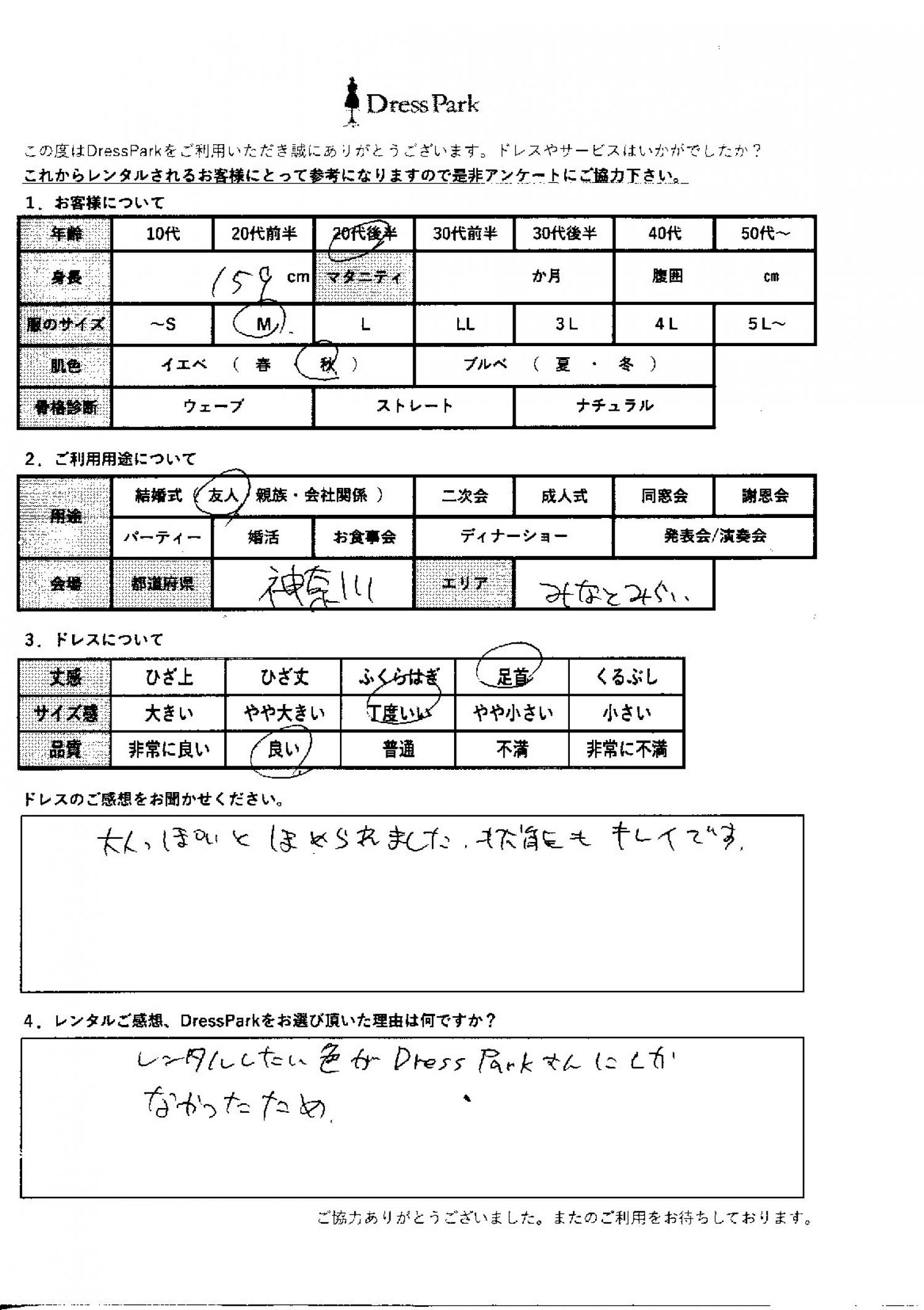 神奈川県 Y.K様159㎝ Mサイズ横浜・みなとみらい #20代#M/L#155~159㎝#結婚式(友人)#神奈川県#横浜・みなとみらい ◆レンタルしたドレスはこちら ◆レンタルしたサイズは:M ◆レンタルした日付:2025/10/11 ドレスの着用感 ◆点数: (4点) ◆丈感:足首 ◆サイズ感:丁度いい ◆品質:良い ◆肌色:イエベ ドレスの感想 大人っぽいと褒められました。状態もきれいです。 レンタルのご感想、DressParkをお選び頂いた理由 レンタルしたい色がドレスパークさんにしかなかったため。 CUSTOMER REVIEWS お客様の声 気になるカテゴリー別にご利用の感想をチェック! ◆AGE 年代で見る 10代 20代 30代 40代 50代~ ◆SIZE サイズで見る SS/S M/L 大きいサイズLL~ ◆HIGHT 身長で見る 140~149㎝ 150~154㎝ 155~159㎝ 160~164㎝ 165~169㎝ 170㎝以上 ◆マタニティ ~3か月 4~6か月 7~8か月 9~10か月 ◆肌色 イエベ ブルべ ◆骨格診断 ウェーブ ストレート ナチュラル ◆利用シーン 結婚式(友人) 結婚式(親族) 結婚式(会社関係) 二次会 成人式 謝恩会 パーティー その他 CUSTOMER REVIEWS都道府県別お客様の声 都道府県別にのお客様の声をチェック! 北海道 青森県 岩手県 宮城県 秋田県 山形県 福島県 茨城県 栃木県 群馬県 埼玉県 千葉県 東京都 神奈川県 新潟県 富山県 石川県 福井県 山梨県 長野県 岐阜県 静岡県 愛知県 三重県 滋賀県 京都府 大阪府 兵庫県 奈良県 和歌山県 鳥取県 島根県 岡山県 広島県 山口県 徳島県 香川県 愛媛県 高知県 福岡県 佐賀県 長崎県 熊本県 大分県 宮崎県 鹿児島県 沖縄県 CUSTOMER REVIEWSエリア別お客様の声 都道府県別にのお客様の声をチェック! 札幌 仙台 名古屋 軽井沢 金沢 神戸・芦屋 博多 那覇 梅田・新大阪 難波・心斎橋 鎌倉・湘南 横浜・みなとみらい 舞浜・浦安・幕張 大宮・浦和 青山・表参道 六本木・麻布 渋谷・恵比寿 新宿 池袋 銀座・丸の内 お台場・汐留 鹿児島市 郡山市 福島市 東予 甲府・石和 LINEでお問い合わせ このサイトではJavaScriptを使用しています