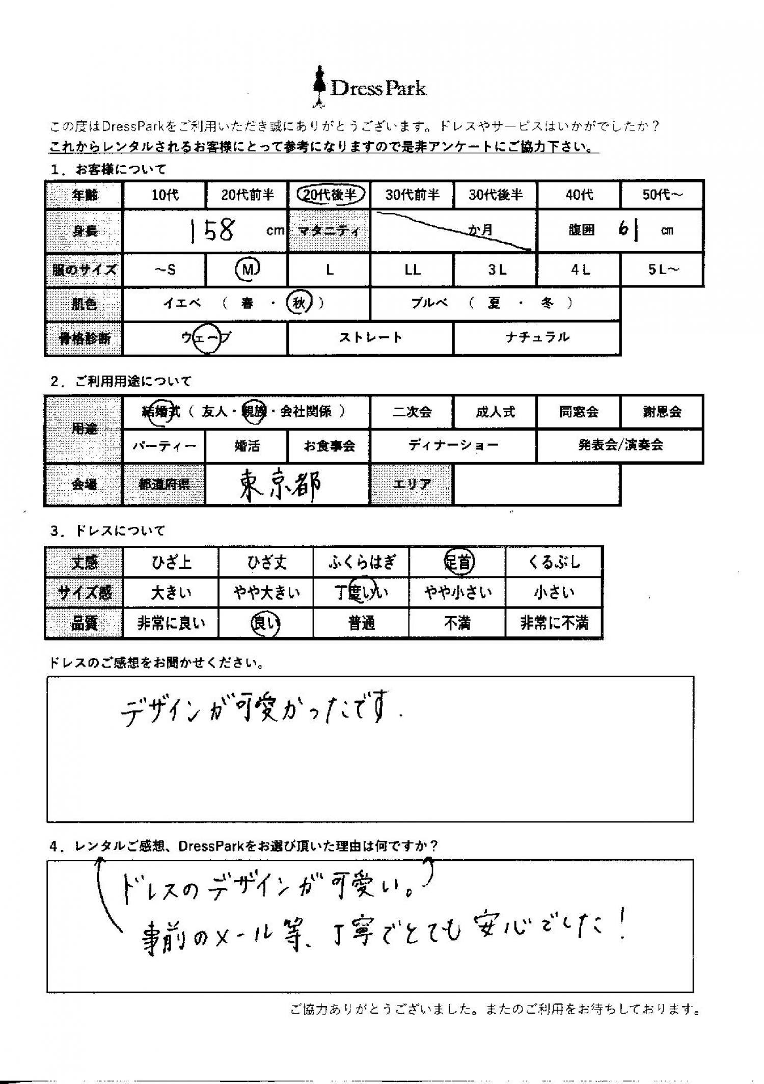 東京都 C.S様158㎝ Mサイズ #20代#M/L#155~159㎝#結婚式(親族)#東京都 ◆レンタルしたドレスはこちら ◆レンタルしたサイズは:M ◆レンタルした日付:2025/10/11 ドレスの着用感 ◆点数: (4点) ◆丈感:足首 ◆サイズ感:丁度いい ◆品質:良い ◆肌色:イエベ ◆骨格診断:ウェーブ ドレスの感想 デザインが可愛かったです。 レンタルのご感想、DressParkをお選び頂いた理由 ドレスのデザインが可愛い。事前のメール等丁寧でとても安心でした! CUSTOMER REVIEWS お客様の声 気になるカテゴリー別にご利用の感想をチェック! ◆AGE 年代で見る 10代 20代 30代 40代 50代~ ◆SIZE サイズで見る SS/S M/L 大きいサイズLL~ ◆HIGHT 身長で見る 140~149㎝ 150~154㎝ 155~159㎝ 160~164㎝ 165~169㎝ 170㎝以上 ◆マタニティ ~3か月 4~6か月 7~8か月 9~10か月 ◆肌色 イエベ ブルべ ◆骨格診断 ウェーブ ストレート ナチュラル ◆利用シーン 結婚式(友人) 結婚式(親族) 結婚式(会社関係) 二次会 成人式 謝恩会 パーティー その他 CUSTOMER REVIEWS都道府県別お客様の声 都道府県別にのお客様の声をチェック! 北海道 青森県 岩手県 宮城県 秋田県 山形県 福島県 茨城県 栃木県 群馬県 埼玉県 千葉県 東京都 神奈川県 新潟県 富山県 石川県 福井県 山梨県 長野県 岐阜県 静岡県 愛知県 三重県 滋賀県 京都府 大阪府 兵庫県 奈良県 和歌山県 鳥取県 島根県 岡山県 広島県 山口県 徳島県 香川県 愛媛県 高知県 福岡県 佐賀県 長崎県 熊本県 大分県 宮崎県 鹿児島県 沖縄県 CUSTOMER REVIEWSエリア別お客様の声 都道府県別にのお客様の声をチェック! 札幌 仙台 名古屋 軽井沢 金沢 神戸・芦屋 博多 那覇 梅田・新大阪 難波・心斎橋 鎌倉・湘南 横浜・みなとみらい 舞浜・浦安・幕張 大宮・浦和 青山・表参道 六本木・麻布 渋谷・恵比寿 新宿 池袋 銀座・丸の内 お台場・汐留 鹿児島市 郡山市 福島市 東予 甲府・石和 LINEでお問い合わせ このサイトではJavaScriptを使用しています