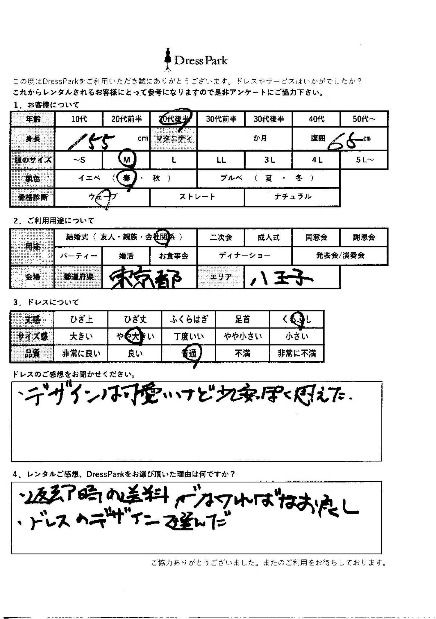 東京都 Y.T様155㎝ Mサイズ #20代#M/L#155~159㎝#結婚式(会社関係)#東京都 ◆レンタルしたドレスはこちら ◆レンタルしたサイズは:M ◆レンタルした日付:2025/10/11 ドレスの着用感 ◆点数: (3点) ◆丈感:くるぶし ◆サイズ感:やや大きい ◆品質:普通 ◆肌色:イエベ ◆骨格診断:ウェーブ ドレスの感想 デザインはかわいいけど、少し安っぽく思えた。 レンタルのご感想、DressParkをお選び頂いた理由 返却時の送料がなければ尚良し。ドレスのデザインで選んだ。 CUSTOMER REVIEWS お客様の声 気になるカテゴリー別にご利用の感想をチェック! ◆AGE 年代で見る 10代 20代 30代 40代 50代~ ◆SIZE サイズで見る SS/S M/L 大きいサイズLL~ ◆HIGHT 身長で見る 140~149㎝ 150~154㎝ 155~159㎝ 160~164㎝ 165~169㎝ 170㎝以上 ◆マタニティ ~3か月 4~6か月 7~8か月 9~10か月 ◆肌色 イエベ ブルべ ◆骨格診断 ウェーブ ストレート ナチュラル ◆利用シーン 結婚式(友人) 結婚式(親族) 結婚式(会社関係) 二次会 成人式 謝恩会 パーティー その他 CUSTOMER REVIEWS都道府県別お客様の声 都道府県別にのお客様の声をチェック! 北海道 青森県 岩手県 宮城県 秋田県 山形県 福島県 茨城県 栃木県 群馬県 埼玉県 千葉県 東京都 神奈川県 新潟県 富山県 石川県 福井県 山梨県 長野県 岐阜県 静岡県 愛知県 三重県 滋賀県 京都府 大阪府 兵庫県 奈良県 和歌山県 鳥取県 島根県 岡山県 広島県 山口県 徳島県 香川県 愛媛県 高知県 福岡県 佐賀県 長崎県 熊本県 大分県 宮崎県 鹿児島県 沖縄県 CUSTOMER REVIEWSエリア別お客様の声 都道府県別にのお客様の声をチェック! 札幌 仙台 名古屋 軽井沢 金沢 神戸・芦屋 博多 那覇 梅田・新大阪 難波・心斎橋 鎌倉・湘南 横浜・みなとみらい 舞浜・浦安・幕張 大宮・浦和 青山・表参道 六本木・麻布 渋谷・恵比寿 新宿 池袋 銀座・丸の内 お台場・汐留 鹿児島市 郡山市 福島市 東予 甲府・石和 LINEでお問い合わせ このサイトではJavaScriptを使用しています