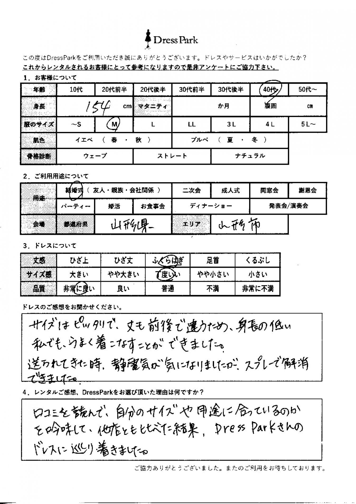 山形県 R.M様154㎝ Mサイズ #40代#M/L#150~154㎝#結婚式(友人)#山形県 ◆レンタルしたドレスはこちら ◆レンタルしたサイズは:M ◆レンタルした日付:2025/10/11 ドレスの着用感 ◆点数: (5点) ◆丈感:ふくらはぎ ◆サイズ感:丁度いい ◆品質:非常に良い ドレスの感想 サイズはぴったりで、丈も前後で違うため、身長の低い私でもうまく着こなすことができました。送られてきた時、静電気が気になりましたが、スプレーで解消できました。 レンタルのご感想、DressParkをお選び頂いた理由 口コミを読んで、自分のサイズや用途に合っているのかを吟味して、他店とも比べた結果、ドレスパークさんのドレスにたどり着きました。 CUSTOMER REVIEWS お客様の声 気になるカテゴリー別にご利用の感想をチェック! ◆AGE 年代で見る 10代 20代 30代 40代 50代~ ◆SIZE サイズで見る SS/S M/L 大きいサイズLL~ ◆HIGHT 身長で見る 140~149㎝ 150~154㎝ 155~159㎝ 160~164㎝ 165~169㎝ 170㎝以上 ◆マタニティ ~3か月 4~6か月 7~8か月 9~10か月 ◆肌色 イエベ ブルべ ◆骨格診断 ウェーブ ストレート ナチュラル ◆利用シーン 結婚式(友人) 結婚式(親族) 結婚式(会社関係) 二次会 成人式 謝恩会 パーティー その他 CUSTOMER REVIEWS都道府県別お客様の声 都道府県別にのお客様の声をチェック! 北海道 青森県 岩手県 宮城県 秋田県 山形県 福島県 茨城県 栃木県 群馬県 埼玉県 千葉県 東京都 神奈川県 新潟県 富山県 石川県 福井県 山梨県 長野県 岐阜県 静岡県 愛知県 三重県 滋賀県 京都府 大阪府 兵庫県 奈良県 和歌山県 鳥取県 島根県 岡山県 広島県 山口県 徳島県 香川県 愛媛県 高知県 福岡県 佐賀県 長崎県 熊本県 大分県 宮崎県 鹿児島県 沖縄県 CUSTOMER REVIEWSエリア別お客様の声 都道府県別にのお客様の声をチェック! 札幌 仙台 名古屋 軽井沢 金沢 神戸・芦屋 博多 那覇 梅田・新大阪 難波・心斎橋 鎌倉・湘南 横浜・みなとみらい 舞浜・浦安・幕張 大宮・浦和 青山・表参道 六本木・麻布 渋谷・恵比寿 新宿 池袋 銀座・丸の内 お台場・汐留 鹿児島市 郡山市 福島市 東予 甲府・石和 LINEでお問い合わせ このサイトではJavaScriptを使用しています