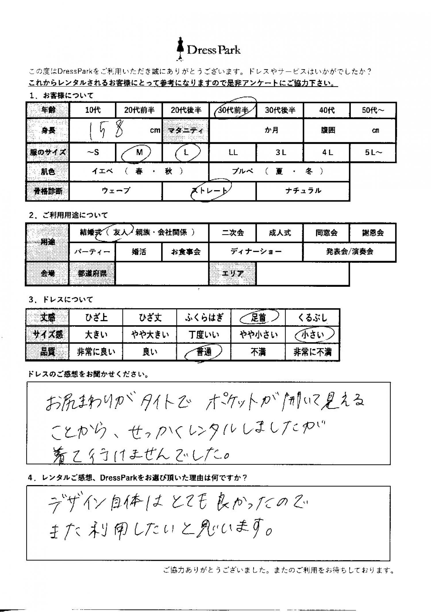 東京都 S.T様158㎝ Lサイズ #30代#M/L#155~159㎝#結婚式(友人)#東京都 ◆レンタルしたドレスはこちら ◆レンタルしたサイズは:M ◆レンタルした日付:2025/10/11 ドレスの着用感 ◆点数: (4点) ◆丈感:足首 ◆サイズ感:小さい ◆品質:普通 ◆骨格診断:ストレート ドレスの感想 お尻周りがタイトでポケットが空いて見えることから、せっかくレンタルしましたが、着ていけませんでした。デザイン自体はとても良かったので、また利用したいと思います。 CUSTOMER REVIEWS お客様の声 気になるカテゴリー別にご利用の感想をチェック! ◆AGE 年代で見る 10代 20代 30代 40代 50代~ ◆SIZE サイズで見る SS/S M/L 大きいサイズLL~ ◆HIGHT 身長で見る 140~149㎝ 150~154㎝ 155~159㎝ 160~164㎝ 165~169㎝ 170㎝以上 ◆マタニティ ~3か月 4~6か月 7~8か月 9~10か月 ◆肌色 イエベ ブルべ ◆骨格診断 ウェーブ ストレート ナチュラル ◆利用シーン 結婚式(友人) 結婚式(親族) 結婚式(会社関係) 二次会 成人式 謝恩会 パーティー その他 CUSTOMER REVIEWS都道府県別お客様の声 都道府県別にのお客様の声をチェック! 北海道 青森県 岩手県 宮城県 秋田県 山形県 福島県 茨城県 栃木県 群馬県 埼玉県 千葉県 東京都 神奈川県 新潟県 富山県 石川県 福井県 山梨県 長野県 岐阜県 静岡県 愛知県 三重県 滋賀県 京都府 大阪府 兵庫県 奈良県 和歌山県 鳥取県 島根県 岡山県 広島県 山口県 徳島県 香川県 愛媛県 高知県 福岡県 佐賀県 長崎県 熊本県 大分県 宮崎県 鹿児島県 沖縄県 CUSTOMER REVIEWSエリア別お客様の声 都道府県別にのお客様の声をチェック! 札幌 仙台 名古屋 軽井沢 金沢 神戸・芦屋 博多 那覇 梅田・新大阪 難波・心斎橋 鎌倉・湘南 横浜・みなとみらい 舞浜・浦安・幕張 大宮・浦和 青山・表参道 六本木・麻布 渋谷・恵比寿 新宿 池袋 銀座・丸の内 お台場・汐留 鹿児島市 郡山市 福島市 東予 甲府・石和 LINEでお問い合わせ このサイトではJavaScriptを使用しています