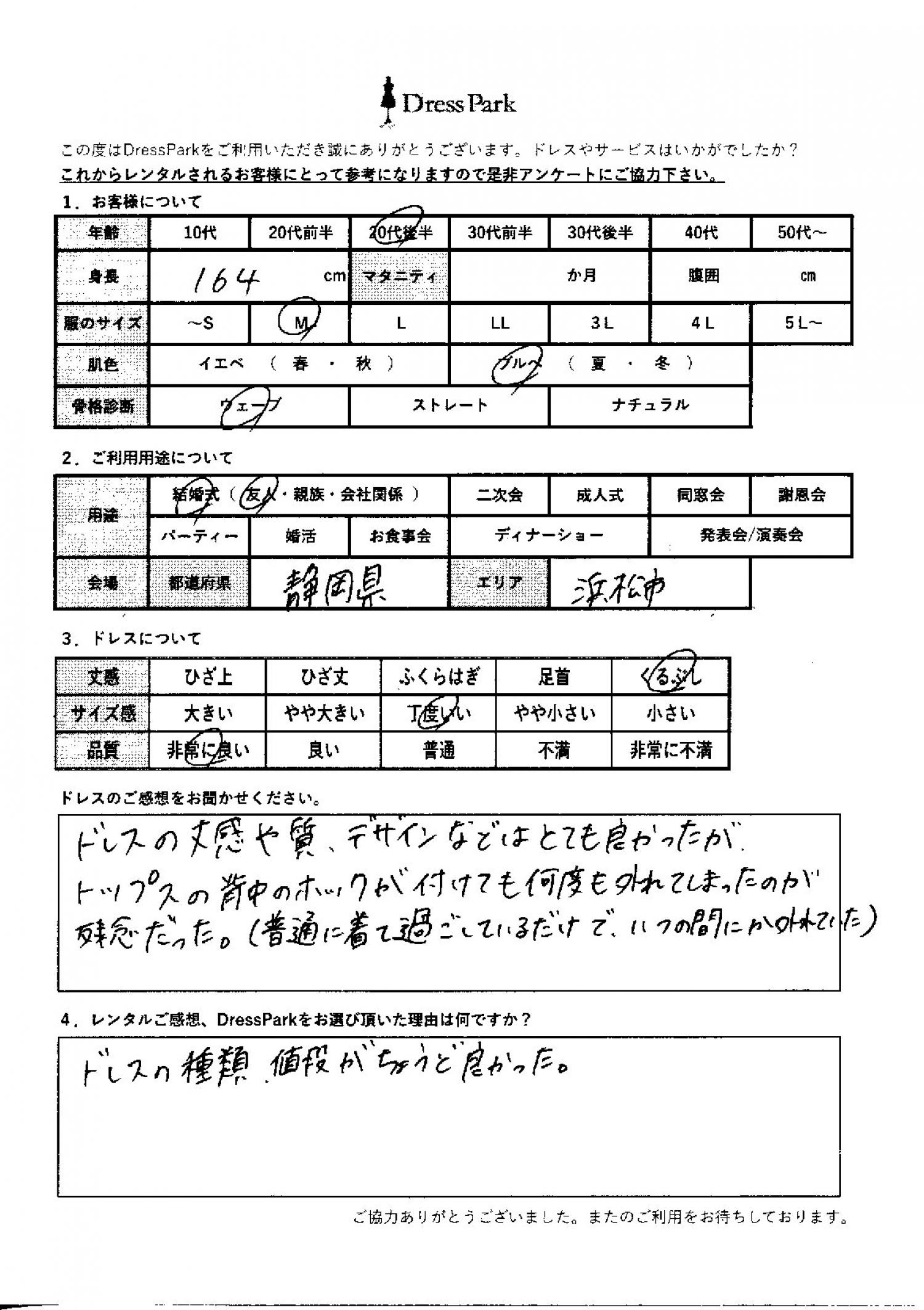 静岡県 R.S様164㎝ Mサイズ #20代#M/L#160~164㎝#結婚式(友人)#静岡県 ◆レンタルしたドレスはこちら ◆レンタルしたサイズは:M ◆レンタルした日付:2025/10/11 ドレスの着用感 ◆点数: (5点) ◆丈感:くるぶし ◆サイズ感:丁度いい ◆品質:非常に良い ◆肌色:ブルべ ◆骨格診断:ウェーブ ドレスの感想 ドレスの丈感や質、デザインなどはとても良かったが、トップスの背中のホックがつけても何度も外れてしまったのが残念だった。(普通に着て過ごしているだけで、いつの間にか外れていた。) レンタルのご感想、DressParkをお選び頂いた理由 ドレスの種類、価格がちょうど良かった。 CUSTOMER REVIEWS お客様の声 気になるカテゴリー別にご利用の感想をチェック! ◆AGE 年代で見る 10代 20代 30代 40代 50代~ ◆SIZE サイズで見る SS/S M/L 大きいサイズLL~ ◆HIGHT 身長で見る 140~149㎝ 150~154㎝ 155~159㎝ 160~164㎝ 165~169㎝ 170㎝以上 ◆マタニティ ~3か月 4~6か月 7~8か月 9~10か月 ◆肌色 イエベ ブルべ ◆骨格診断 ウェーブ ストレート ナチュラル ◆利用シーン 結婚式(友人) 結婚式(親族) 結婚式(会社関係) 二次会 成人式 謝恩会 パーティー その他 CUSTOMER REVIEWS都道府県別お客様の声 都道府県別にのお客様の声をチェック! 北海道 青森県 岩手県 宮城県 秋田県 山形県 福島県 茨城県 栃木県 群馬県 埼玉県 千葉県 東京都 神奈川県 新潟県 富山県 石川県 福井県 山梨県 長野県 岐阜県 静岡県 愛知県 三重県 滋賀県 京都府 大阪府 兵庫県 奈良県 和歌山県 鳥取県 島根県 岡山県 広島県 山口県 徳島県 香川県 愛媛県 高知県 福岡県 佐賀県 長崎県 熊本県 大分県 宮崎県 鹿児島県 沖縄県 CUSTOMER REVIEWSエリア別お客様の声 都道府県別にのお客様の声をチェック! 札幌 仙台 名古屋 軽井沢 金沢 神戸・芦屋 博多 那覇 梅田・新大阪 難波・心斎橋 鎌倉・湘南 横浜・みなとみらい 舞浜・浦安・幕張 大宮・浦和 青山・表参道 六本木・麻布 渋谷・恵比寿 新宿 池袋 銀座・丸の内 お台場・汐留 鹿児島市 郡山市 福島市 東予 甲府・石和 LINEでお問い合わせ このサイトではJavaScriptを使用しています