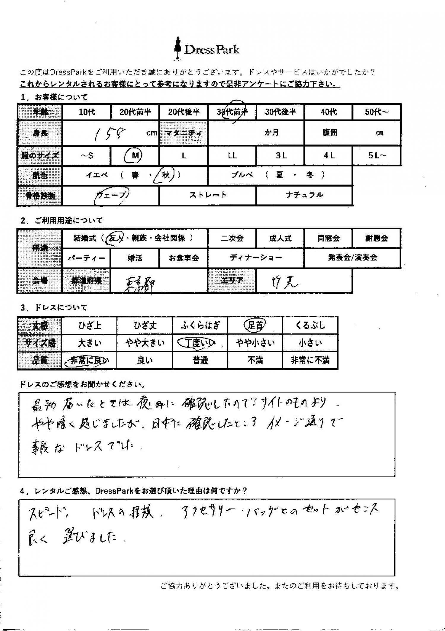 東京都 A.T様158㎝ Mサイズ #30代#M/L#155~159㎝#結婚式(友人)#東京都 ◆レンタルしたドレスはこちら ◆レンタルしたサイズは:M ◆レンタルした日付:2025/10/13 ドレスの着用感 ◆点数: (5点) ◆丈感:足首 ◆サイズ感:丁度いい ◆品質:非常に良い ◆肌色:イエベ ◆骨格診断:ウェーブ ドレスの感想 最初届いた時は夜に確認したので、サイトのものよりやや暗く感じましたが、日中に確認したところ、イメージ通りで素敵なドレスでした。 レンタルのご感想、DressParkをお選び頂いた理由 スピード、ドレスの種類、アクセサリー、バッグとのセットがセンスよく選びました。 CUSTOMER REVIEWS お客様の声 気になるカテゴリー別にご利用の感想をチェック! ◆AGE 年代で見る 10代 20代 30代 40代 50代~ ◆SIZE サイズで見る SS/S M/L 大きいサイズLL~ ◆HIGHT 身長で見る 140~149㎝ 150~154㎝ 155~159㎝ 160~164㎝ 165~169㎝ 170㎝以上 ◆マタニティ ~3か月 4~6か月 7~8か月 9~10か月 ◆肌色 イエベ ブルべ ◆骨格診断 ウェーブ ストレート ナチュラル ◆利用シーン 結婚式(友人) 結婚式(親族) 結婚式(会社関係) 二次会 成人式 謝恩会 パーティー その他 CUSTOMER REVIEWS都道府県別お客様の声 都道府県別にのお客様の声をチェック! 北海道 青森県 岩手県 宮城県 秋田県 山形県 福島県 茨城県 栃木県 群馬県 埼玉県 千葉県 東京都 神奈川県 新潟県 富山県 石川県 福井県 山梨県 長野県 岐阜県 静岡県 愛知県 三重県 滋賀県 京都府 大阪府 兵庫県 奈良県 和歌山県 鳥取県 島根県 岡山県 広島県 山口県 徳島県 香川県 愛媛県 高知県 福岡県 佐賀県 長崎県 熊本県 大分県 宮崎県 鹿児島県 沖縄県 CUSTOMER REVIEWSエリア別お客様の声 都道府県別にのお客様の声をチェック! 札幌 仙台 名古屋 軽井沢 金沢 神戸・芦屋 博多 那覇 梅田・新大阪 難波・心斎橋 鎌倉・湘南 横浜・みなとみらい 舞浜・浦安・幕張 大宮・浦和 青山・表参道 六本木・麻布 渋谷・恵比寿 新宿 池袋 銀座・丸の内 お台場・汐留 鹿児島市 郡山市 福島市 東予 甲府・石和 LINEでお問い合わせ このサイトではJavaScriptを使用しています