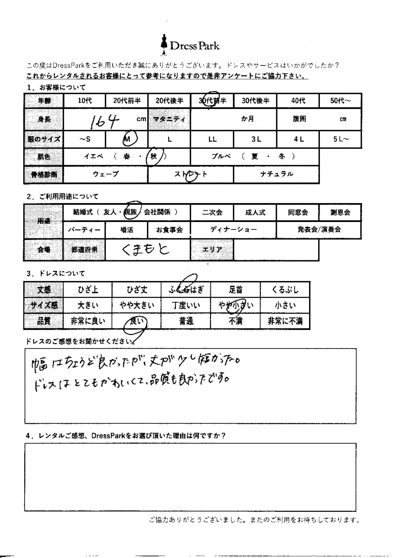 熊本県 Y.O様164㎝ Mサイズ #30代#M/L#160~164㎝#結婚式(親族)#熊本県 ◆レンタルしたドレスはこちら ◆レンタルしたサイズは:M ◆レンタルした日付:2025/10/12 ドレスの着用感 ◆点数: (4点) ◆丈感:ふくらはぎ ◆サイズ感:やや小さい ◆品質:良い ◆肌色:イエベ ◆骨格診断:ストレート ドレスの感想 幅はちょうど良かったが、丈が少し短かった。ドレスはとても可愛くて、品質も良かったです。 CUSTOMER REVIEWS お客様の声 気になるカテゴリー別にご利用の感想をチェック! ◆AGE 年代で見る 10代 20代 30代 40代 50代~ ◆SIZE サイズで見る SS/S M/L 大きいサイズLL~ ◆HIGHT 身長で見る 140~149㎝ 150~154㎝ 155~159㎝ 160~164㎝ 165~169㎝ 170㎝以上 ◆マタニティ ~3か月 4~6か月 7~8か月 9~10か月 ◆肌色 イエベ ブルべ ◆骨格診断 ウェーブ ストレート ナチュラル ◆利用シーン 結婚式(友人) 結婚式(親族) 結婚式(会社関係) 二次会 成人式 謝恩会 パーティー その他 CUSTOMER REVIEWS都道府県別お客様の声 都道府県別にのお客様の声をチェック! 北海道 青森県 岩手県 宮城県 秋田県 山形県 福島県 茨城県 栃木県 群馬県 埼玉県 千葉県 東京都 神奈川県 新潟県 富山県 石川県 福井県 山梨県 長野県 岐阜県 静岡県 愛知県 三重県 滋賀県 京都府 大阪府 兵庫県 奈良県 和歌山県 鳥取県 島根県 岡山県 広島県 山口県 徳島県 香川県 愛媛県 高知県 福岡県 佐賀県 長崎県 熊本県 大分県 宮崎県 鹿児島県 沖縄県 CUSTOMER REVIEWSエリア別お客様の声 都道府県別にのお客様の声をチェック! 札幌 仙台 名古屋 軽井沢 金沢 神戸・芦屋 博多 那覇 梅田・新大阪 難波・心斎橋 鎌倉・湘南 横浜・みなとみらい 舞浜・浦安・幕張 大宮・浦和 青山・表参道 六本木・麻布 渋谷・恵比寿 新宿 池袋 銀座・丸の内 お台場・汐留 鹿児島市 郡山市 福島市 東予 甲府・石和 LINEでお問い合わせ このサイトではJavaScriptを使用しています