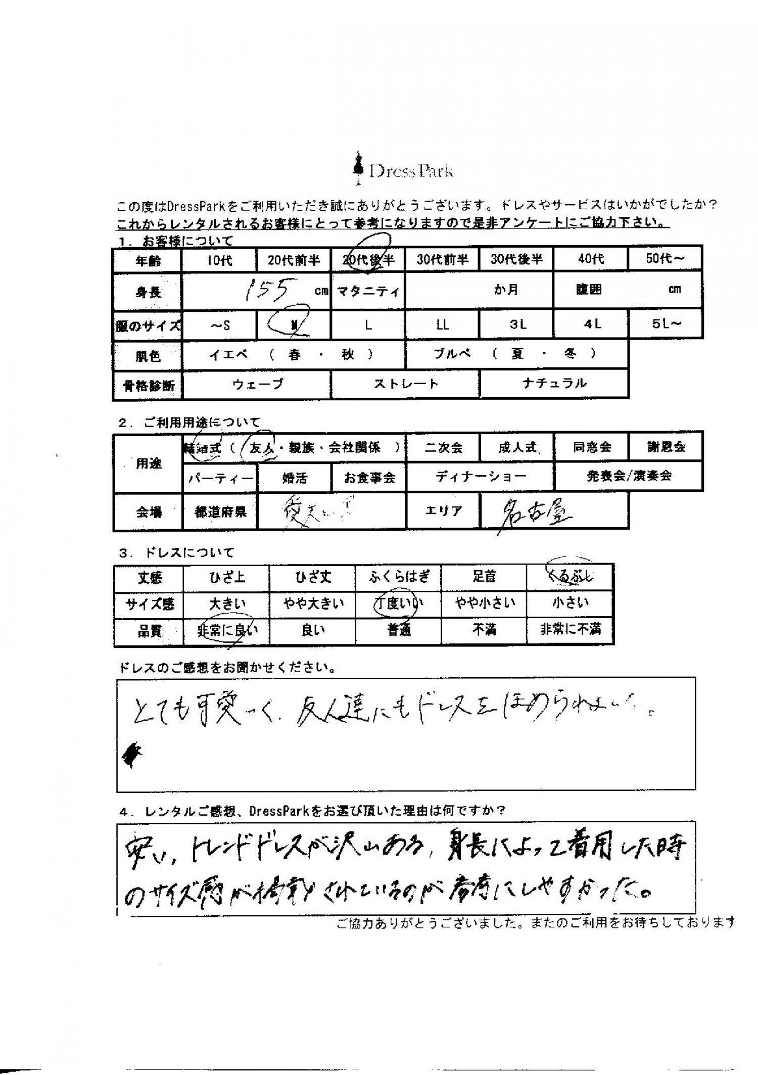 愛知県 M.M様155㎝ Mサイズ名古屋 #20代#M/L#155~159㎝#結婚式(友人)#愛知県#名古屋 ◆レンタルしたドレスはこちら ◆レンタルしたサイズは:M ◆レンタルした日付:2025/10/13 ドレスの着用感 ◆点数: (5点) ◆丈感:くるぶし ◆サイズ感:丁度いい ◆品質:非常に良い ドレスの感想 とても可愛く、友達にもドレスを褒めてもらえました。 レンタルのご感想、DressParkをお選び頂いた理由 安い、トレンドドレスがたくさんある、身長によって着用したときのサイズ感が掲載されているのが参考にしやすかった。 CUSTOMER REVIEWS お客様の声 気になるカテゴリー別にご利用の感想をチェック! ◆AGE 年代で見る 10代 20代 30代 40代 50代~ ◆SIZE サイズで見る SS/S M/L 大きいサイズLL~ ◆HIGHT 身長で見る 140~149㎝ 150~154㎝ 155~159㎝ 160~164㎝ 165~169㎝ 170㎝以上 ◆マタニティ ~3か月 4~6か月 7~8か月 9~10か月 ◆肌色 イエベ ブルべ ◆骨格診断 ウェーブ ストレート ナチュラル ◆利用シーン 結婚式(友人) 結婚式(親族) 結婚式(会社関係) 二次会 成人式 謝恩会 パーティー その他 CUSTOMER REVIEWS都道府県別お客様の声 都道府県別にのお客様の声をチェック! 北海道 青森県 岩手県 宮城県 秋田県 山形県 福島県 茨城県 栃木県 群馬県 埼玉県 千葉県 東京都 神奈川県 新潟県 富山県 石川県 福井県 山梨県 長野県 岐阜県 静岡県 愛知県 三重県 滋賀県 京都府 大阪府 兵庫県 奈良県 和歌山県 鳥取県 島根県 岡山県 広島県 山口県 徳島県 香川県 愛媛県 高知県 福岡県 佐賀県 長崎県 熊本県 大分県 宮崎県 鹿児島県 沖縄県 CUSTOMER REVIEWSエリア別お客様の声 都道府県別にのお客様の声をチェック! 札幌 仙台 名古屋 軽井沢 金沢 神戸・芦屋 博多 那覇 梅田・新大阪 難波・心斎橋 鎌倉・湘南 横浜・みなとみらい 舞浜・浦安・幕張 大宮・浦和 青山・表参道 六本木・麻布 渋谷・恵比寿 新宿 池袋 銀座・丸の内 お台場・汐留 鹿児島市 郡山市 福島市 東予 甲府・石和 LINEでお問い合わせ このサイトではJavaScriptを使用しています