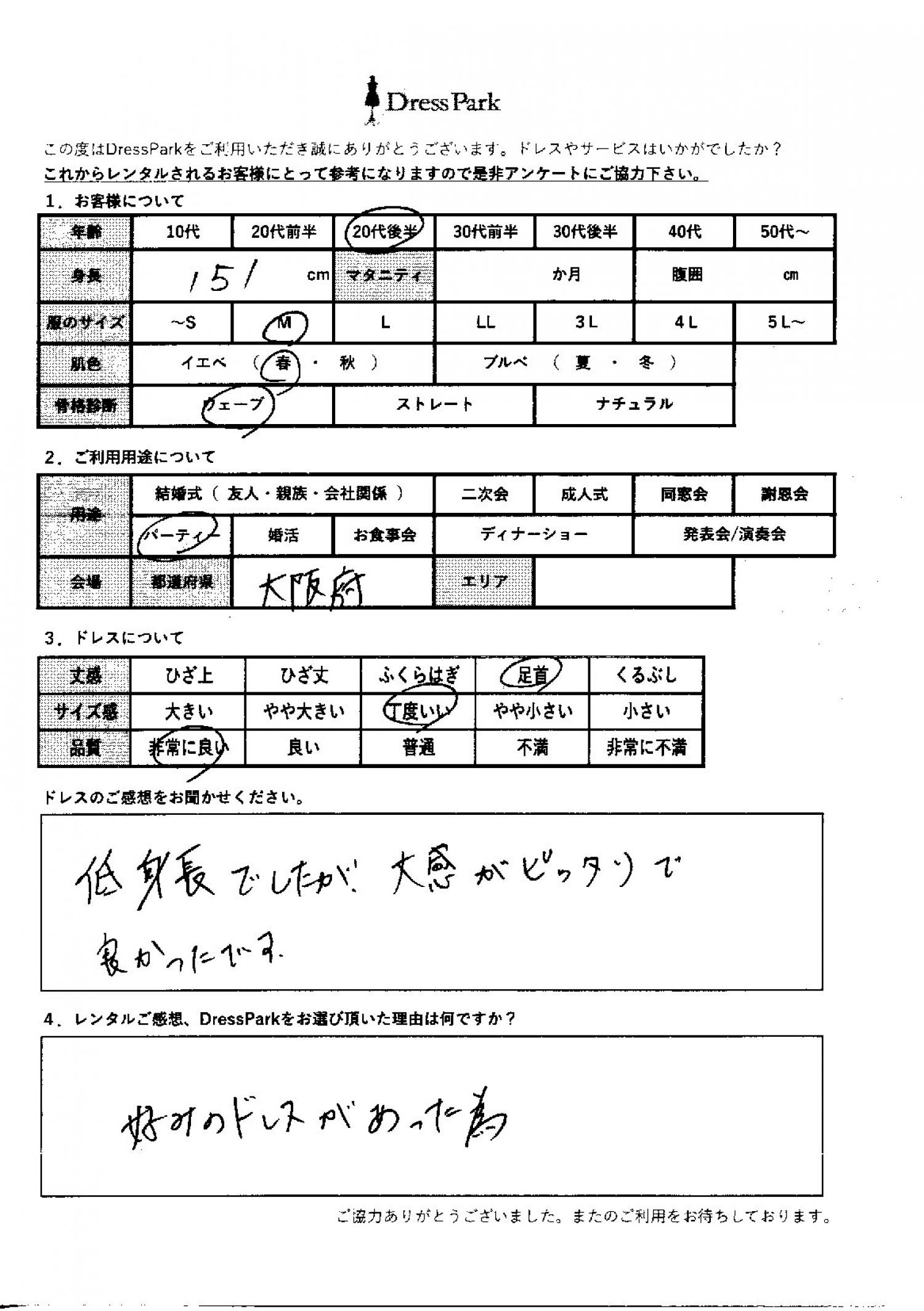 大阪府 A.T様151㎝ Mサイズ #20代#M/L#150~154㎝#パーティー#大阪府 ◆レンタルしたドレスはこちら ◆レンタルしたサイズは:M ◆レンタルした日付:2025/10/13 ドレスの着用感 ◆点数: (5点) ◆丈感:足首 ◆サイズ感:丁度いい ◆品質:非常に良い ◆肌色:イエベ ◆骨格診断:ウェーブ ドレスの感想 低身長でしたが、丈感がぴったりで良かったです。 レンタルのご感想、DressParkをお選び頂いた理由 好みのドレスがあったため。 CUSTOMER REVIEWS お客様の声 気になるカテゴリー別にご利用の感想をチェック! ◆AGE 年代で見る 10代 20代 30代 40代 50代~ ◆SIZE サイズで見る SS/S M/L 大きいサイズLL~ ◆HIGHT 身長で見る 140~149㎝ 150~154㎝ 155~159㎝ 160~164㎝ 165~169㎝ 170㎝以上 ◆マタニティ ~3か月 4~6か月 7~8か月 9~10か月 ◆肌色 イエベ ブルべ ◆骨格診断 ウェーブ ストレート ナチュラル ◆利用シーン 結婚式(友人) 結婚式(親族) 結婚式(会社関係) 二次会 成人式 謝恩会 パーティー その他 CUSTOMER REVIEWS都道府県別お客様の声 都道府県別にのお客様の声をチェック! 北海道 青森県 岩手県 宮城県 秋田県 山形県 福島県 茨城県 栃木県 群馬県 埼玉県 千葉県 東京都 神奈川県 新潟県 富山県 石川県 福井県 山梨県 長野県 岐阜県 静岡県 愛知県 三重県 滋賀県 京都府 大阪府 兵庫県 奈良県 和歌山県 鳥取県 島根県 岡山県 広島県 山口県 徳島県 香川県 愛媛県 高知県 福岡県 佐賀県 長崎県 熊本県 大分県 宮崎県 鹿児島県 沖縄県 CUSTOMER REVIEWSエリア別お客様の声 都道府県別にのお客様の声をチェック! 札幌 仙台 名古屋 軽井沢 金沢 神戸・芦屋 博多 那覇 梅田・新大阪 難波・心斎橋 鎌倉・湘南 横浜・みなとみらい 舞浜・浦安・幕張 大宮・浦和 青山・表参道 六本木・麻布 渋谷・恵比寿 新宿 池袋 銀座・丸の内 お台場・汐留 鹿児島市 郡山市 福島市 東予 甲府・石和 LINEでお問い合わせ このサイトではJavaScriptを使用しています