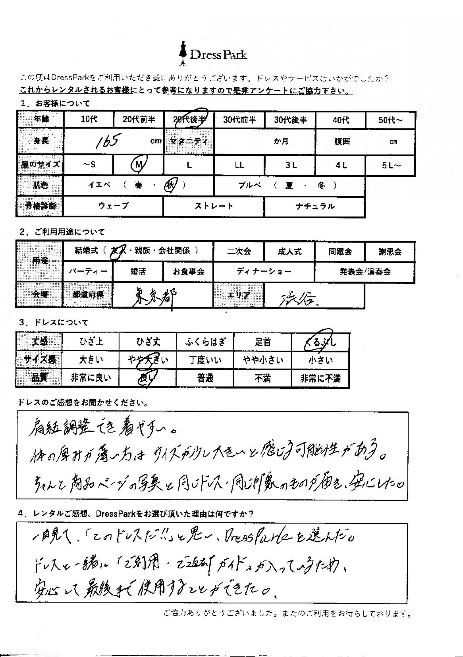 東京都 K.S様165㎝ Mサイズ渋谷・恵比寿 #20代#M/L#165~169㎝#結婚式(友人)#東京都#渋谷・恵比寿 ◆レンタルしたドレスはこちら ◆レンタルしたサイズは:M ◆レンタルした日付:2025/10/12 ドレスの着用感 ◆点数: (4点) ◆丈感:くるぶし ◆サイズ感:やや大きい ◆品質:良い ◆肌色:イエベ ドレスの感想 肩紐も調節でき着やすい。体の厚みが薄い方は、サイズが少し大きいと感じる可能性がある。ちゃんと商品ページの写真と同じドレス、同じ印象のものが届き安心した。 レンタルのご感想、DressParkをお選び頂いた理由 ひと目見て「このドレスだ!」と思いドレスパークを選んだ。ドレスと一緒に「ご利用ご返却ガイド」が入っているため、安心して最後まで使用することができた。 CUSTOMER REVIEWS お客様の声 気になるカテゴリー別にご利用の感想をチェック! ◆AGE 年代で見る 10代 20代 30代 40代 50代~ ◆SIZE サイズで見る SS/S M/L 大きいサイズLL~ ◆HIGHT 身長で見る 140~149㎝ 150~154㎝ 155~159㎝ 160~164㎝ 165~169㎝ 170㎝以上 ◆マタニティ ~3か月 4~6か月 7~8か月 9~10か月 ◆肌色 イエベ ブルべ ◆骨格診断 ウェーブ ストレート ナチュラル ◆利用シーン 結婚式(友人) 結婚式(親族) 結婚式(会社関係) 二次会 成人式 謝恩会 パーティー その他 CUSTOMER REVIEWS都道府県別お客様の声 都道府県別にのお客様の声をチェック! 北海道 青森県 岩手県 宮城県 秋田県 山形県 福島県 茨城県 栃木県 群馬県 埼玉県 千葉県 東京都 神奈川県 新潟県 富山県 石川県 福井県 山梨県 長野県 岐阜県 静岡県 愛知県 三重県 滋賀県 京都府 大阪府 兵庫県 奈良県 和歌山県 鳥取県 島根県 岡山県 広島県 山口県 徳島県 香川県 愛媛県 高知県 福岡県 佐賀県 長崎県 熊本県 大分県 宮崎県 鹿児島県 沖縄県 CUSTOMER REVIEWSエリア別お客様の声 都道府県別にのお客様の声をチェック! 札幌 仙台 名古屋 軽井沢 金沢 神戸・芦屋 博多 那覇 梅田・新大阪 難波・心斎橋 鎌倉・湘南 横浜・みなとみらい 舞浜・浦安・幕張 大宮・浦和 青山・表参道 六本木・麻布 渋谷・恵比寿 新宿 池袋 銀座・丸の内 お台場・汐留 鹿児島市 郡山市 福島市 東予 甲府・石和 LINEでお問い合わせ このサイトではJavaScriptを使用しています
