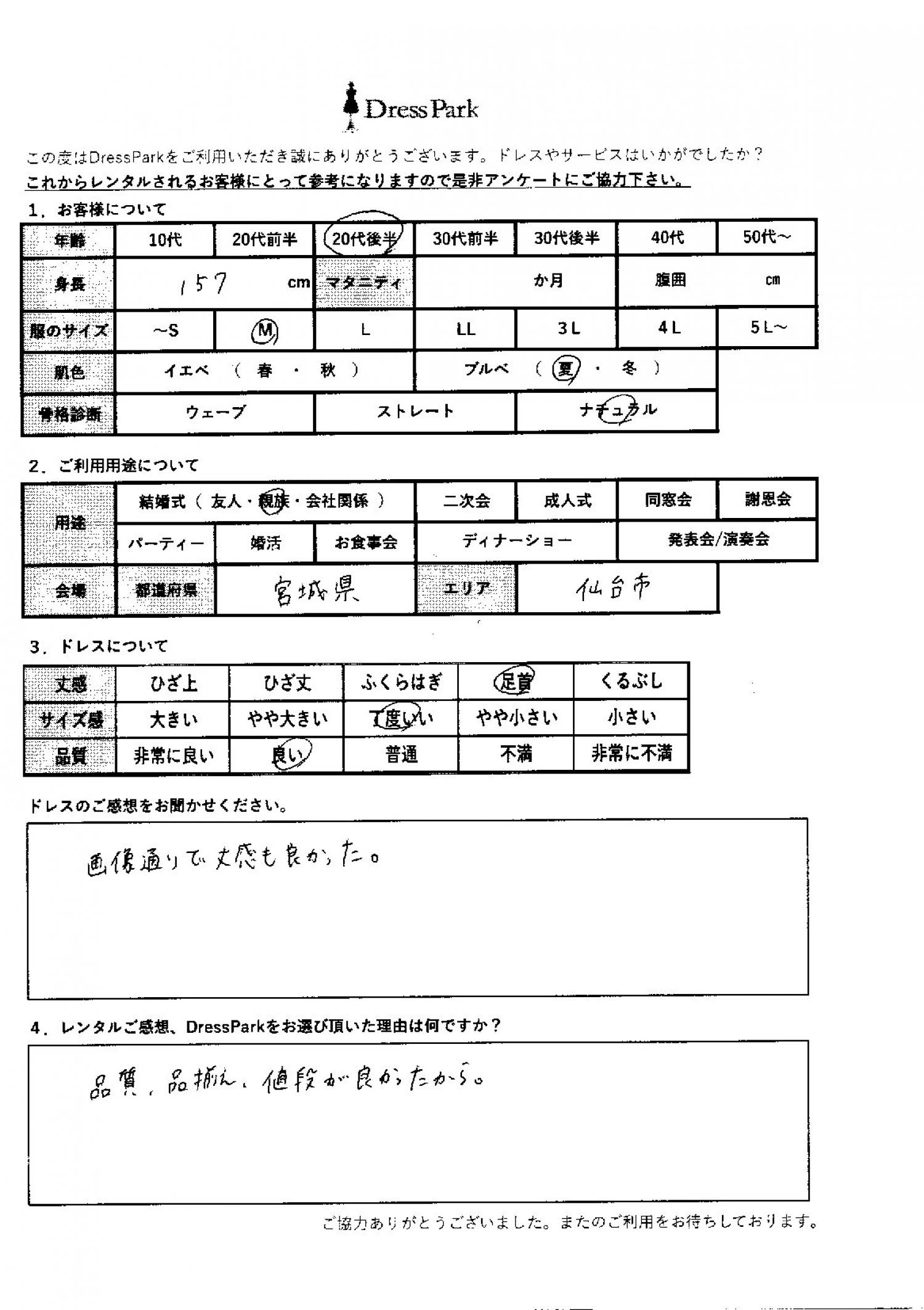 宮城県 E.W様157㎝ Mサイズ仙台 #20代#M/L#155~159㎝#結婚式(親族)#宮城県#仙台 ◆レンタルしたドレスはこちら ◆レンタルしたサイズは:M ◆レンタルした日付:2025/10/12 ドレスの着用感 ◆点数: (4点) ◆丈感:足首 ◆サイズ感:丁度いい ◆品質:良い ◆肌色:ブルべ ◆骨格診断:ナチュラル ドレスの感想 画像通りで丈感も良かった。 レンタルのご感想、DressParkをお選び頂いた理由 品質、品揃え、値段が良かったから。 CUSTOMER REVIEWS お客様の声 気になるカテゴリー別にご利用の感想をチェック! ◆AGE 年代で見る 10代 20代 30代 40代 50代~ ◆SIZE サイズで見る SS/S M/L 大きいサイズLL~ ◆HIGHT 身長で見る 140~149㎝ 150~154㎝ 155~159㎝ 160~164㎝ 165~169㎝ 170㎝以上 ◆マタニティ ~3か月 4~6か月 7~8か月 9~10か月 ◆肌色 イエベ ブルべ ◆骨格診断 ウェーブ ストレート ナチュラル ◆利用シーン 結婚式(友人) 結婚式(親族) 結婚式(会社関係) 二次会 成人式 謝恩会 パーティー その他 CUSTOMER REVIEWS都道府県別お客様の声 都道府県別にのお客様の声をチェック! 北海道 青森県 岩手県 宮城県 秋田県 山形県 福島県 茨城県 栃木県 群馬県 埼玉県 千葉県 東京都 神奈川県 新潟県 富山県 石川県 福井県 山梨県 長野県 岐阜県 静岡県 愛知県 三重県 滋賀県 京都府 大阪府 兵庫県 奈良県 和歌山県 鳥取県 島根県 岡山県 広島県 山口県 徳島県 香川県 愛媛県 高知県 福岡県 佐賀県 長崎県 熊本県 大分県 宮崎県 鹿児島県 沖縄県 CUSTOMER REVIEWSエリア別お客様の声 都道府県別にのお客様の声をチェック! 札幌 仙台 名古屋 軽井沢 金沢 神戸・芦屋 博多 那覇 梅田・新大阪 難波・心斎橋 鎌倉・湘南 横浜・みなとみらい 舞浜・浦安・幕張 大宮・浦和 青山・表参道 六本木・麻布 渋谷・恵比寿 新宿 池袋 銀座・丸の内 お台場・汐留 鹿児島市 郡山市 福島市 東予 甲府・石和 LINEでお問い合わせ このサイトではJavaScriptを使用しています