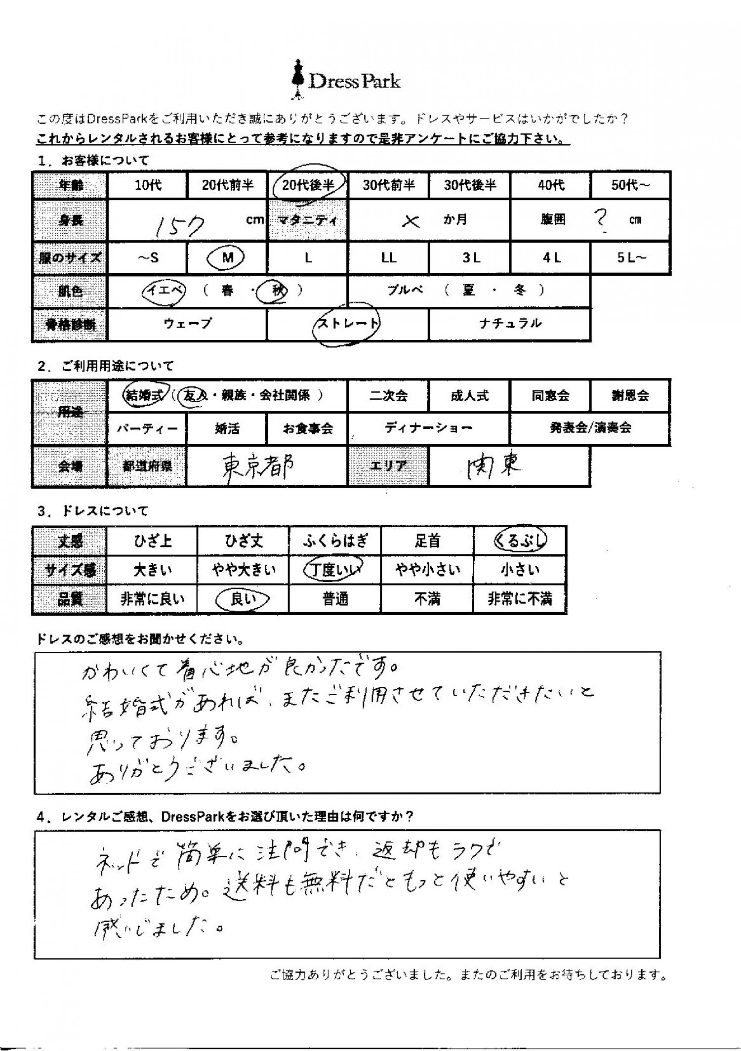 東京都 H.K様157㎝ Mサイズ #20代#M/L#155~159㎝#結婚式(友人)#東京都 ◆レンタルしたドレスはこちら ◆レンタルしたサイズは:M ◆レンタルした日付:2025/10/13 ドレスの着用感 ◆点数: (4点) ◆丈感:くるぶし ◆サイズ感:丁度いい ◆品質:良い ◆肌色:イエベ ◆骨格診断:ストレート ドレスの感想 可愛くて着心地が良かったです。結婚式があればまた利用させていただきたいと思っております。ありがとうございました。 レンタルのご感想、DressParkをお選び頂いた理由 ネットで簡単に注文でき、返却も楽であったため。返却送料も無料だともっと使いやすいと感じました。 CUSTOMER REVIEWS お客様の声 気になるカテゴリー別にご利用の感想をチェック! ◆AGE 年代で見る 10代 20代 30代 40代 50代~ ◆SIZE サイズで見る SS/S M/L 大きいサイズLL~ ◆HIGHT 身長で見る 140~149㎝ 150~154㎝ 155~159㎝ 160~164㎝ 165~169㎝ 170㎝以上 ◆マタニティ ~3か月 4~6か月 7~8か月 9~10か月 ◆肌色 イエベ ブルべ ◆骨格診断 ウェーブ ストレート ナチュラル ◆利用シーン 結婚式(友人) 結婚式(親族) 結婚式(会社関係) 二次会 成人式 謝恩会 パーティー その他 CUSTOMER REVIEWS都道府県別お客様の声 都道府県別にのお客様の声をチェック! 北海道 青森県 岩手県 宮城県 秋田県 山形県 福島県 茨城県 栃木県 群馬県 埼玉県 千葉県 東京都 神奈川県 新潟県 富山県 石川県 福井県 山梨県 長野県 岐阜県 静岡県 愛知県 三重県 滋賀県 京都府 大阪府 兵庫県 奈良県 和歌山県 鳥取県 島根県 岡山県 広島県 山口県 徳島県 香川県 愛媛県 高知県 福岡県 佐賀県 長崎県 熊本県 大分県 宮崎県 鹿児島県 沖縄県 CUSTOMER REVIEWSエリア別お客様の声 都道府県別にのお客様の声をチェック! 札幌 仙台 名古屋 軽井沢 金沢 神戸・芦屋 博多 那覇 梅田・新大阪 難波・心斎橋 鎌倉・湘南 横浜・みなとみらい 舞浜・浦安・幕張 大宮・浦和 青山・表参道 六本木・麻布 渋谷・恵比寿 新宿 池袋 銀座・丸の内 お台場・汐留 鹿児島市 郡山市 福島市 東予 甲府・石和 LINEでお問い合わせ このサイトではJavaScriptを使用しています