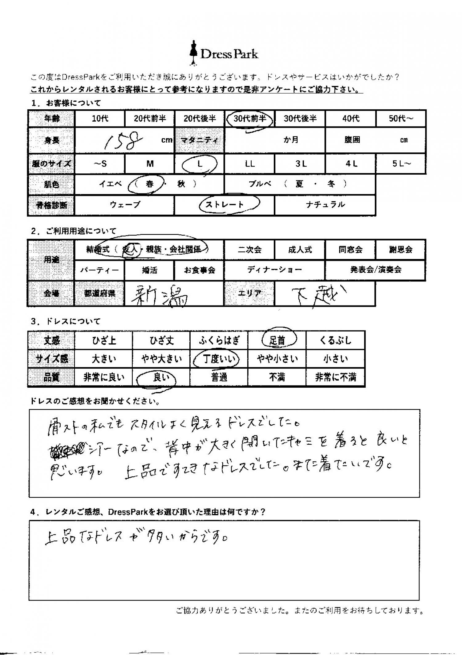 新潟県 F.S様158㎝ Lサイズ #30代#M/L#155~159㎝#結婚式(友人)#新潟県 ◆レンタルしたドレスはこちら ◆レンタルしたサイズは:L ◆レンタルした日付:2025/10/12 ドレスの着用感 ◆点数: (4点) ◆丈感:足首 ◆サイズ感:丁度いい ◆品質:良い ◆肌色:イエベ ◆骨格診断:ストレート ドレスの感想 骨格ストレートの私でもスタイルよく見えるドレスでした。シアなので、背中が大きく開いたキャミを着るといいと思います。上品で素敵なドレスでした。また着たいです。 レンタルのご感想、DressParkをお選び頂いた理由 上品なドレスが多いからです。 CUSTOMER REVIEWS お客様の声 気になるカテゴリー別にご利用の感想をチェック! ◆AGE 年代で見る 10代 20代 30代 40代 50代~ ◆SIZE サイズで見る SS/S M/L 大きいサイズLL~ ◆HIGHT 身長で見る 140~149㎝ 150~154㎝ 155~159㎝ 160~164㎝ 165~169㎝ 170㎝以上 ◆マタニティ ~3か月 4~6か月 7~8か月 9~10か月 ◆肌色 イエベ ブルべ ◆骨格診断 ウェーブ ストレート ナチュラル ◆利用シーン 結婚式(友人) 結婚式(親族) 結婚式(会社関係) 二次会 成人式 謝恩会 パーティー その他 CUSTOMER REVIEWS都道府県別お客様の声 都道府県別にのお客様の声をチェック! 北海道 青森県 岩手県 宮城県 秋田県 山形県 福島県 茨城県 栃木県 群馬県 埼玉県 千葉県 東京都 神奈川県 新潟県 富山県 石川県 福井県 山梨県 長野県 岐阜県 静岡県 愛知県 三重県 滋賀県 京都府 大阪府 兵庫県 奈良県 和歌山県 鳥取県 島根県 岡山県 広島県 山口県 徳島県 香川県 愛媛県 高知県 福岡県 佐賀県 長崎県 熊本県 大分県 宮崎県 鹿児島県 沖縄県 CUSTOMER REVIEWSエリア別お客様の声 都道府県別にのお客様の声をチェック! 札幌 仙台 名古屋 軽井沢 金沢 神戸・芦屋 博多 那覇 梅田・新大阪 難波・心斎橋 鎌倉・湘南 横浜・みなとみらい 舞浜・浦安・幕張 大宮・浦和 青山・表参道 六本木・麻布 渋谷・恵比寿 新宿 池袋 銀座・丸の内 お台場・汐留 鹿児島市 郡山市 福島市 東予 甲府・石和 LINEでお問い合わせ このサイトではJavaScriptを使用しています