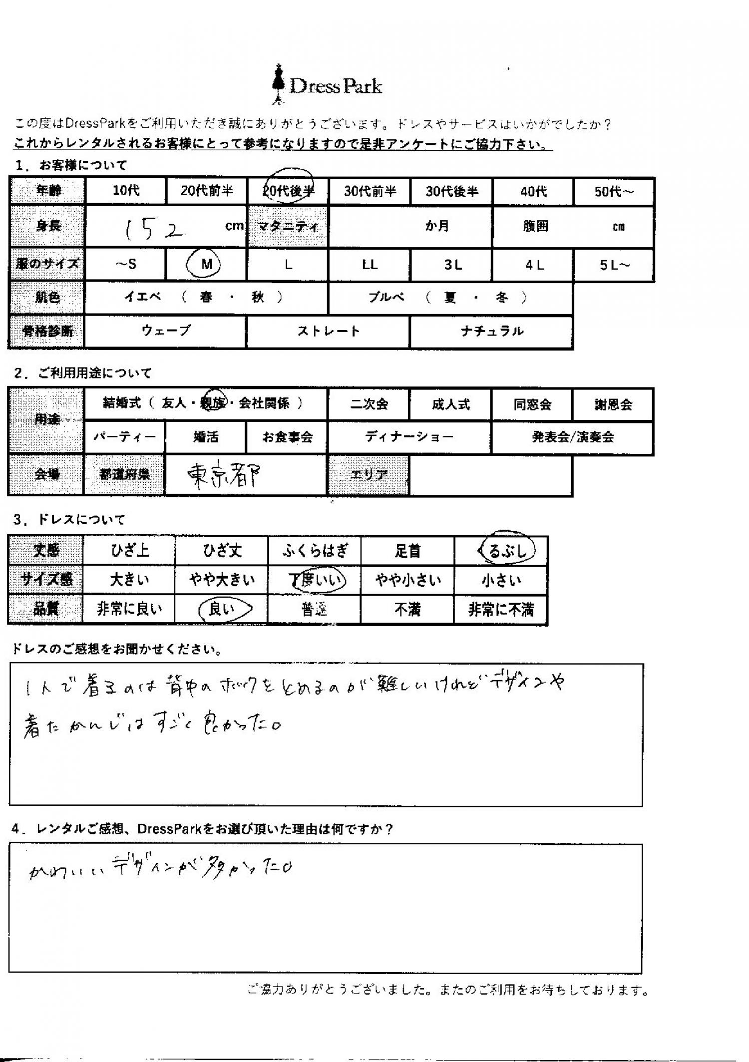 東京都 S.S様152㎝ Mサイズ #20代#M/L#150~154㎝#結婚式(親族)#東京都 ◆レンタルしたドレスはこちら ◆レンタルしたサイズは:M ◆レンタルした日付:2025/10/12 ドレスの着用感 ◆点数: (4点) ◆丈感:くるぶし ◆サイズ感:丁度いい ◆品質:良い ドレスの感想 1人で着るのは背中のホックを止めるのが難しいけれど、デザインや着た感じはすごく良かった。 レンタルのご感想、DressParkをお選び頂いた理由 かわいいデザインが多かった。 CUSTOMER REVIEWS お客様の声 気になるカテゴリー別にご利用の感想をチェック! ◆AGE 年代で見る 10代 20代 30代 40代 50代~ ◆SIZE サイズで見る SS/S M/L 大きいサイズLL~ ◆HIGHT 身長で見る 140~149㎝ 150~154㎝ 155~159㎝ 160~164㎝ 165~169㎝ 170㎝以上 ◆マタニティ ~3か月 4~6か月 7~8か月 9~10か月 ◆肌色 イエベ ブルべ ◆骨格診断 ウェーブ ストレート ナチュラル ◆利用シーン 結婚式(友人) 結婚式(親族) 結婚式(会社関係) 二次会 成人式 謝恩会 パーティー その他 CUSTOMER REVIEWS都道府県別お客様の声 都道府県別にのお客様の声をチェック! 北海道 青森県 岩手県 宮城県 秋田県 山形県 福島県 茨城県 栃木県 群馬県 埼玉県 千葉県 東京都 神奈川県 新潟県 富山県 石川県 福井県 山梨県 長野県 岐阜県 静岡県 愛知県 三重県 滋賀県 京都府 大阪府 兵庫県 奈良県 和歌山県 鳥取県 島根県 岡山県 広島県 山口県 徳島県 香川県 愛媛県 高知県 福岡県 佐賀県 長崎県 熊本県 大分県 宮崎県 鹿児島県 沖縄県 CUSTOMER REVIEWSエリア別お客様の声 都道府県別にのお客様の声をチェック! 札幌 仙台 名古屋 軽井沢 金沢 神戸・芦屋 博多 那覇 梅田・新大阪 難波・心斎橋 鎌倉・湘南 横浜・みなとみらい 舞浜・浦安・幕張 大宮・浦和 青山・表参道 六本木・麻布 渋谷・恵比寿 新宿 池袋 銀座・丸の内 お台場・汐留 鹿児島市 郡山市 福島市 東予 甲府・石和 LINEでお問い合わせ このサイトではJavaScriptを使用しています