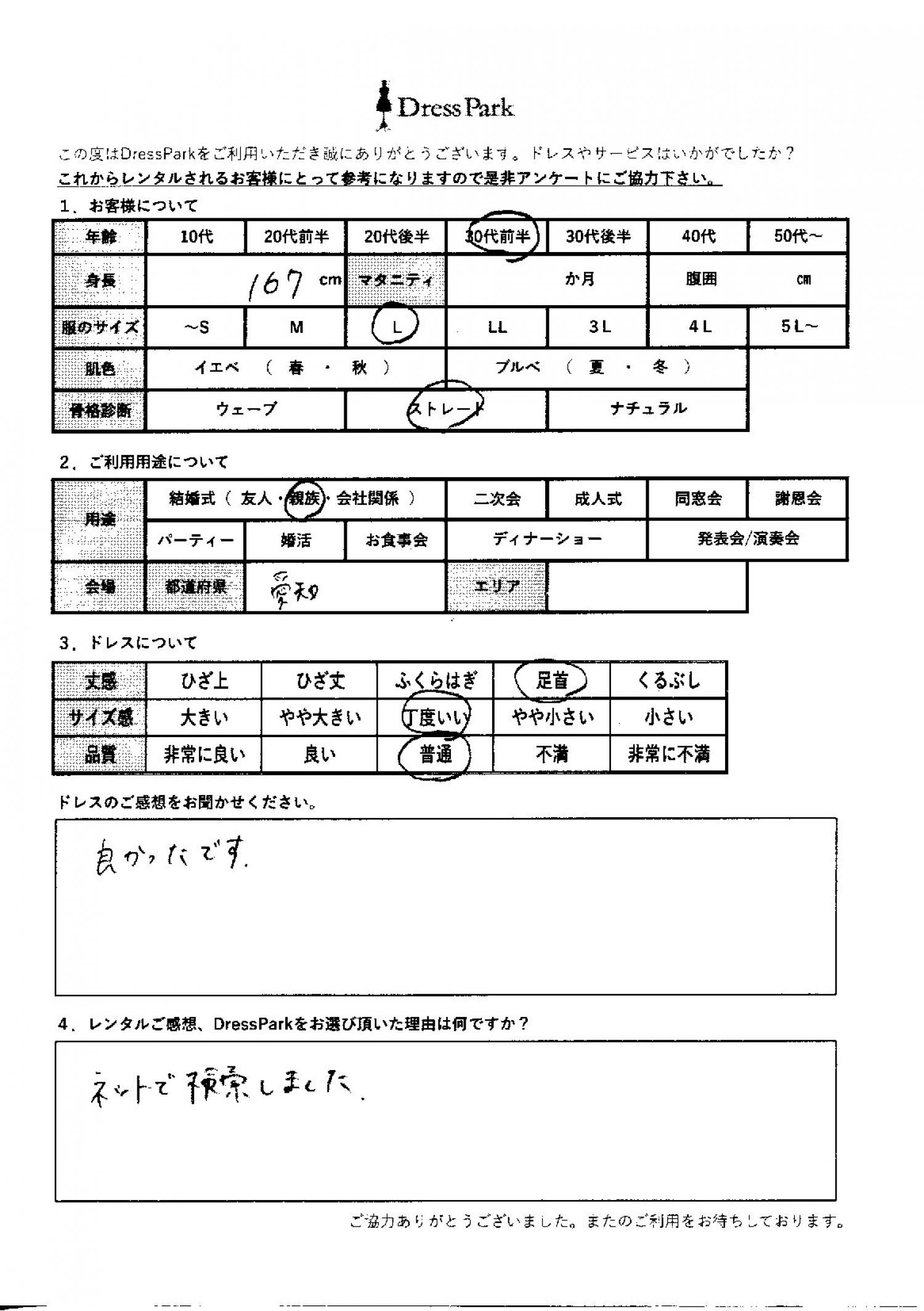 愛知県 Y.H様167㎝ Lサイズ #30代#M/L#165~169㎝#結婚式(親族)#愛知県 ◆レンタルしたドレスはこちら ◆レンタルしたサイズは:L ◆レンタルした日付:2025/10/12 ドレスの着用感 ◆点数: (4点) ◆丈感:足首 ◆サイズ感:丁度いい ◆品質:普通 ◆骨格診断:ストレート ドレスの感想 よかったです。 レンタルのご感想、DressParkをお選び頂いた理由 ネットで検索しました。 CUSTOMER REVIEWS お客様の声 気になるカテゴリー別にご利用の感想をチェック! ◆AGE 年代で見る 10代 20代 30代 40代 50代~ ◆SIZE サイズで見る SS/S M/L 大きいサイズLL~ ◆HIGHT 身長で見る 140~149㎝ 150~154㎝ 155~159㎝ 160~164㎝ 165~169㎝ 170㎝以上 ◆マタニティ ~3か月 4~6か月 7~8か月 9~10か月 ◆肌色 イエベ ブルべ ◆骨格診断 ウェーブ ストレート ナチュラル ◆利用シーン 結婚式(友人) 結婚式(親族) 結婚式(会社関係) 二次会 成人式 謝恩会 パーティー その他 CUSTOMER REVIEWS都道府県別お客様の声 都道府県別にのお客様の声をチェック! 北海道 青森県 岩手県 宮城県 秋田県 山形県 福島県 茨城県 栃木県 群馬県 埼玉県 千葉県 東京都 神奈川県 新潟県 富山県 石川県 福井県 山梨県 長野県 岐阜県 静岡県 愛知県 三重県 滋賀県 京都府 大阪府 兵庫県 奈良県 和歌山県 鳥取県 島根県 岡山県 広島県 山口県 徳島県 香川県 愛媛県 高知県 福岡県 佐賀県 長崎県 熊本県 大分県 宮崎県 鹿児島県 沖縄県 CUSTOMER REVIEWSエリア別お客様の声 都道府県別にのお客様の声をチェック! 札幌 仙台 名古屋 軽井沢 金沢 神戸・芦屋 博多 那覇 梅田・新大阪 難波・心斎橋 鎌倉・湘南 横浜・みなとみらい 舞浜・浦安・幕張 大宮・浦和 青山・表参道 六本木・麻布 渋谷・恵比寿 新宿 池袋 銀座・丸の内 お台場・汐留 鹿児島市 郡山市 福島市 東予 甲府・石和 LINEでお問い合わせ このサイトではJavaScriptを使用しています