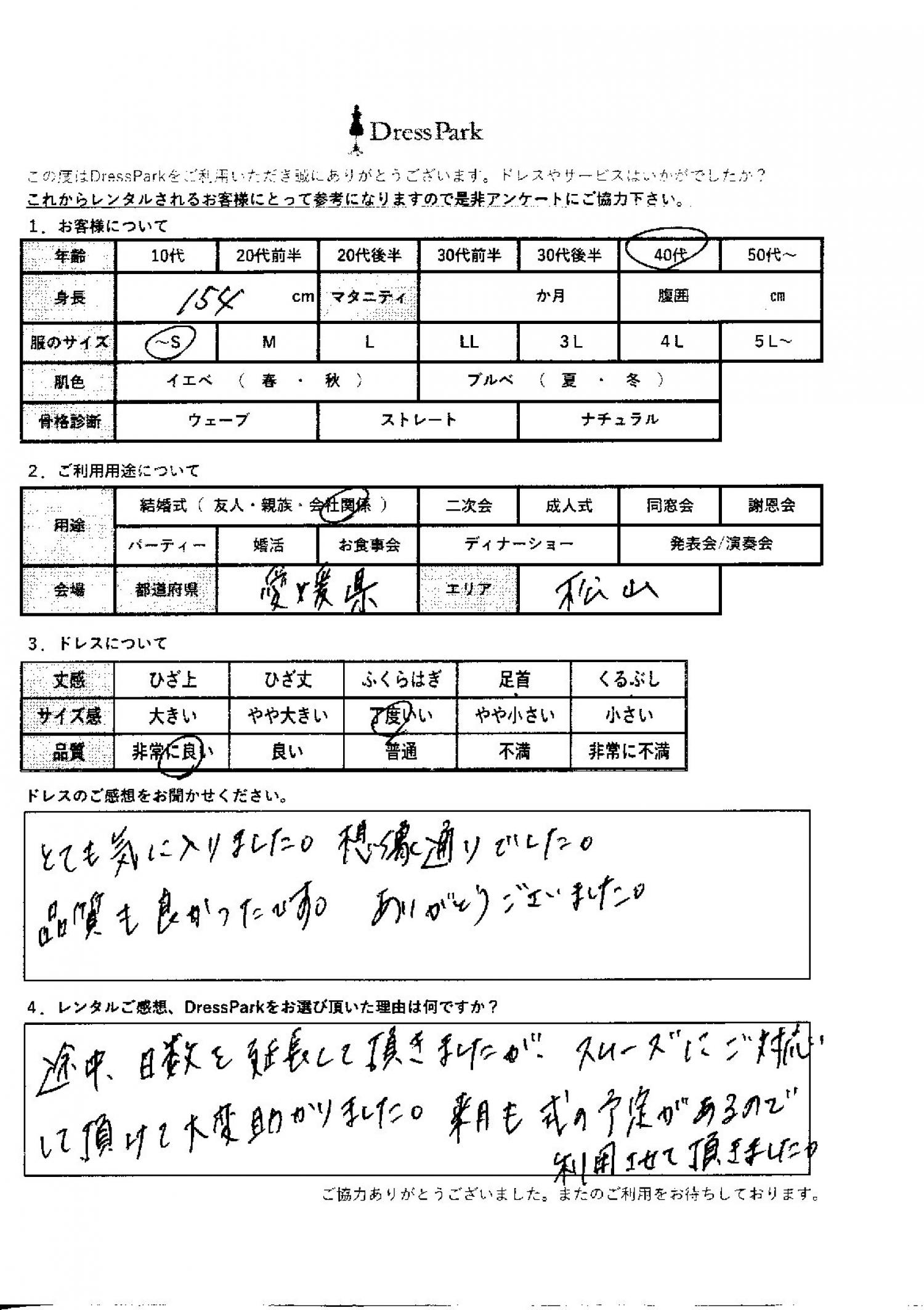 愛媛県 S.K様154㎝ ~Sサイズ #40代#SS/S#150~154㎝#結婚式(会社関係)#愛媛県 ◆レンタルしたドレスはこちら ◆レンタルしたサイズは:M ◆レンタルした日付:2025/10/11 ドレスの着用感 ◆点数: (5点) ◆丈感:足首 ◆サイズ感:丁度いい ◆品質:非常に良い ドレスの感想 とても気に入りました。想像通りでした。品質も良かったです。ありがとうございました。 レンタルのご感想、DressParkをお選び頂いた理由 途中日数を延長していただきましたが、スムーズにご対応していただけて大変助かりました。来月も式の予定があるので、利用させていただきました。 CUSTOMER REVIEWS お客様の声 気になるカテゴリー別にご利用の感想をチェック! ◆AGE 年代で見る 10代 20代 30代 40代 50代~ ◆SIZE サイズで見る SS/S M/L 大きいサイズLL~ ◆HIGHT 身長で見る 140~149㎝ 150~154㎝ 155~159㎝ 160~164㎝ 165~169㎝ 170㎝以上 ◆マタニティ ~3か月 4~6か月 7~8か月 9~10か月 ◆肌色 イエベ ブルべ ◆骨格診断 ウェーブ ストレート ナチュラル ◆利用シーン 結婚式(友人) 結婚式(親族) 結婚式(会社関係) 二次会 成人式 謝恩会 パーティー その他 CUSTOMER REVIEWS都道府県別お客様の声 都道府県別にのお客様の声をチェック! 北海道 青森県 岩手県 宮城県 秋田県 山形県 福島県 茨城県 栃木県 群馬県 埼玉県 千葉県 東京都 神奈川県 新潟県 富山県 石川県 福井県 山梨県 長野県 岐阜県 静岡県 愛知県 三重県 滋賀県 京都府 大阪府 兵庫県 奈良県 和歌山県 鳥取県 島根県 岡山県 広島県 山口県 徳島県 香川県 愛媛県 高知県 福岡県 佐賀県 長崎県 熊本県 大分県 宮崎県 鹿児島県 沖縄県 CUSTOMER REVIEWSエリア別お客様の声 都道府県別にのお客様の声をチェック! 札幌 仙台 名古屋 軽井沢 金沢 神戸・芦屋 博多 那覇 梅田・新大阪 難波・心斎橋 鎌倉・湘南 横浜・みなとみらい 舞浜・浦安・幕張 大宮・浦和 青山・表参道 六本木・麻布 渋谷・恵比寿 新宿 池袋 銀座・丸の内 お台場・汐留 鹿児島市 郡山市 福島市 東予 甲府・石和 LINEでお問い合わせ このサイトではJavaScriptを使用しています