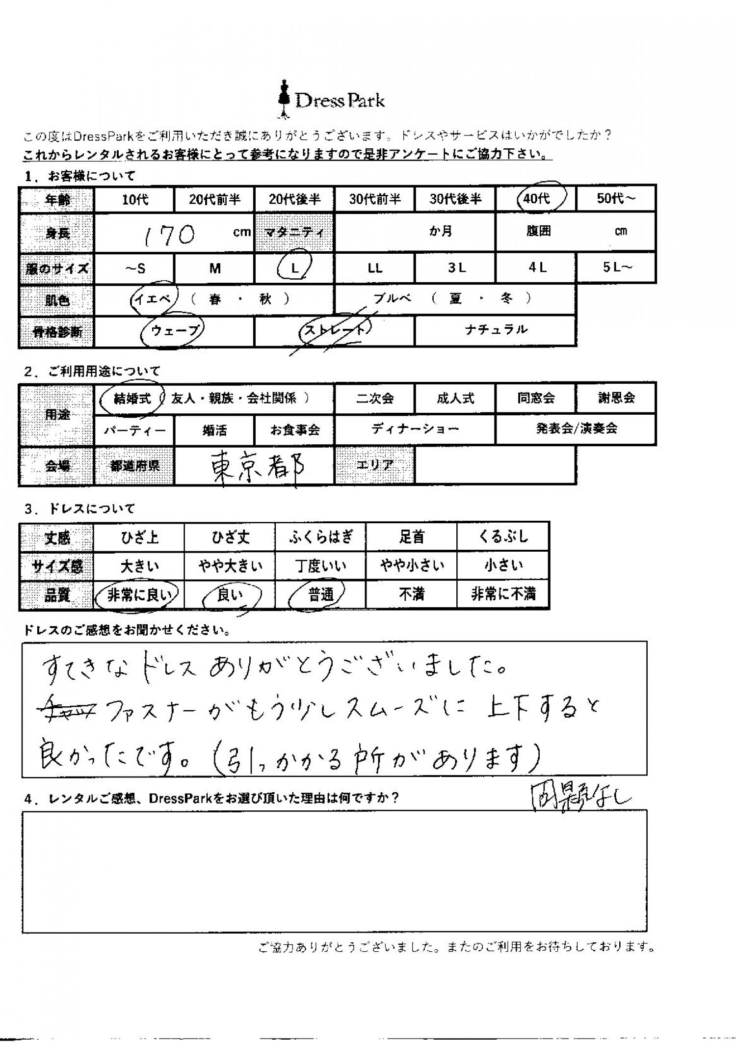 東京都 M.M様170㎝ Lサイズ #40代#M/L#170㎝以上#結婚式(友人)#東京都 ◆レンタルしたドレスはこちら ◆レンタルしたサイズは:L ◆レンタルした日付:2025/10/12 ドレスの着用感 ◆点数: (4点) ◆丈感:くるぶし ◆サイズ感:丁度いい ◆品質:非常に良い ◆肌色:イエベ ◆骨格診断:ウェーブ ドレスの感想 素敵なドレスありがとうございました。ファスナーがもう少しスムーズに上下すると良かったです。(引っかかるところがあります。)問題は無し。 CUSTOMER REVIEWS お客様の声 気になるカテゴリー別にご利用の感想をチェック! ◆AGE 年代で見る 10代 20代 30代 40代 50代~ ◆SIZE サイズで見る SS/S M/L 大きいサイズLL~ ◆HIGHT 身長で見る 140~149㎝ 150~154㎝ 155~159㎝ 160~164㎝ 165~169㎝ 170㎝以上 ◆マタニティ ~3か月 4~6か月 7~8か月 9~10か月 ◆肌色 イエベ ブルべ ◆骨格診断 ウェーブ ストレート ナチュラル ◆利用シーン 結婚式(友人) 結婚式(親族) 結婚式(会社関係) 二次会 成人式 謝恩会 パーティー その他 CUSTOMER REVIEWS都道府県別お客様の声 都道府県別にのお客様の声をチェック! 北海道 青森県 岩手県 宮城県 秋田県 山形県 福島県 茨城県 栃木県 群馬県 埼玉県 千葉県 東京都 神奈川県 新潟県 富山県 石川県 福井県 山梨県 長野県 岐阜県 静岡県 愛知県 三重県 滋賀県 京都府 大阪府 兵庫県 奈良県 和歌山県 鳥取県 島根県 岡山県 広島県 山口県 徳島県 香川県 愛媛県 高知県 福岡県 佐賀県 長崎県 熊本県 大分県 宮崎県 鹿児島県 沖縄県 CUSTOMER REVIEWSエリア別お客様の声 都道府県別にのお客様の声をチェック! 札幌 仙台 名古屋 軽井沢 金沢 神戸・芦屋 博多 那覇 梅田・新大阪 難波・心斎橋 鎌倉・湘南 横浜・みなとみらい 舞浜・浦安・幕張 大宮・浦和 青山・表参道 六本木・麻布 渋谷・恵比寿 新宿 池袋 銀座・丸の内 お台場・汐留 鹿児島市 郡山市 福島市 東予 甲府・石和 LINEでお問い合わせ このサイトではJavaScriptを使用しています