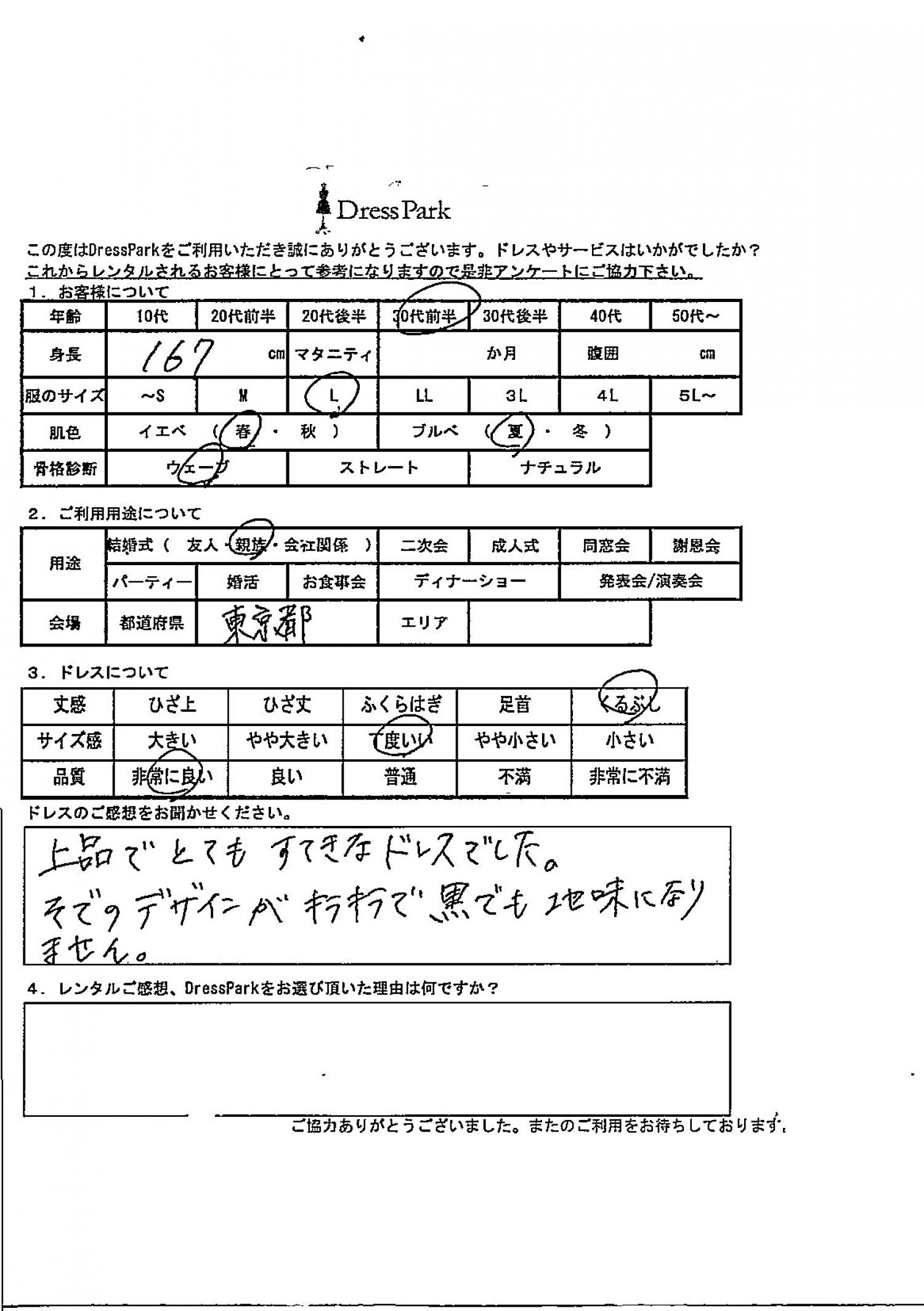 東京都 M.H様167㎝ Lサイズ #30代#M/L#165~169㎝#結婚式(親族)#東京都 ◆レンタルしたドレスはこちら ◆レンタルしたサイズは:L ◆レンタルした日付:2025/10/13 ドレスの着用感 ◆点数: (5点) ◆丈感:くるぶし ◆サイズ感:丁度いい ◆品質:非常に良い ◆肌色:イエベ ◆骨格診断:ウェーブ ドレスの感想 上品でとてもすてきなドレスでした。 そでのデザインがキラキラで黒でも地味になりません。 CUSTOMER REVIEWS お客様の声 気になるカテゴリー別にご利用の感想をチェック! ◆AGE 年代で見る 10代 20代 30代 40代 50代~ ◆SIZE サイズで見る SS/S M/L 大きいサイズLL~ ◆HIGHT 身長で見る 140~149㎝ 150~154㎝ 155~159㎝ 160~164㎝ 165~169㎝ 170㎝以上 ◆マタニティ ~3か月 4~6か月 7~8か月 9~10か月 ◆肌色 イエベ ブルべ ◆骨格診断 ウェーブ ストレート ナチュラル ◆利用シーン 結婚式(友人) 結婚式(親族) 結婚式(会社関係) 二次会 成人式 謝恩会 パーティー その他 CUSTOMER REVIEWS都道府県別お客様の声 都道府県別にのお客様の声をチェック! 北海道 青森県 岩手県 宮城県 秋田県 山形県 福島県 茨城県 栃木県 群馬県 埼玉県 千葉県 東京都 神奈川県 新潟県 富山県 石川県 福井県 山梨県 長野県 岐阜県 静岡県 愛知県 三重県 滋賀県 京都府 大阪府 兵庫県 奈良県 和歌山県 鳥取県 島根県 岡山県 広島県 山口県 徳島県 香川県 愛媛県 高知県 福岡県 佐賀県 長崎県 熊本県 大分県 宮崎県 鹿児島県 沖縄県 CUSTOMER REVIEWSエリア別お客様の声 都道府県別にのお客様の声をチェック! 札幌 仙台 名古屋 軽井沢 金沢 神戸・芦屋 博多 那覇 梅田・新大阪 難波・心斎橋 鎌倉・湘南 横浜・みなとみらい 舞浜・浦安・幕張 大宮・浦和 青山・表参道 六本木・麻布 渋谷・恵比寿 新宿 池袋 銀座・丸の内 お台場・汐留 鹿児島市 郡山市 福島市 東予 甲府・石和 LINEでお問い合わせ このサイトではJavaScriptを使用しています
