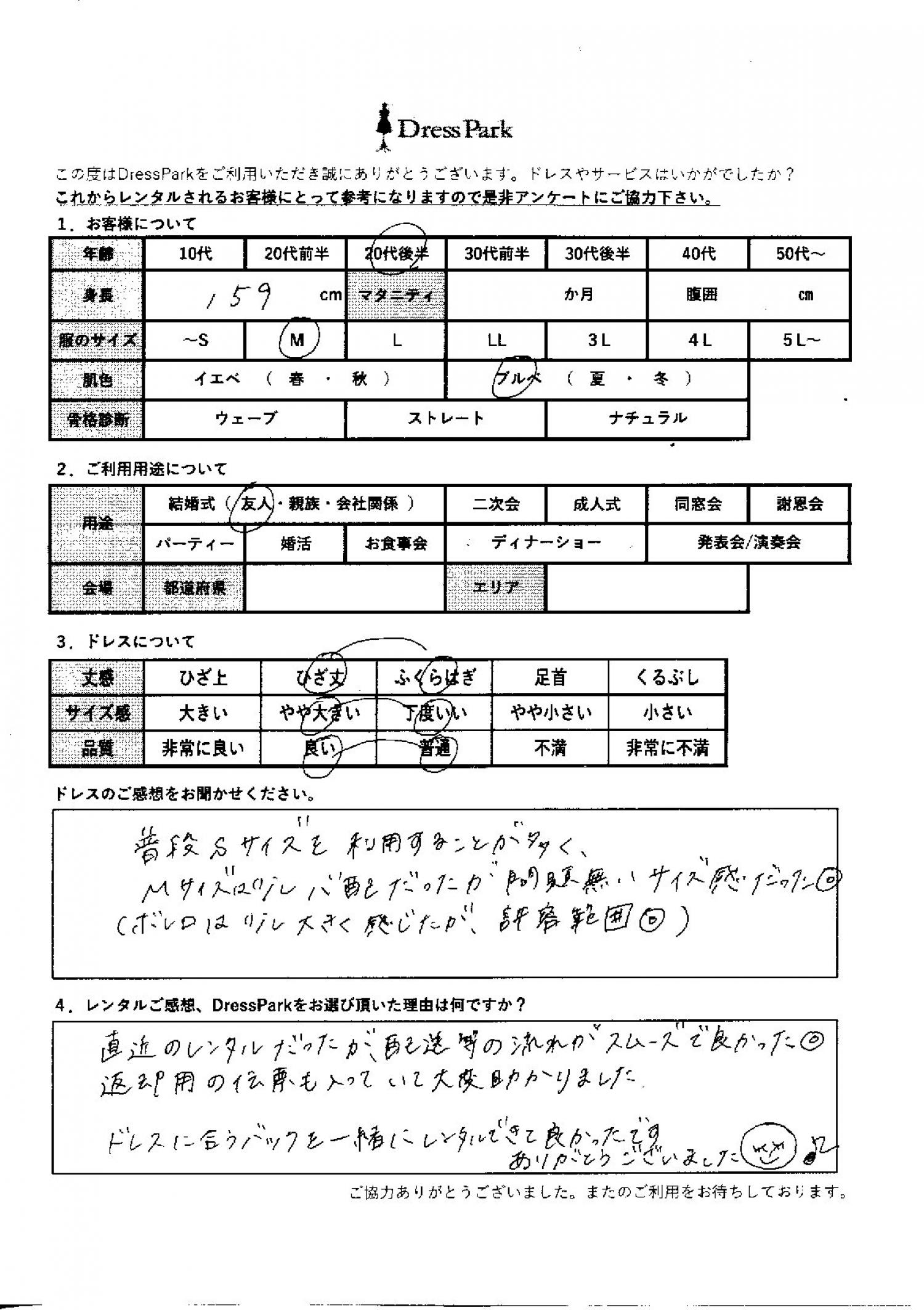 三重県 M.K様159㎝ ~Sサイズ #20代#SS/S#155~159㎝#結婚式(友人)#三重県 ◆レンタルしたドレスはこちら ◆レンタルしたサイズは:M ◆レンタルした日付:2025/10/18 ドレスの着用感 ◆点数: (4点) ◆丈感:ふくらはぎ ◆サイズ感:丁度いい ◆品質:良い ◆肌色:ブルべ ドレスの感想 普段Sサイズを利用することが多く、Mサイズは少し心配だったが問題ない。サイズ感だった◎。(ボレロは少し大きく感じたが、許容範囲) レンタルのご感想、DressParkをお選び頂いた理由 直近のレンタルだったが、配送等の流れがスムーズで良かった。返却用の伝票も入っていて大変助かりました。ドレスに合うバッグを一緒にレンタルできてよかったです。ありがとうございました♪ CUSTOMER REVIEWS お客様の声 気になるカテゴリー別にご利用の感想をチェック! ◆AGE 年代で見る 10代 20代 30代 40代 50代~ ◆SIZE サイズで見る SS/S M/L 大きいサイズLL~ ◆HIGHT 身長で見る 140~149㎝ 150~154㎝ 155~159㎝ 160~164㎝ 165~169㎝ 170㎝以上 ◆マタニティ ~3か月 4~6か月 7~8か月 9~10か月 ◆肌色 イエベ ブルべ ◆骨格診断 ウェーブ ストレート ナチュラル ◆利用シーン 結婚式(友人) 結婚式(親族) 結婚式(会社関係) 二次会 成人式 謝恩会 パーティー その他 CUSTOMER REVIEWS都道府県別お客様の声 都道府県別にのお客様の声をチェック! 北海道 青森県 岩手県 宮城県 秋田県 山形県 福島県 茨城県 栃木県 群馬県 埼玉県 千葉県 東京都 神奈川県 新潟県 富山県 石川県 福井県 山梨県 長野県 岐阜県 静岡県 愛知県 三重県 滋賀県 京都府 大阪府 兵庫県 奈良県 和歌山県 鳥取県 島根県 岡山県 広島県 山口県 徳島県 香川県 愛媛県 高知県 福岡県 佐賀県 長崎県 熊本県 大分県 宮崎県 鹿児島県 沖縄県 CUSTOMER REVIEWSエリア別お客様の声 都道府県別にのお客様の声をチェック! 札幌 仙台 名古屋 軽井沢 金沢 神戸・芦屋 博多 那覇 梅田・新大阪 難波・心斎橋 鎌倉・湘南 横浜・みなとみらい 舞浜・浦安・幕張 大宮・浦和 青山・表参道 六本木・麻布 渋谷・恵比寿 新宿 池袋 銀座・丸の内 お台場・汐留 鹿児島市 郡山市 福島市 東予 甲府・石和 LINEでお問い合わせ このサイトではJavaScriptを使用しています