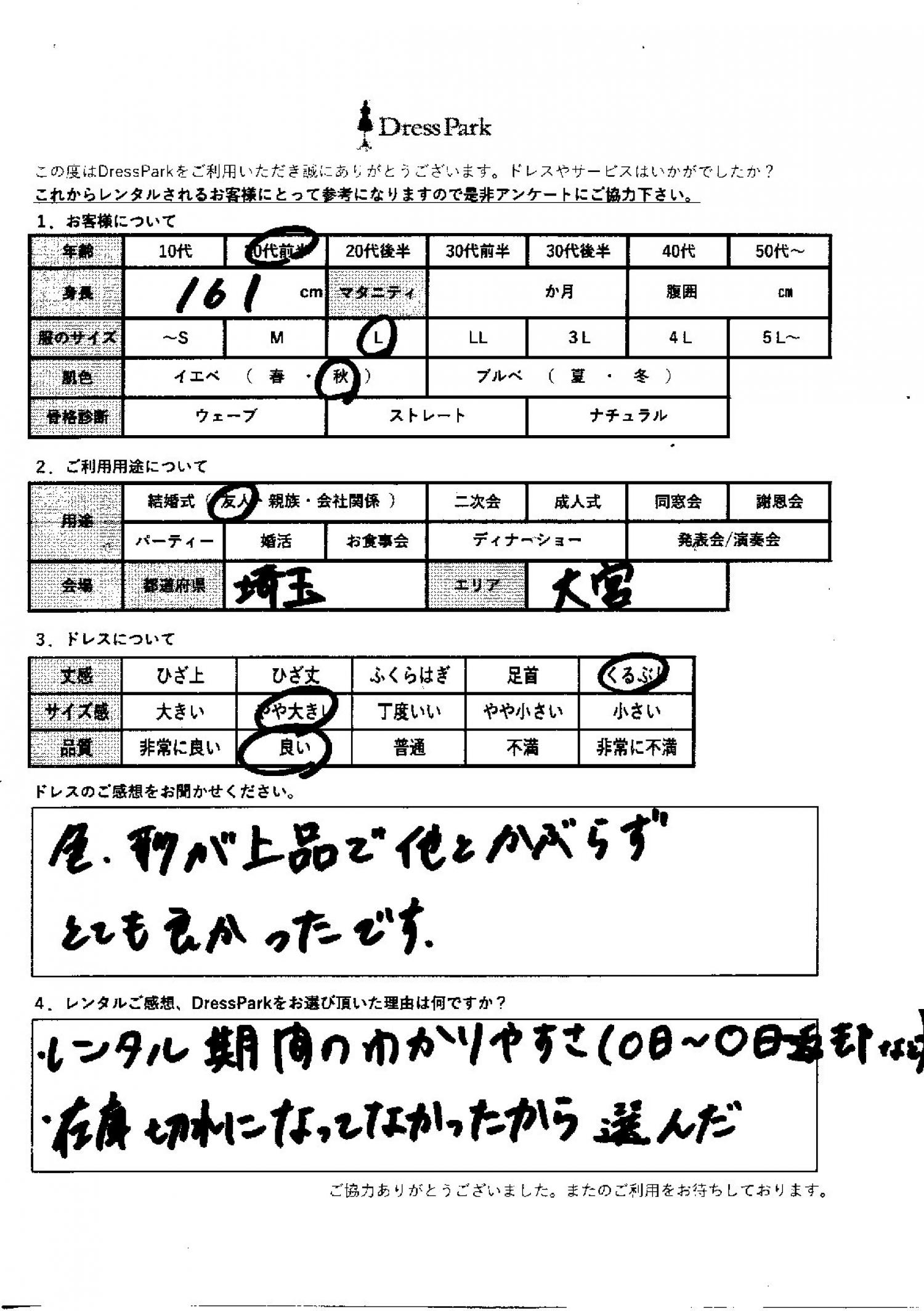埼玉県 N.N様161㎝ Lサイズ大宮・浦和 #20代#M/L#160~164㎝#結婚式(友人)#埼玉県#大宮・浦和 ◆レンタルしたドレスはこちら ◆レンタルしたサイズは:L ◆レンタルした日付:2025/10/18 ドレスの着用感 ◆点数: (5点) ◆丈感:くるぶし ◆サイズ感:やや大きい ◆品質:良い ◆肌色:イエベ ドレスの感想 色、形が上品で他とかぶらずとても良かったです。 レンタルのご感想、DressParkをお選び頂いた理由 レンタル期間のわかりやすさ、在庫切れになってなかったから選んだ。 CUSTOMER REVIEWS お客様の声 気になるカテゴリー別にご利用の感想をチェック! ◆AGE 年代で見る 10代 20代 30代 40代 50代~ ◆SIZE サイズで見る SS/S M/L 大きいサイズLL~ ◆HIGHT 身長で見る 140~149㎝ 150~154㎝ 155~159㎝ 160~164㎝ 165~169㎝ 170㎝以上 ◆マタニティ ~3か月 4~6か月 7~8か月 9~10か月 ◆肌色 イエベ ブルべ ◆骨格診断 ウェーブ ストレート ナチュラル ◆利用シーン 結婚式(友人) 結婚式(親族) 結婚式(会社関係) 二次会 成人式 謝恩会 パーティー その他 CUSTOMER REVIEWS都道府県別お客様の声 都道府県別にのお客様の声をチェック! 北海道 青森県 岩手県 宮城県 秋田県 山形県 福島県 茨城県 栃木県 群馬県 埼玉県 千葉県 東京都 神奈川県 新潟県 富山県 石川県 福井県 山梨県 長野県 岐阜県 静岡県 愛知県 三重県 滋賀県 京都府 大阪府 兵庫県 奈良県 和歌山県 鳥取県 島根県 岡山県 広島県 山口県 徳島県 香川県 愛媛県 高知県 福岡県 佐賀県 長崎県 熊本県 大分県 宮崎県 鹿児島県 沖縄県 CUSTOMER REVIEWSエリア別お客様の声 都道府県別にのお客様の声をチェック! 札幌 仙台 名古屋 軽井沢 金沢 神戸・芦屋 博多 那覇 梅田・新大阪 難波・心斎橋 鎌倉・湘南 横浜・みなとみらい 舞浜・浦安・幕張 大宮・浦和 青山・表参道 六本木・麻布 渋谷・恵比寿 新宿 池袋 銀座・丸の内 お台場・汐留 鹿児島市 郡山市 福島市 東予 甲府・石和 LINEでお問い合わせ このサイトではJavaScriptを使用しています