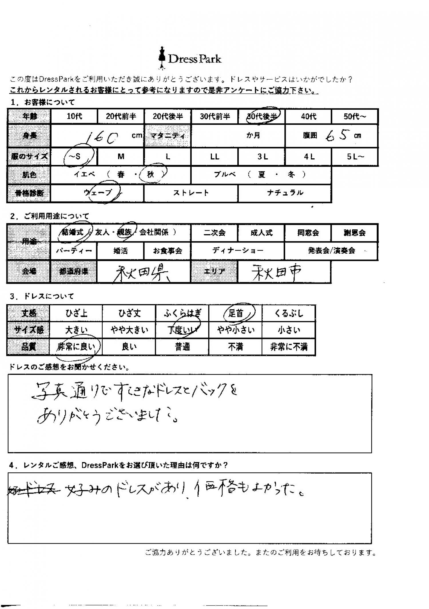 秋田県 N.M様160㎝ ~Sサイズ #30代#SS/S#160~164㎝#結婚式(親族)#秋田県 ◆レンタルしたドレスはこちら ◆レンタルしたサイズは:M ◆レンタルした日付:2025/10/18 ドレスの着用感 ◆点数: (5点) ◆丈感:足首 ◆サイズ感:丁度いい ◆品質:非常に良い ◆肌色:イエベ ◆骨格診断:ウェーブ ドレスの感想 写真通りで、素敵なドレスとバックをありがとうございました。 レンタルのご感想、DressParkをお選び頂いた理由 好みのドレスがあり、価格も良かった。 CUSTOMER REVIEWS お客様の声 気になるカテゴリー別にご利用の感想をチェック! ◆AGE 年代で見る 10代 20代 30代 40代 50代~ ◆SIZE サイズで見る SS/S M/L 大きいサイズLL~ ◆HIGHT 身長で見る 140~149㎝ 150~154㎝ 155~159㎝ 160~164㎝ 165~169㎝ 170㎝以上 ◆マタニティ ~3か月 4~6か月 7~8か月 9~10か月 ◆肌色 イエベ ブルべ ◆骨格診断 ウェーブ ストレート ナチュラル ◆利用シーン 結婚式(友人) 結婚式(親族) 結婚式(会社関係) 二次会 成人式 謝恩会 パーティー その他 CUSTOMER REVIEWS都道府県別お客様の声 都道府県別にのお客様の声をチェック! 北海道 青森県 岩手県 宮城県 秋田県 山形県 福島県 茨城県 栃木県 群馬県 埼玉県 千葉県 東京都 神奈川県 新潟県 富山県 石川県 福井県 山梨県 長野県 岐阜県 静岡県 愛知県 三重県 滋賀県 京都府 大阪府 兵庫県 奈良県 和歌山県 鳥取県 島根県 岡山県 広島県 山口県 徳島県 香川県 愛媛県 高知県 福岡県 佐賀県 長崎県 熊本県 大分県 宮崎県 鹿児島県 沖縄県 CUSTOMER REVIEWSエリア別お客様の声 都道府県別にのお客様の声をチェック! 札幌 仙台 名古屋 軽井沢 金沢 神戸・芦屋 博多 那覇 梅田・新大阪 難波・心斎橋 鎌倉・湘南 横浜・みなとみらい 舞浜・浦安・幕張 大宮・浦和 青山・表参道 六本木・麻布 渋谷・恵比寿 新宿 池袋 銀座・丸の内 お台場・汐留 鹿児島市 郡山市 福島市 東予 甲府・石和 LINEでお問い合わせ このサイトではJavaScriptを使用しています