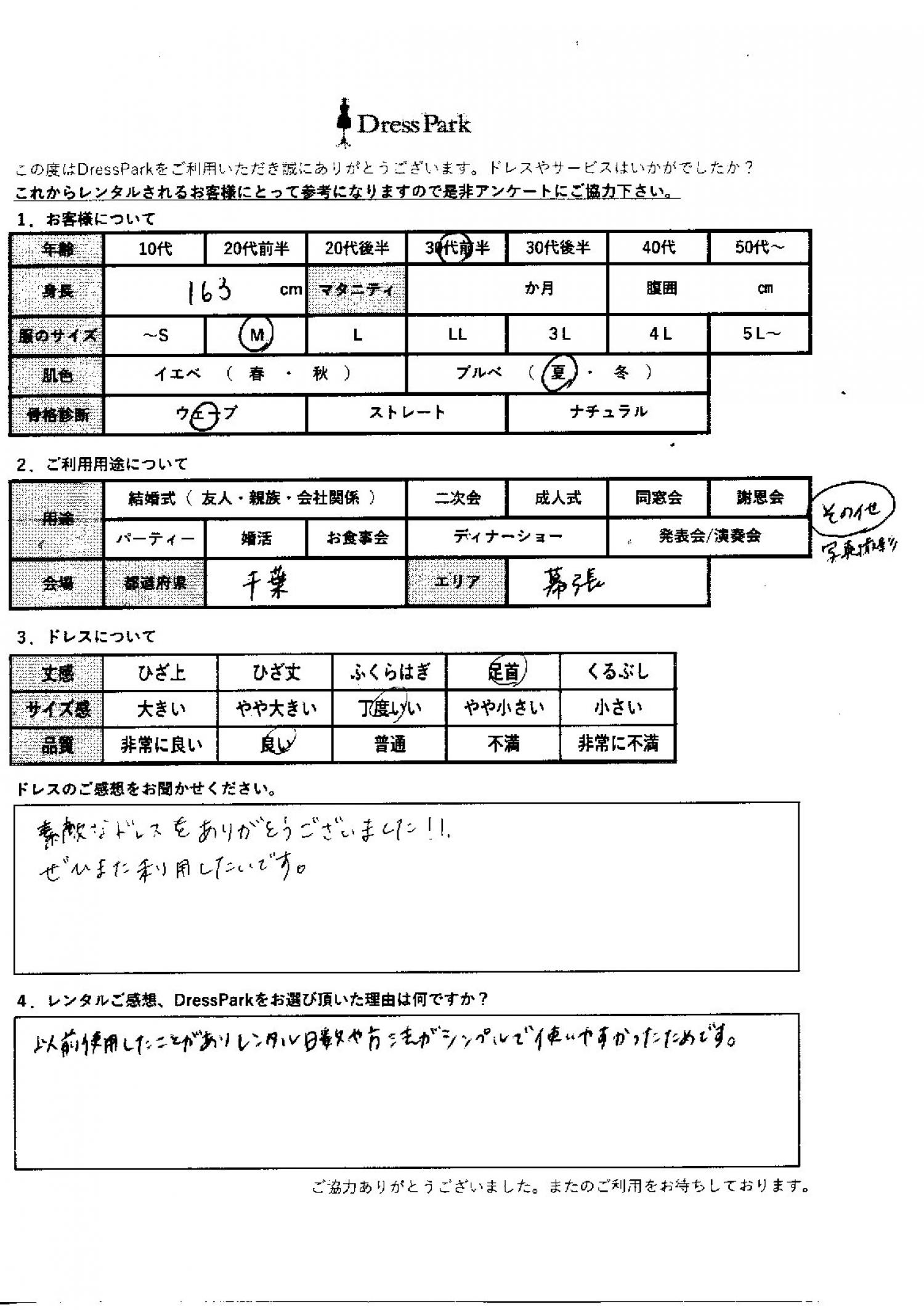 千葉県 S.S様163㎝ Mサイズ舞浜・浦安・幕張 #30代#M/L#160~164㎝#その他#千葉県#舞浜・浦安・幕張 ◆レンタルしたドレスはこちら ◆レンタルしたサイズは:M ◆レンタルした日付:2025/10/18 ドレスの着用感 ◆点数: (4点) ◆丈感:足首 ◆サイズ感:丁度いい ◆品質:良い ◆肌色:ブルべ ◆骨格診断:ウェーブ ドレスの感想 素敵なドレスをありがとうございました!ぜひまた利用したいです。 レンタルのご感想、DressParkをお選び頂いた理由 以前使用したことがあり、レンタル日数や方法がシンプルで使いやすかったためです。 CUSTOMER REVIEWS お客様の声 気になるカテゴリー別にご利用の感想をチェック! ◆AGE 年代で見る 10代 20代 30代 40代 50代~ ◆SIZE サイズで見る SS/S M/L 大きいサイズLL~ ◆HIGHT 身長で見る 140~149㎝ 150~154㎝ 155~159㎝ 160~164㎝ 165~169㎝ 170㎝以上 ◆マタニティ ~3か月 4~6か月 7~8か月 9~10か月 ◆肌色 イエベ ブルべ ◆骨格診断 ウェーブ ストレート ナチュラル ◆利用シーン 結婚式(友人) 結婚式(親族) 結婚式(会社関係) 二次会 成人式 謝恩会 パーティー その他 CUSTOMER REVIEWS都道府県別お客様の声 都道府県別にのお客様の声をチェック! 北海道 青森県 岩手県 宮城県 秋田県 山形県 福島県 茨城県 栃木県 群馬県 埼玉県 千葉県 東京都 神奈川県 新潟県 富山県 石川県 福井県 山梨県 長野県 岐阜県 静岡県 愛知県 三重県 滋賀県 京都府 大阪府 兵庫県 奈良県 和歌山県 鳥取県 島根県 岡山県 広島県 山口県 徳島県 香川県 愛媛県 高知県 福岡県 佐賀県 長崎県 熊本県 大分県 宮崎県 鹿児島県 沖縄県 CUSTOMER REVIEWSエリア別お客様の声 都道府県別にのお客様の声をチェック! 札幌 仙台 名古屋 軽井沢 金沢 神戸・芦屋 博多 那覇 梅田・新大阪 難波・心斎橋 鎌倉・湘南 横浜・みなとみらい 舞浜・浦安・幕張 大宮・浦和 青山・表参道 六本木・麻布 渋谷・恵比寿 新宿 池袋 銀座・丸の内 お台場・汐留 鹿児島市 郡山市 福島市 東予 甲府・石和 LINEでお問い合わせ このサイトではJavaScriptを使用しています