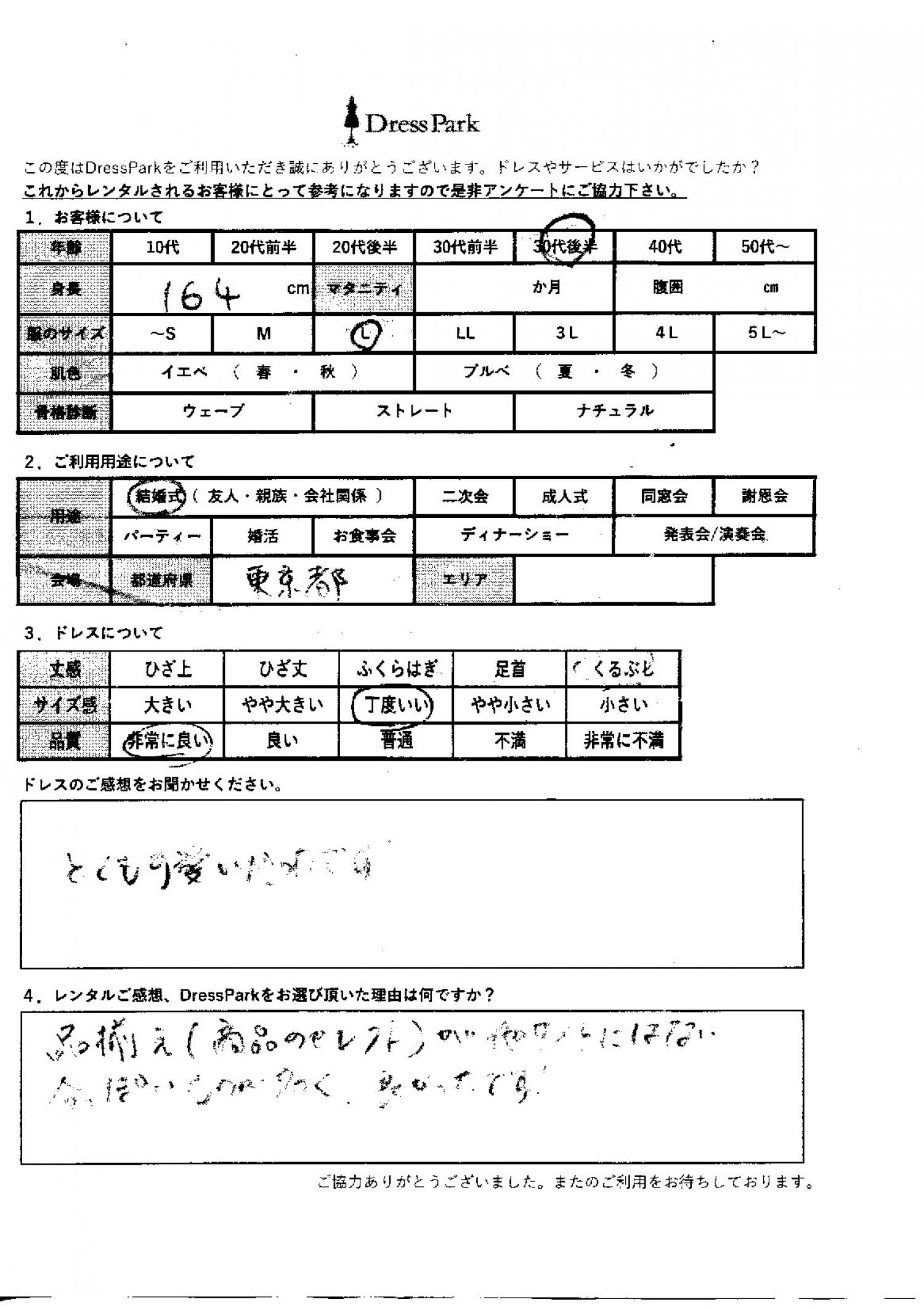 東京都 W.S様164㎝ Lサイズ #30代#M/L#160~164㎝#結婚式(友人)#東京都 ◆レンタルしたドレスはこちら ◆レンタルしたサイズは:L ◆レンタルした日付:2025/10/18 ドレスの着用感 ◆点数: (5点) ◆丈感:くるぶし ◆サイズ感:丁度いい ◆品質:非常に良い ドレスの感想 とても可愛かったです! レンタルのご感想、DressParkをお選び頂いた理由 品揃え(商品のセレクト)が、他サイトにはない今っぽいものが多く良かったです! CUSTOMER REVIEWS お客様の声 気になるカテゴリー別にご利用の感想をチェック! ◆AGE 年代で見る 10代 20代 30代 40代 50代~ ◆SIZE サイズで見る SS/S M/L 大きいサイズLL~ ◆HIGHT 身長で見る 140~149㎝ 150~154㎝ 155~159㎝ 160~164㎝ 165~169㎝ 170㎝以上 ◆マタニティ ~3か月 4~6か月 7~8か月 9~10か月 ◆肌色 イエベ ブルべ ◆骨格診断 ウェーブ ストレート ナチュラル ◆利用シーン 結婚式(友人) 結婚式(親族) 結婚式(会社関係) 二次会 成人式 謝恩会 パーティー その他 CUSTOMER REVIEWS都道府県別お客様の声 都道府県別にのお客様の声をチェック! 北海道 青森県 岩手県 宮城県 秋田県 山形県 福島県 茨城県 栃木県 群馬県 埼玉県 千葉県 東京都 神奈川県 新潟県 富山県 石川県 福井県 山梨県 長野県 岐阜県 静岡県 愛知県 三重県 滋賀県 京都府 大阪府 兵庫県 奈良県 和歌山県 鳥取県 島根県 岡山県 広島県 山口県 徳島県 香川県 愛媛県 高知県 福岡県 佐賀県 長崎県 熊本県 大分県 宮崎県 鹿児島県 沖縄県 CUSTOMER REVIEWSエリア別お客様の声 都道府県別にのお客様の声をチェック! 札幌 仙台 名古屋 軽井沢 金沢 神戸・芦屋 博多 那覇 梅田・新大阪 難波・心斎橋 鎌倉・湘南 横浜・みなとみらい 舞浜・浦安・幕張 大宮・浦和 青山・表参道 六本木・麻布 渋谷・恵比寿 新宿 池袋 銀座・丸の内 お台場・汐留 鹿児島市 郡山市 福島市 東予 甲府・石和 LINEでお問い合わせ このサイトではJavaScriptを使用しています