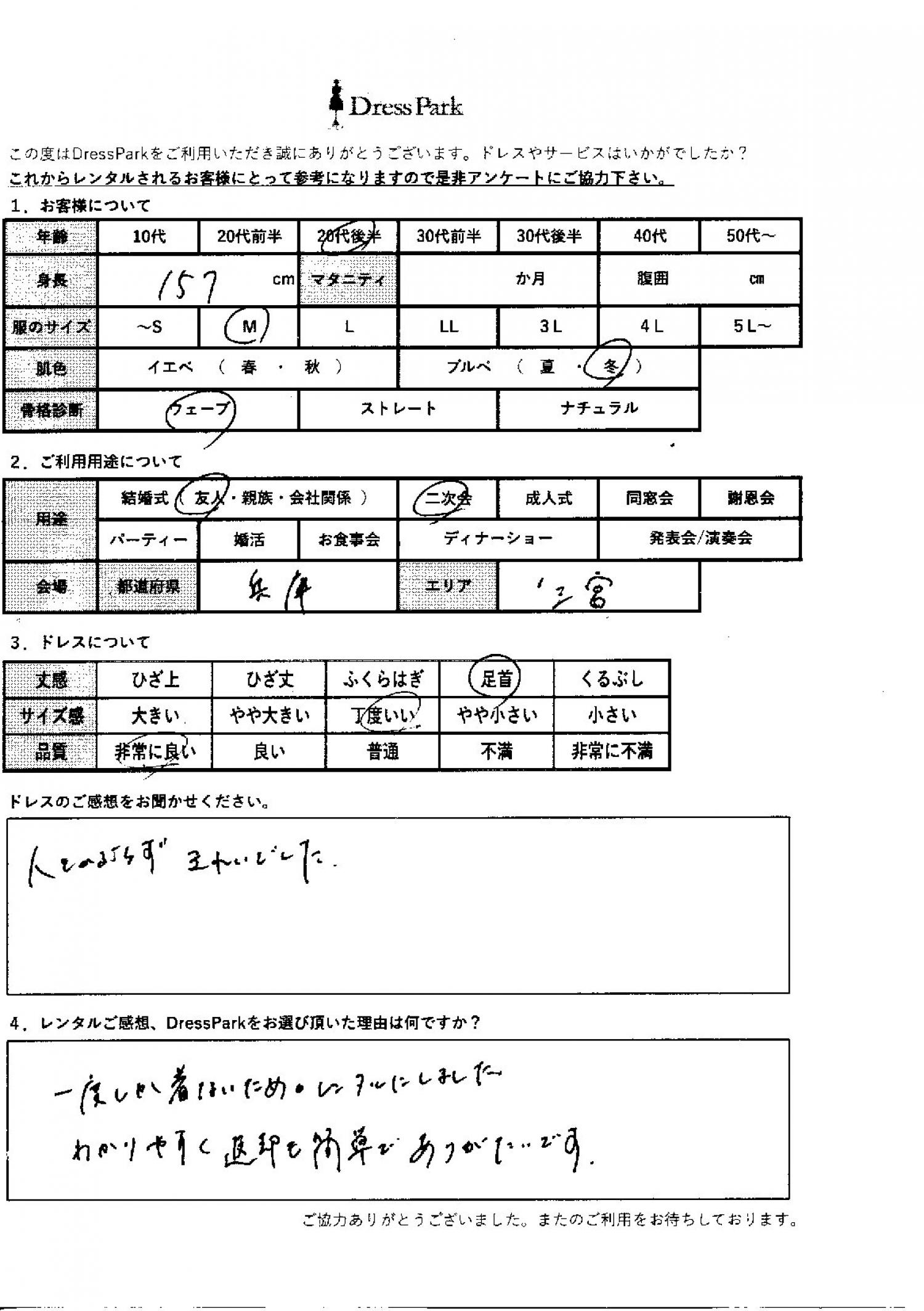 兵庫県 K.N様157㎝ Mサイズ #20代#M/L#155~159㎝#結婚式(友人)#兵庫県 ◆レンタルしたドレスはこちら ◆レンタルしたサイズは:M ◆レンタルした日付:2025/10/18 ドレスの着用感 ◆点数: (5点) ◆丈感:足首 ◆サイズ感:丁度いい ◆品質:非常に良い ◆肌色:ブルべ ◆骨格診断:ウェーブ ドレスの感想 人とかぶらずきれいでした。 レンタルのご感想、DressParkをお選び頂いた理由 1度しか着ないためレンタルにしました。わかりやすく返却も簡単でありがたいです。 CUSTOMER REVIEWS お客様の声 気になるカテゴリー別にご利用の感想をチェック! ◆AGE 年代で見る 10代 20代 30代 40代 50代~ ◆SIZE サイズで見る SS/S M/L 大きいサイズLL~ ◆HIGHT 身長で見る 140~149㎝ 150~154㎝ 155~159㎝ 160~164㎝ 165~169㎝ 170㎝以上 ◆マタニティ ~3か月 4~6か月 7~8か月 9~10か月 ◆肌色 イエベ ブルべ ◆骨格診断 ウェーブ ストレート ナチュラル ◆利用シーン 結婚式(友人) 結婚式(親族) 結婚式(会社関係) 二次会 成人式 謝恩会 パーティー その他 CUSTOMER REVIEWS都道府県別お客様の声 都道府県別にのお客様の声をチェック! 北海道 青森県 岩手県 宮城県 秋田県 山形県 福島県 茨城県 栃木県 群馬県 埼玉県 千葉県 東京都 神奈川県 新潟県 富山県 石川県 福井県 山梨県 長野県 岐阜県 静岡県 愛知県 三重県 滋賀県 京都府 大阪府 兵庫県 奈良県 和歌山県 鳥取県 島根県 岡山県 広島県 山口県 徳島県 香川県 愛媛県 高知県 福岡県 佐賀県 長崎県 熊本県 大分県 宮崎県 鹿児島県 沖縄県 CUSTOMER REVIEWSエリア別お客様の声 都道府県別にのお客様の声をチェック! 札幌 仙台 名古屋 軽井沢 金沢 神戸・芦屋 博多 那覇 梅田・新大阪 難波・心斎橋 鎌倉・湘南 横浜・みなとみらい 舞浜・浦安・幕張 大宮・浦和 青山・表参道 六本木・麻布 渋谷・恵比寿 新宿 池袋 銀座・丸の内 お台場・汐留 鹿児島市 郡山市 福島市 東予 甲府・石和 LINEでお問い合わせ このサイトではJavaScriptを使用しています