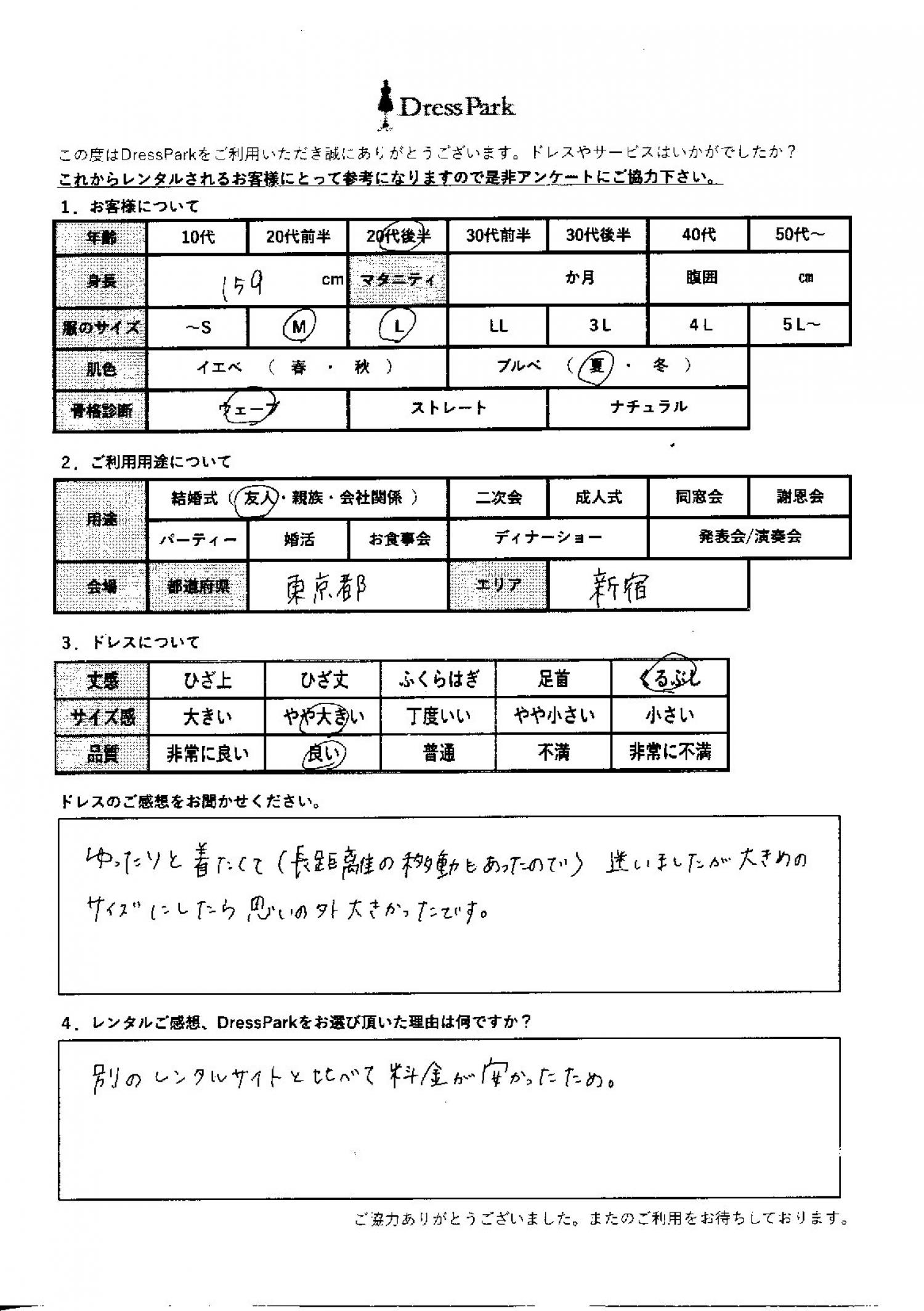 東京都 S.N様159㎝ Mサイズ新宿 #20代#M/L#155~159㎝#結婚式(友人)#東京都#新宿 ◆レンタルしたドレスはこちら ◆レンタルしたサイズは:L ◆レンタルした日付:2025/10/18 ドレスの着用感 ◆点数: (4点) ◆丈感:くるぶし ◆サイズ感:やや大きい ◆品質:良い ◆肌色:ブルべ ◆骨格診断:ウェーブ ドレスの感想 ゆったりときたくて(長距離の移動もあったので)迷いましたが、大きめのサイズにしたら思いのほか大きかったです。 レンタルのご感想、DressParkをお選び頂いた理由 他のレンタルサイトと比べて料金が安かったため。 CUSTOMER REVIEWS お客様の声 気になるカテゴリー別にご利用の感想をチェック! ◆AGE 年代で見る 10代 20代 30代 40代 50代~ ◆SIZE サイズで見る SS/S M/L 大きいサイズLL~ ◆HIGHT 身長で見る 140~149㎝ 150~154㎝ 155~159㎝ 160~164㎝ 165~169㎝ 170㎝以上 ◆マタニティ ~3か月 4~6か月 7~8か月 9~10か月 ◆肌色 イエベ ブルべ ◆骨格診断 ウェーブ ストレート ナチュラル ◆利用シーン 結婚式(友人) 結婚式(親族) 結婚式(会社関係) 二次会 成人式 謝恩会 パーティー その他 CUSTOMER REVIEWS都道府県別お客様の声 都道府県別にのお客様の声をチェック! 北海道 青森県 岩手県 宮城県 秋田県 山形県 福島県 茨城県 栃木県 群馬県 埼玉県 千葉県 東京都 神奈川県 新潟県 富山県 石川県 福井県 山梨県 長野県 岐阜県 静岡県 愛知県 三重県 滋賀県 京都府 大阪府 兵庫県 奈良県 和歌山県 鳥取県 島根県 岡山県 広島県 山口県 徳島県 香川県 愛媛県 高知県 福岡県 佐賀県 長崎県 熊本県 大分県 宮崎県 鹿児島県 沖縄県 CUSTOMER REVIEWSエリア別お客様の声 都道府県別にのお客様の声をチェック! 札幌 仙台 名古屋 軽井沢 金沢 神戸・芦屋 博多 那覇 梅田・新大阪 難波・心斎橋 鎌倉・湘南 横浜・みなとみらい 舞浜・浦安・幕張 大宮・浦和 青山・表参道 六本木・麻布 渋谷・恵比寿 新宿 池袋 銀座・丸の内 お台場・汐留 鹿児島市 郡山市 福島市 東予 甲府・石和 LINEでお問い合わせ このサイトではJavaScriptを使用しています