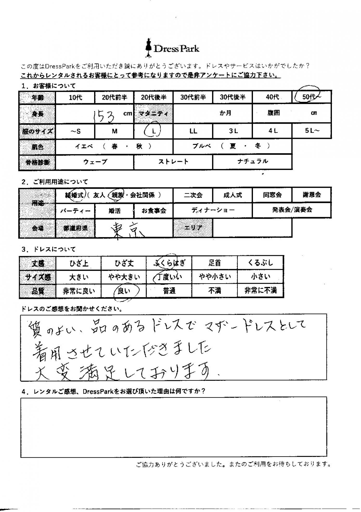 東京都 M.T様153㎝ Lサイズ #50代~#M/L#150~154㎝#結婚式(親族)#東京都 ◆レンタルしたドレスはこちら ◆レンタルしたサイズは:L ◆レンタルした日付:2025/10/18 ドレスの着用感 ◆点数: (5点) ◆丈感:ふくらはぎ ◆サイズ感:丁度いい ◆品質:良い ドレスの感想 質の良い、品のあるドレスでマザードレスとして着用させていただきました。大変満足しております。 CUSTOMER REVIEWS お客様の声 気になるカテゴリー別にご利用の感想をチェック! ◆AGE 年代で見る 10代 20代 30代 40代 50代~ ◆SIZE サイズで見る SS/S M/L 大きいサイズLL~ ◆HIGHT 身長で見る 140~149㎝ 150~154㎝ 155~159㎝ 160~164㎝ 165~169㎝ 170㎝以上 ◆マタニティ ~3か月 4~6か月 7~8か月 9~10か月 ◆肌色 イエベ ブルべ ◆骨格診断 ウェーブ ストレート ナチュラル ◆利用シーン 結婚式(友人) 結婚式(親族) 結婚式(会社関係) 二次会 成人式 謝恩会 パーティー その他 CUSTOMER REVIEWS都道府県別お客様の声 都道府県別にのお客様の声をチェック! 北海道 青森県 岩手県 宮城県 秋田県 山形県 福島県 茨城県 栃木県 群馬県 埼玉県 千葉県 東京都 神奈川県 新潟県 富山県 石川県 福井県 山梨県 長野県 岐阜県 静岡県 愛知県 三重県 滋賀県 京都府 大阪府 兵庫県 奈良県 和歌山県 鳥取県 島根県 岡山県 広島県 山口県 徳島県 香川県 愛媛県 高知県 福岡県 佐賀県 長崎県 熊本県 大分県 宮崎県 鹿児島県 沖縄県 CUSTOMER REVIEWSエリア別お客様の声 都道府県別にのお客様の声をチェック! 札幌 仙台 名古屋 軽井沢 金沢 神戸・芦屋 博多 那覇 梅田・新大阪 難波・心斎橋 鎌倉・湘南 横浜・みなとみらい 舞浜・浦安・幕張 大宮・浦和 青山・表参道 六本木・麻布 渋谷・恵比寿 新宿 池袋 銀座・丸の内 お台場・汐留 鹿児島市 郡山市 福島市 東予 甲府・石和 LINEでお問い合わせ このサイトではJavaScriptを使用しています