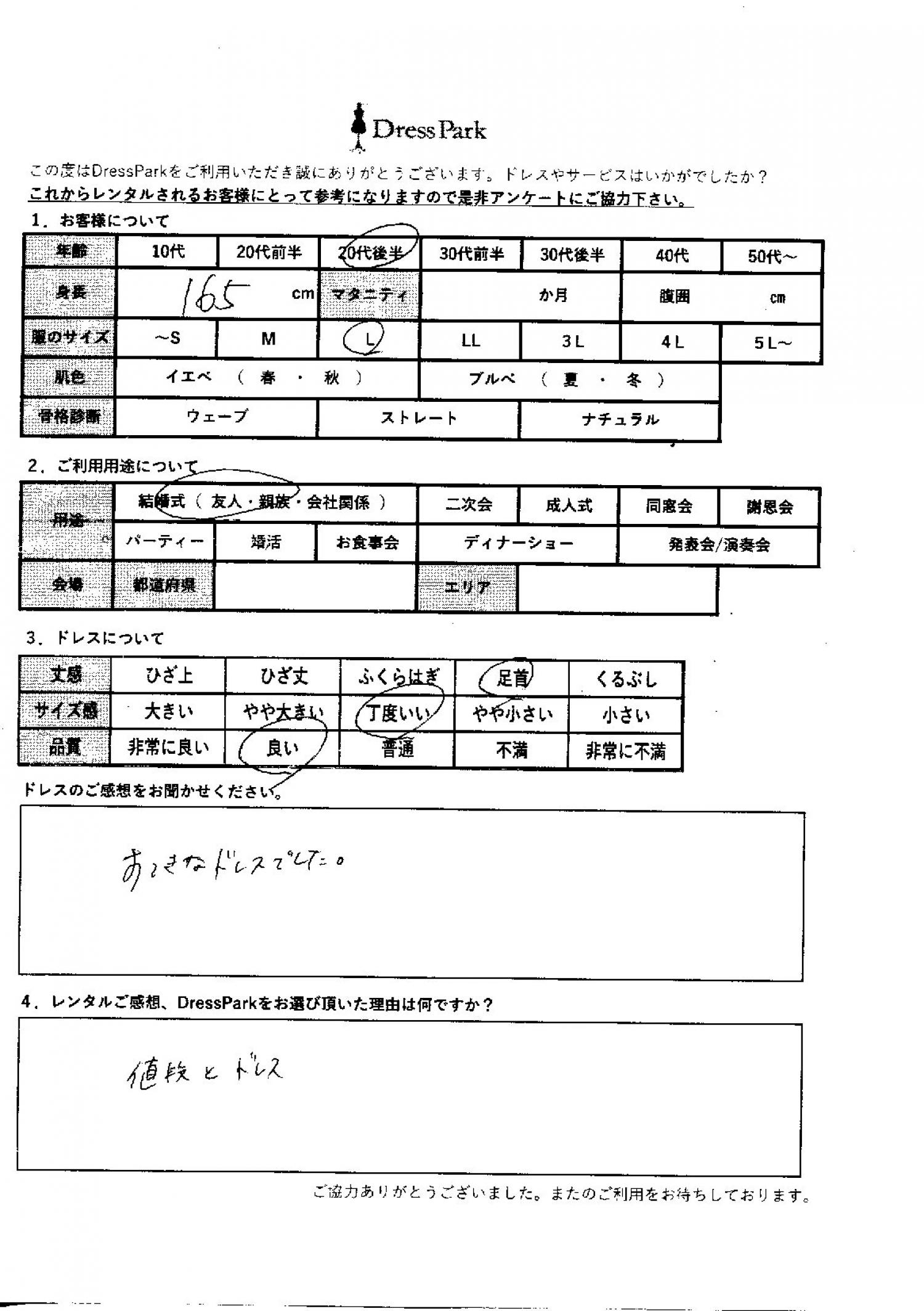 千葉県 M.I様165㎝ Lサイズ #20代#M/L#165~169㎝#結婚式(友人)#千葉県 ◆レンタルしたドレスはこちら ◆レンタルしたサイズは:L ◆レンタルした日付:2025/10/18 ドレスの着用感 ◆点数: (4点) ◆丈感:足首 ◆サイズ感:丁度いい ◆品質:良い ドレスの感想 素敵なドレスでした。 レンタルのご感想、DressParkをお選び頂いた理由 値段とドレス CUSTOMER REVIEWS お客様の声 気になるカテゴリー別にご利用の感想をチェック! ◆AGE 年代で見る 10代 20代 30代 40代 50代~ ◆SIZE サイズで見る SS/S M/L 大きいサイズLL~ ◆HIGHT 身長で見る 140~149㎝ 150~154㎝ 155~159㎝ 160~164㎝ 165~169㎝ 170㎝以上 ◆マタニティ ~3か月 4~6か月 7~8か月 9~10か月 ◆肌色 イエベ ブルべ ◆骨格診断 ウェーブ ストレート ナチュラル ◆利用シーン 結婚式(友人) 結婚式(親族) 結婚式(会社関係) 二次会 成人式 謝恩会 パーティー その他 CUSTOMER REVIEWS都道府県別お客様の声 都道府県別にのお客様の声をチェック! 北海道 青森県 岩手県 宮城県 秋田県 山形県 福島県 茨城県 栃木県 群馬県 埼玉県 千葉県 東京都 神奈川県 新潟県 富山県 石川県 福井県 山梨県 長野県 岐阜県 静岡県 愛知県 三重県 滋賀県 京都府 大阪府 兵庫県 奈良県 和歌山県 鳥取県 島根県 岡山県 広島県 山口県 徳島県 香川県 愛媛県 高知県 福岡県 佐賀県 長崎県 熊本県 大分県 宮崎県 鹿児島県 沖縄県 CUSTOMER REVIEWSエリア別お客様の声 都道府県別にのお客様の声をチェック! 札幌 仙台 名古屋 軽井沢 金沢 神戸・芦屋 博多 那覇 梅田・新大阪 難波・心斎橋 鎌倉・湘南 横浜・みなとみらい 舞浜・浦安・幕張 大宮・浦和 青山・表参道 六本木・麻布 渋谷・恵比寿 新宿 池袋 銀座・丸の内 お台場・汐留 鹿児島市 郡山市 福島市 東予 甲府・石和 LINEでお問い合わせ このサイトではJavaScriptを使用しています