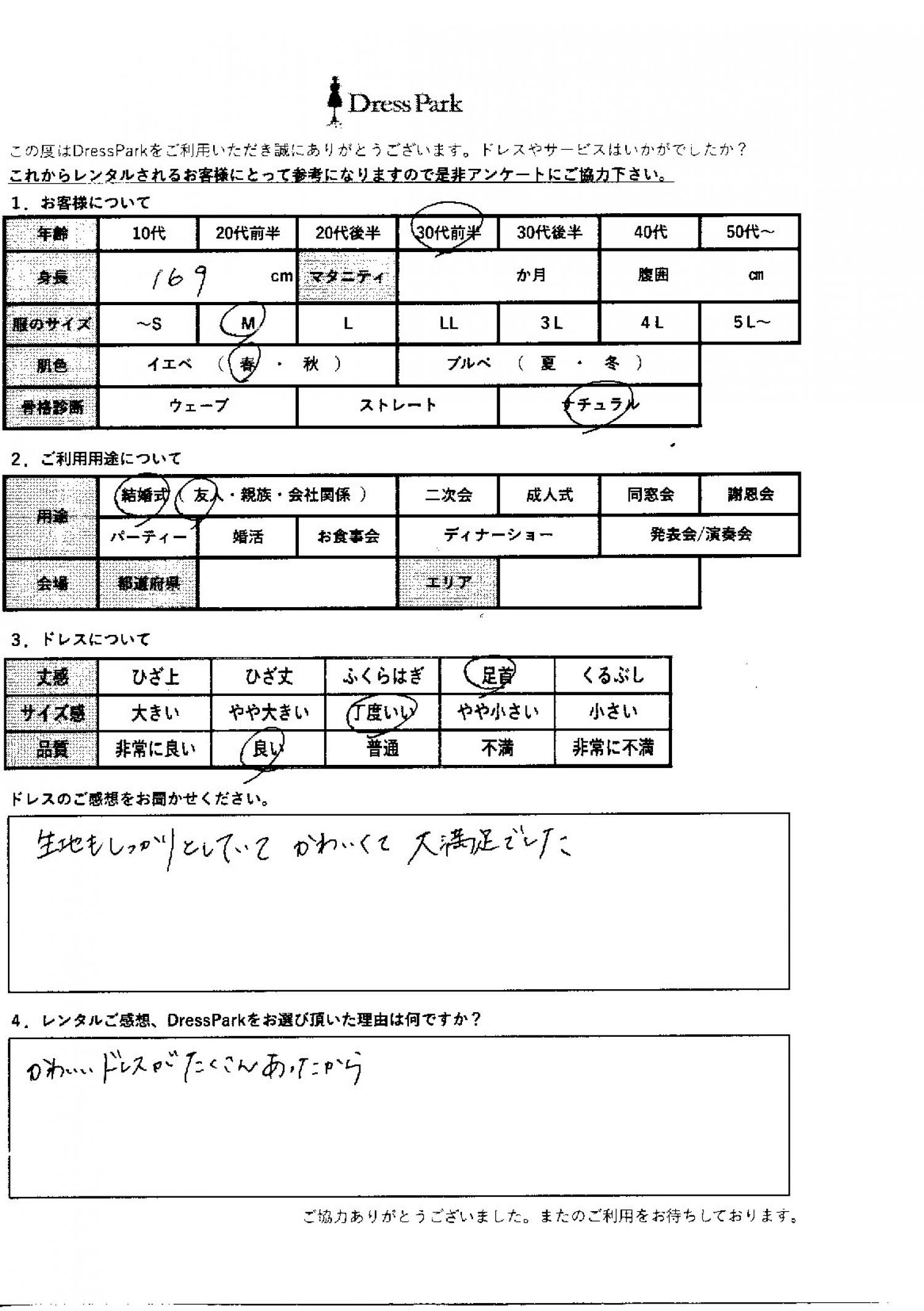 愛知県 H.K様169㎝ Mサイズ #30代#M/L#165~169㎝#結婚式(友人)#愛知県 ◆レンタルしたドレスはこちら ◆レンタルしたサイズは:M ◆レンタルした日付:2025/10/18 ドレスの着用感 ◆点数: (5点) ◆丈感:足首 ◆サイズ感:丁度いい ◆品質:良い ◆肌色:イエベ ◆骨格診断:ナチュラル ドレスの感想 生地もしっかりとしていて、可愛くて大満足でした。 レンタルのご感想、DressParkをお選び頂いた理由 可愛いドレスがたくさんあったから。 CUSTOMER REVIEWS お客様の声 気になるカテゴリー別にご利用の感想をチェック! ◆AGE 年代で見る 10代 20代 30代 40代 50代~ ◆SIZE サイズで見る SS/S M/L 大きいサイズLL~ ◆HIGHT 身長で見る 140~149㎝ 150~154㎝ 155~159㎝ 160~164㎝ 165~169㎝ 170㎝以上 ◆マタニティ ~3か月 4~6か月 7~8か月 9~10か月 ◆肌色 イエベ ブルべ ◆骨格診断 ウェーブ ストレート ナチュラル ◆利用シーン 結婚式(友人) 結婚式(親族) 結婚式(会社関係) 二次会 成人式 謝恩会 パーティー その他 CUSTOMER REVIEWS都道府県別お客様の声 都道府県別にのお客様の声をチェック! 北海道 青森県 岩手県 宮城県 秋田県 山形県 福島県 茨城県 栃木県 群馬県 埼玉県 千葉県 東京都 神奈川県 新潟県 富山県 石川県 福井県 山梨県 長野県 岐阜県 静岡県 愛知県 三重県 滋賀県 京都府 大阪府 兵庫県 奈良県 和歌山県 鳥取県 島根県 岡山県 広島県 山口県 徳島県 香川県 愛媛県 高知県 福岡県 佐賀県 長崎県 熊本県 大分県 宮崎県 鹿児島県 沖縄県 CUSTOMER REVIEWSエリア別お客様の声 都道府県別にのお客様の声をチェック! 札幌 仙台 名古屋 軽井沢 金沢 神戸・芦屋 博多 那覇 梅田・新大阪 難波・心斎橋 鎌倉・湘南 横浜・みなとみらい 舞浜・浦安・幕張 大宮・浦和 青山・表参道 六本木・麻布 渋谷・恵比寿 新宿 池袋 銀座・丸の内 お台場・汐留 鹿児島市 郡山市 福島市 東予 甲府・石和 LINEでお問い合わせ このサイトではJavaScriptを使用しています