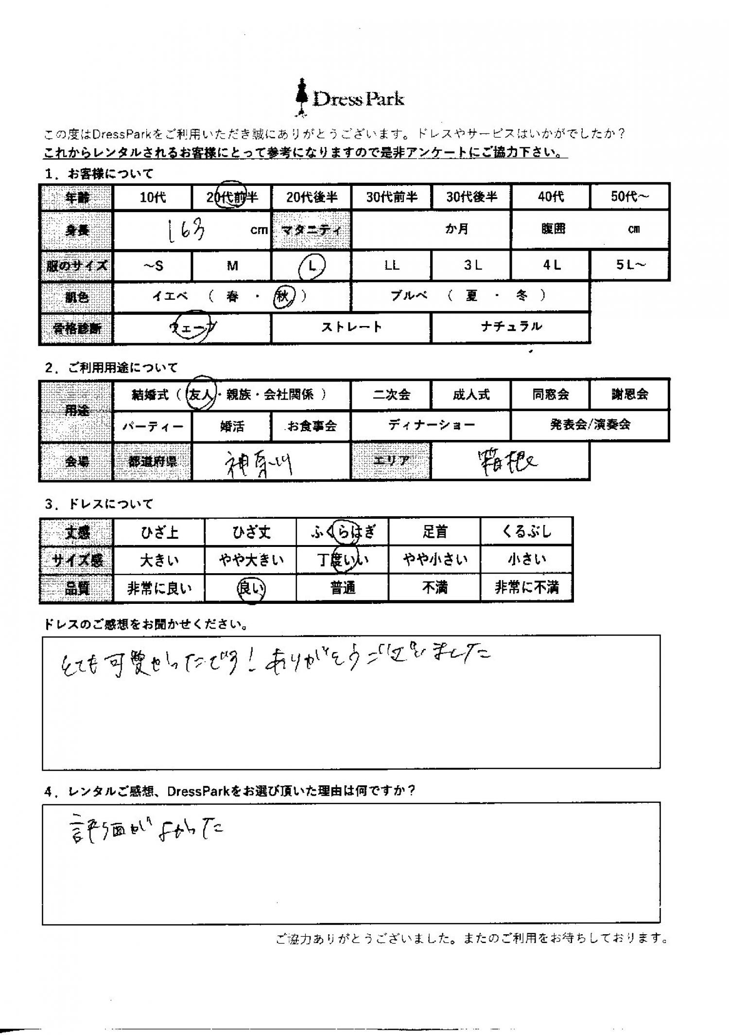 神奈川県 K.K様163㎝ Lサイズ #20代#M/L#160~164㎝#結婚式(友人)#神奈川県 ◆レンタルしたドレスはこちら ◆レンタルしたサイズは:L ◆レンタルした日付:2025/10/18 ドレスの着用感 ◆点数: (5点) ◆丈感:ふくらはぎ ◆サイズ感:丁度いい ◆品質:良い ◆肌色:イエベ ◆骨格診断:ウェーブ ドレスの感想 とても可愛かったです!ありがとうございました。 レンタルのご感想、DressParkをお選び頂いた理由 評価が良かった。 CUSTOMER REVIEWS お客様の声 気になるカテゴリー別にご利用の感想をチェック! ◆AGE 年代で見る 10代 20代 30代 40代 50代~ ◆SIZE サイズで見る SS/S M/L 大きいサイズLL~ ◆HIGHT 身長で見る 140~149㎝ 150~154㎝ 155~159㎝ 160~164㎝ 165~169㎝ 170㎝以上 ◆マタニティ ~3か月 4~6か月 7~8か月 9~10か月 ◆肌色 イエベ ブルべ ◆骨格診断 ウェーブ ストレート ナチュラル ◆利用シーン 結婚式(友人) 結婚式(親族) 結婚式(会社関係) 二次会 成人式 謝恩会 パーティー その他 CUSTOMER REVIEWS都道府県別お客様の声 都道府県別にのお客様の声をチェック! 北海道 青森県 岩手県 宮城県 秋田県 山形県 福島県 茨城県 栃木県 群馬県 埼玉県 千葉県 東京都 神奈川県 新潟県 富山県 石川県 福井県 山梨県 長野県 岐阜県 静岡県 愛知県 三重県 滋賀県 京都府 大阪府 兵庫県 奈良県 和歌山県 鳥取県 島根県 岡山県 広島県 山口県 徳島県 香川県 愛媛県 高知県 福岡県 佐賀県 長崎県 熊本県 大分県 宮崎県 鹿児島県 沖縄県 CUSTOMER REVIEWSエリア別お客様の声 都道府県別にのお客様の声をチェック! 札幌 仙台 名古屋 軽井沢 金沢 神戸・芦屋 博多 那覇 梅田・新大阪 難波・心斎橋 鎌倉・湘南 横浜・みなとみらい 舞浜・浦安・幕張 大宮・浦和 青山・表参道 六本木・麻布 渋谷・恵比寿 新宿 池袋 銀座・丸の内 お台場・汐留 鹿児島市 郡山市 福島市 東予 甲府・石和 LINEでお問い合わせ このサイトではJavaScriptを使用しています