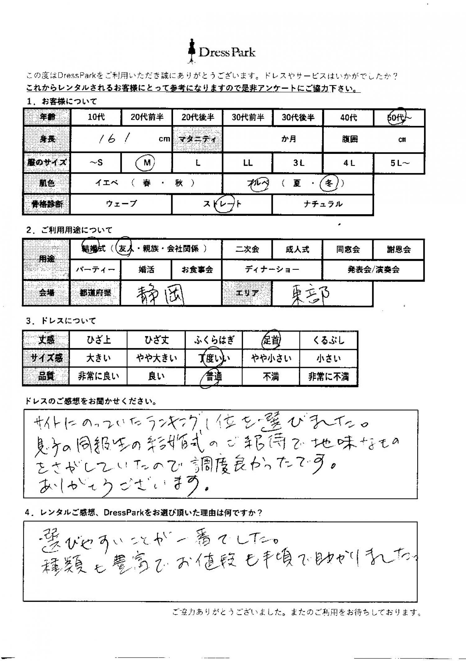 静岡県 M.M様161㎝ Mサイズ #50代~#M/L#160~164㎝#結婚式(友人)#静岡県 ◆レンタルしたドレスはこちら ◆レンタルしたサイズは:M ◆レンタルした日付:2025/10/19 ドレスの着用感 ◆点数: (4点) ◆丈感:足首 ◆サイズ感:丁度いい ◆品質:普通 ◆肌色:ブルべ ◆骨格診断:ストレート ドレスの感想 サイトに載っていたランキング1位を選びました。息子の同級生の結婚式のご招待で、地味なものを探していたので、ちょうど良かったです。ありがとうございます。 レンタルのご感想、DressParkをお選び頂いた理由 選びやすいことが1番でした。種類も豊富で、お値段も手頃で助かりました。 CUSTOMER REVIEWS お客様の声 気になるカテゴリー別にご利用の感想をチェック! ◆AGE 年代で見る 10代 20代 30代 40代 50代~ ◆SIZE サイズで見る SS/S M/L 大きいサイズLL~ ◆HIGHT 身長で見る 140~149㎝ 150~154㎝ 155~159㎝ 160~164㎝ 165~169㎝ 170㎝以上 ◆マタニティ ~3か月 4~6か月 7~8か月 9~10か月 ◆肌色 イエベ ブルべ ◆骨格診断 ウェーブ ストレート ナチュラル ◆利用シーン 結婚式(友人) 結婚式(親族) 結婚式(会社関係) 二次会 成人式 謝恩会 パーティー その他 CUSTOMER REVIEWS都道府県別お客様の声 都道府県別にのお客様の声をチェック! 北海道 青森県 岩手県 宮城県 秋田県 山形県 福島県 茨城県 栃木県 群馬県 埼玉県 千葉県 東京都 神奈川県 新潟県 富山県 石川県 福井県 山梨県 長野県 岐阜県 静岡県 愛知県 三重県 滋賀県 京都府 大阪府 兵庫県 奈良県 和歌山県 鳥取県 島根県 岡山県 広島県 山口県 徳島県 香川県 愛媛県 高知県 福岡県 佐賀県 長崎県 熊本県 大分県 宮崎県 鹿児島県 沖縄県 CUSTOMER REVIEWSエリア別お客様の声 都道府県別にのお客様の声をチェック! 札幌 仙台 名古屋 軽井沢 金沢 神戸・芦屋 博多 那覇 梅田・新大阪 難波・心斎橋 鎌倉・湘南 横浜・みなとみらい 舞浜・浦安・幕張 大宮・浦和 青山・表参道 六本木・麻布 渋谷・恵比寿 新宿 池袋 銀座・丸の内 お台場・汐留 鹿児島市 郡山市 福島市 東予 甲府・石和 LINEでお問い合わせ このサイトではJavaScriptを使用しています
