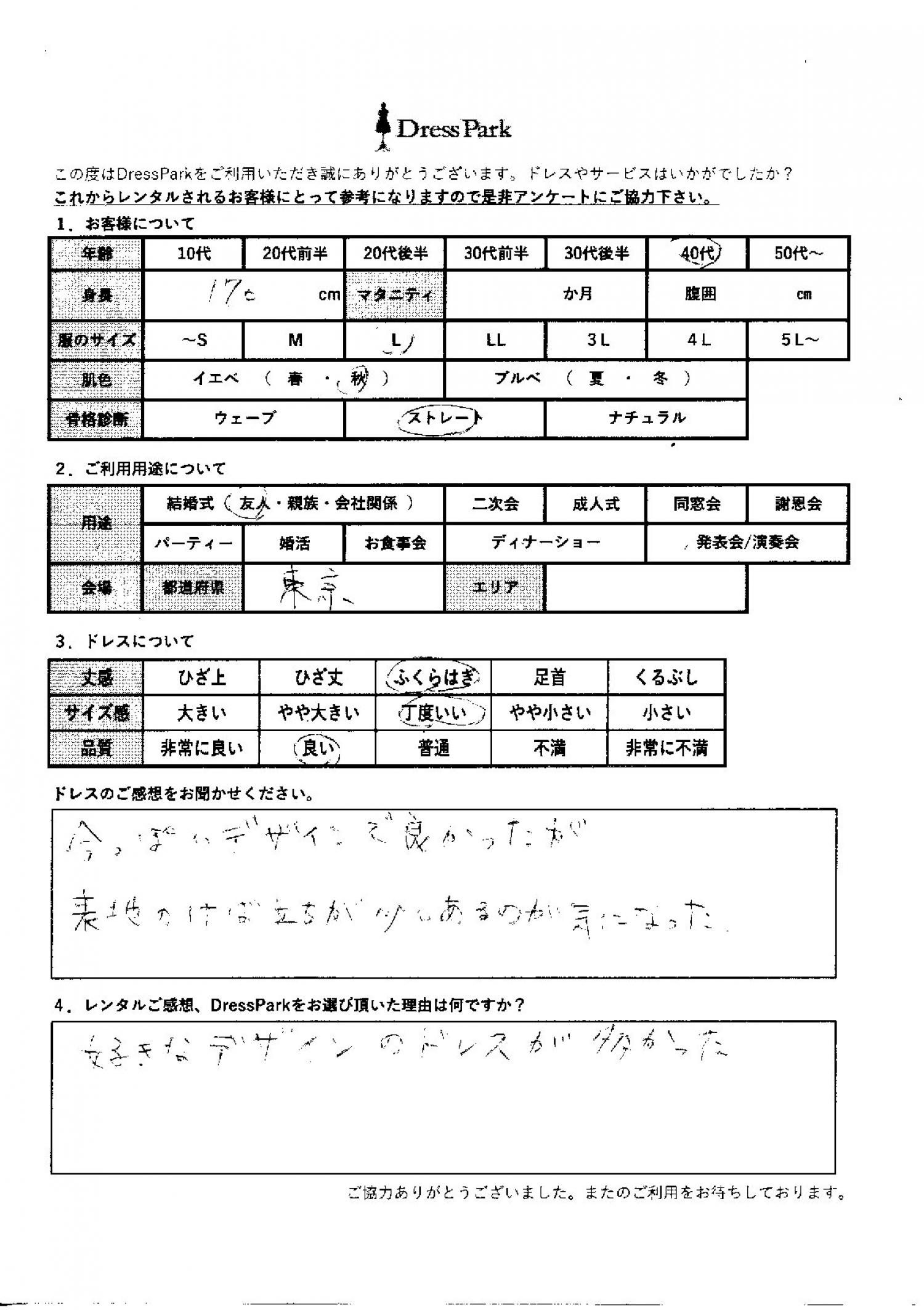 東京都 C.H様170㎝ Lサイズ #40代#M/L#170㎝以上#結婚式(友人)#東京都 ◆レンタルしたドレスはこちら ◆レンタルしたサイズは:L ◆レンタルした日付:2025/10/19 ドレスの着用感 ◆点数: (4点) ◆丈感:ふくらはぎ ◆サイズ感:丁度いい ◆品質:良い ◆肌色:イエベ ◆骨格診断:ストレート ドレスの感想 今っぽいデザインでよかったが、表面の毛羽立ちが少しあるのが気になった。 レンタルのご感想、DressParkをお選び頂いた理由 好きなデザインのドレスが多かった。 CUSTOMER REVIEWS お客様の声 気になるカテゴリー別にご利用の感想をチェック! ◆AGE 年代で見る 10代 20代 30代 40代 50代~ ◆SIZE サイズで見る SS/S M/L 大きいサイズLL~ ◆HIGHT 身長で見る 140~149㎝ 150~154㎝ 155~159㎝ 160~164㎝ 165~169㎝ 170㎝以上 ◆マタニティ ~3か月 4~6か月 7~8か月 9~10か月 ◆肌色 イエベ ブルべ ◆骨格診断 ウェーブ ストレート ナチュラル ◆利用シーン 結婚式(友人) 結婚式(親族) 結婚式(会社関係) 二次会 成人式 謝恩会 パーティー その他 CUSTOMER REVIEWS都道府県別お客様の声 都道府県別にのお客様の声をチェック! 北海道 青森県 岩手県 宮城県 秋田県 山形県 福島県 茨城県 栃木県 群馬県 埼玉県 千葉県 東京都 神奈川県 新潟県 富山県 石川県 福井県 山梨県 長野県 岐阜県 静岡県 愛知県 三重県 滋賀県 京都府 大阪府 兵庫県 奈良県 和歌山県 鳥取県 島根県 岡山県 広島県 山口県 徳島県 香川県 愛媛県 高知県 福岡県 佐賀県 長崎県 熊本県 大分県 宮崎県 鹿児島県 沖縄県 CUSTOMER REVIEWSエリア別お客様の声 都道府県別にのお客様の声をチェック! 札幌 仙台 名古屋 軽井沢 金沢 神戸・芦屋 博多 那覇 梅田・新大阪 難波・心斎橋 鎌倉・湘南 横浜・みなとみらい 舞浜・浦安・幕張 大宮・浦和 青山・表参道 六本木・麻布 渋谷・恵比寿 新宿 池袋 銀座・丸の内 お台場・汐留 鹿児島市 郡山市 福島市 東予 甲府・石和 LINEでお問い合わせ このサイトではJavaScriptを使用しています