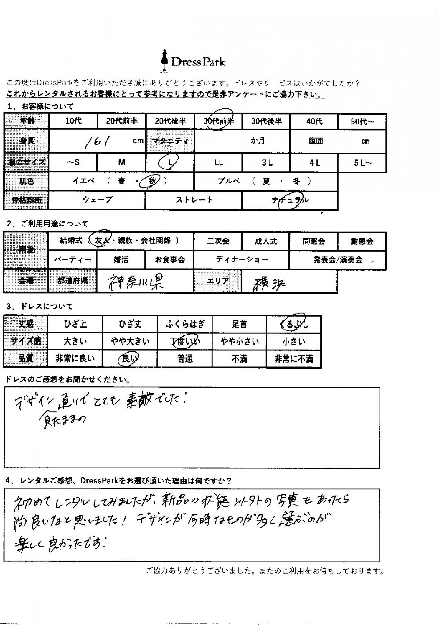 神奈川県 R.I様161㎝ Lサイズ横浜・みなとみらい #30代#M/L#160~164㎝#結婚式(友人)#神奈川県#横浜・みなとみらい ◆レンタルしたドレスはこちら ◆レンタルしたサイズは:L ◆レンタルした日付:2025/10/19 ドレスの着用感 ◆点数: (4点) ◆丈感:くるぶし ◆サイズ感:丁度いい ◆品質:良い ◆肌色:イエベ ◆骨格診断:ナチュラル ドレスの感想 デザイン見たままの通りでとても素敵でした! レンタルのご感想、DressParkをお選び頂いた理由 初めてレンタルしてみましたが、新品の状態以外の写真もあったら尚良いなと思いました!デザインが旬なものが多く選ぶのが楽しく良かったです! CUSTOMER REVIEWS お客様の声 気になるカテゴリー別にご利用の感想をチェック! ◆AGE 年代で見る 10代 20代 30代 40代 50代~ ◆SIZE サイズで見る SS/S M/L 大きいサイズLL~ ◆HIGHT 身長で見る 140~149㎝ 150~154㎝ 155~159㎝ 160~164㎝ 165~169㎝ 170㎝以上 ◆マタニティ ~3か月 4~6か月 7~8か月 9~10か月 ◆肌色 イエベ ブルべ ◆骨格診断 ウェーブ ストレート ナチュラル ◆利用シーン 結婚式(友人) 結婚式(親族) 結婚式(会社関係) 二次会 成人式 謝恩会 パーティー その他 CUSTOMER REVIEWS都道府県別お客様の声 都道府県別にのお客様の声をチェック! 北海道 青森県 岩手県 宮城県 秋田県 山形県 福島県 茨城県 栃木県 群馬県 埼玉県 千葉県 東京都 神奈川県 新潟県 富山県 石川県 福井県 山梨県 長野県 岐阜県 静岡県 愛知県 三重県 滋賀県 京都府 大阪府 兵庫県 奈良県 和歌山県 鳥取県 島根県 岡山県 広島県 山口県 徳島県 香川県 愛媛県 高知県 福岡県 佐賀県 長崎県 熊本県 大分県 宮崎県 鹿児島県 沖縄県 CUSTOMER REVIEWSエリア別お客様の声 都道府県別にのお客様の声をチェック! 札幌 仙台 名古屋 軽井沢 金沢 神戸・芦屋 博多 那覇 梅田・新大阪 難波・心斎橋 鎌倉・湘南 横浜・みなとみらい 舞浜・浦安・幕張 大宮・浦和 青山・表参道 六本木・麻布 渋谷・恵比寿 新宿 池袋 銀座・丸の内 お台場・汐留 鹿児島市 郡山市 福島市 東予 甲府・石和 LINEでお問い合わせ このサイトではJavaScriptを使用しています
