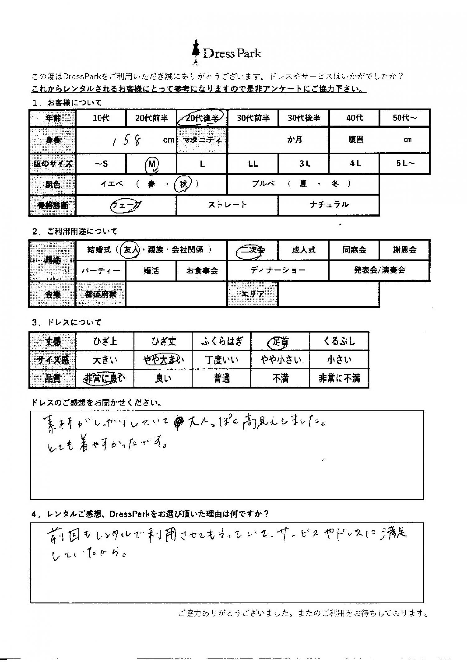 富山県 Y.Y様158㎝ Mサイズ #20代#M/L#155~159㎝#結婚式(友人)#富山県 ◆レンタルしたドレスはこちら ◆レンタルしたサイズは:M ◆レンタルした日付:2025/10/19 ドレスの着用感 ◆点数: (5点) ◆丈感:足首 ◆サイズ感:やや大きい ◆品質:非常に良い ◆肌色:イエベ ◆骨格診断:ウェーブ ドレスの感想 素材がしっかりしていて、大人っぽく高見えしました。とてもきやすかったです。 レンタルのご感想、DressParkをお選び頂いた理由 前回もレンタルで利用させてもらっていて、サービスやドレスに満足していたから。 CUSTOMER REVIEWS お客様の声 気になるカテゴリー別にご利用の感想をチェック! ◆AGE 年代で見る 10代 20代 30代 40代 50代~ ◆SIZE サイズで見る SS/S M/L 大きいサイズLL~ ◆HIGHT 身長で見る 140~149㎝ 150~154㎝ 155~159㎝ 160~164㎝ 165~169㎝ 170㎝以上 ◆マタニティ ~3か月 4~6か月 7~8か月 9~10か月 ◆肌色 イエベ ブルべ ◆骨格診断 ウェーブ ストレート ナチュラル ◆利用シーン 結婚式(友人) 結婚式(親族) 結婚式(会社関係) 二次会 成人式 謝恩会 パーティー その他 CUSTOMER REVIEWS都道府県別お客様の声 都道府県別にのお客様の声をチェック! 北海道 青森県 岩手県 宮城県 秋田県 山形県 福島県 茨城県 栃木県 群馬県 埼玉県 千葉県 東京都 神奈川県 新潟県 富山県 石川県 福井県 山梨県 長野県 岐阜県 静岡県 愛知県 三重県 滋賀県 京都府 大阪府 兵庫県 奈良県 和歌山県 鳥取県 島根県 岡山県 広島県 山口県 徳島県 香川県 愛媛県 高知県 福岡県 佐賀県 長崎県 熊本県 大分県 宮崎県 鹿児島県 沖縄県 CUSTOMER REVIEWSエリア別お客様の声 都道府県別にのお客様の声をチェック! 札幌 仙台 名古屋 軽井沢 金沢 神戸・芦屋 博多 那覇 梅田・新大阪 難波・心斎橋 鎌倉・湘南 横浜・みなとみらい 舞浜・浦安・幕張 大宮・浦和 青山・表参道 六本木・麻布 渋谷・恵比寿 新宿 池袋 銀座・丸の内 お台場・汐留 鹿児島市 郡山市 福島市 東予 甲府・石和 LINEでお問い合わせ このサイトではJavaScriptを使用しています