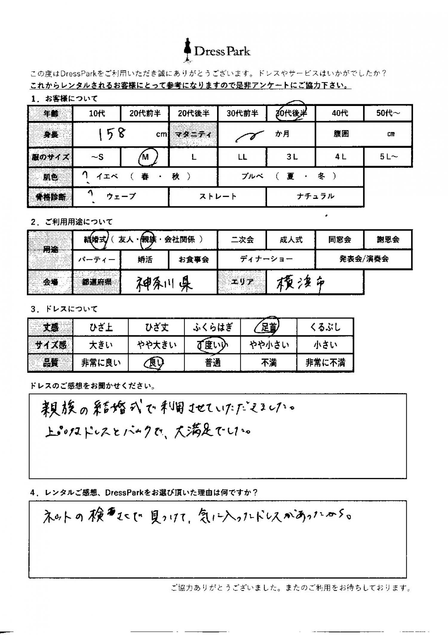 神奈川県 K.I様158㎝ Mサイズ横浜・みなとみらい #30代#M/L#155~159㎝#結婚式(親族)#神奈川県#横浜・みなとみらい ◆レンタルしたドレスはこちら ◆レンタルしたサイズは:M ◆レンタルした日付:2025/10/19 ドレスの着用感 ◆点数: (4点) ◆丈感:足首 ◆サイズ感:丁度いい ◆品質:良い ドレスの感想 親族の結婚式で利用させていただきました。上品なドレスとバッグで大満足でした。 レンタルのご感想、DressParkをお選び頂いた理由 ネット検索で見つけて、気に入ったドレスがあったから。 CUSTOMER REVIEWS お客様の声 気になるカテゴリー別にご利用の感想をチェック! ◆AGE 年代で見る 10代 20代 30代 40代 50代~ ◆SIZE サイズで見る SS/S M/L 大きいサイズLL~ ◆HIGHT 身長で見る 140~149㎝ 150~154㎝ 155~159㎝ 160~164㎝ 165~169㎝ 170㎝以上 ◆マタニティ ~3か月 4~6か月 7~8か月 9~10か月 ◆肌色 イエベ ブルべ ◆骨格診断 ウェーブ ストレート ナチュラル ◆利用シーン 結婚式(友人) 結婚式(親族) 結婚式(会社関係) 二次会 成人式 謝恩会 パーティー その他 CUSTOMER REVIEWS都道府県別お客様の声 都道府県別にのお客様の声をチェック! 北海道 青森県 岩手県 宮城県 秋田県 山形県 福島県 茨城県 栃木県 群馬県 埼玉県 千葉県 東京都 神奈川県 新潟県 富山県 石川県 福井県 山梨県 長野県 岐阜県 静岡県 愛知県 三重県 滋賀県 京都府 大阪府 兵庫県 奈良県 和歌山県 鳥取県 島根県 岡山県 広島県 山口県 徳島県 香川県 愛媛県 高知県 福岡県 佐賀県 長崎県 熊本県 大分県 宮崎県 鹿児島県 沖縄県 CUSTOMER REVIEWSエリア別お客様の声 都道府県別にのお客様の声をチェック! 札幌 仙台 名古屋 軽井沢 金沢 神戸・芦屋 博多 那覇 梅田・新大阪 難波・心斎橋 鎌倉・湘南 横浜・みなとみらい 舞浜・浦安・幕張 大宮・浦和 青山・表参道 六本木・麻布 渋谷・恵比寿 新宿 池袋 銀座・丸の内 お台場・汐留 鹿児島市 郡山市 福島市 東予 甲府・石和 LINEでお問い合わせ このサイトではJavaScriptを使用しています