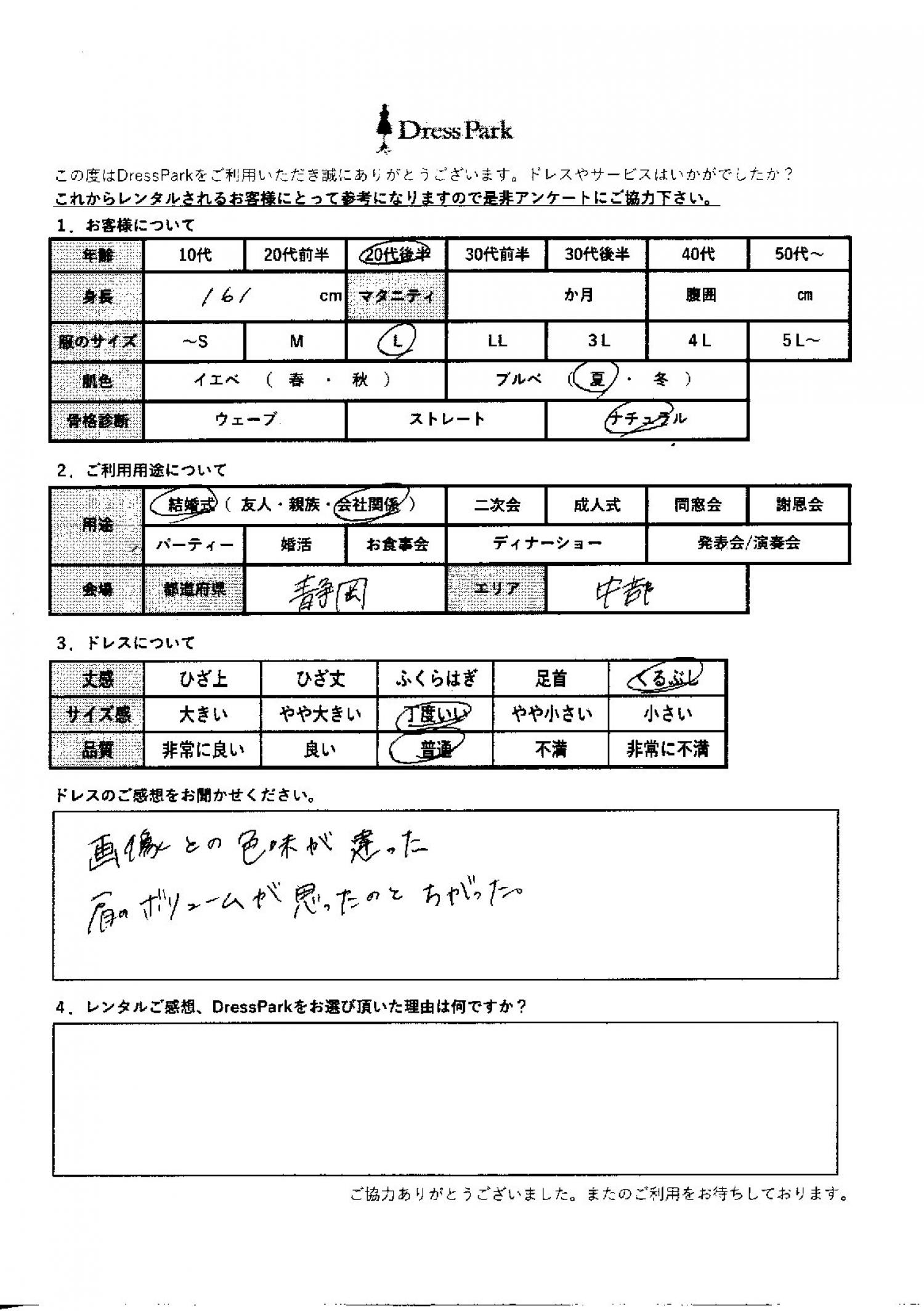 静岡県 Y.I様161㎝ Lサイズ #20代#M/L#160~164㎝#結婚式(会社関係)#静岡県 ◆レンタルしたドレスはこちら ◆レンタルしたサイズは:L ◆レンタルした日付:2025/10/20 ドレスの着用感 ◆点数: (3点) ◆丈感:くるぶし ◆サイズ感:丁度いい ◆品質:普通 ◆肌色:ブルべ ◆骨格診断:ナチュラル ドレスの感想 画像との色味が違った。肩のボリュームが思ったのと違った。 【スタッフより】 この度はご利用ありがとうございます。商品画像は、プロのカメラマンが実物に近くなるよう色を調整して撮影しておりますが、ご覧になるブラウザの環境や保護シート等でも見え方が異なります。できる限り明るい画面で見られることをおすすめいたします。 CUSTOMER REVIEWS お客様の声 気になるカテゴリー別にご利用の感想をチェック! ◆AGE 年代で見る 10代 20代 30代 40代 50代~ ◆SIZE サイズで見る SS/S M/L 大きいサイズLL~ ◆HIGHT 身長で見る 140~149㎝ 150~154㎝ 155~159㎝ 160~164㎝ 165~169㎝ 170㎝以上 ◆マタニティ ~3か月 4~6か月 7~8か月 9~10か月 ◆肌色 イエベ ブルべ ◆骨格診断 ウェーブ ストレート ナチュラル ◆利用シーン 結婚式(友人) 結婚式(親族) 結婚式(会社関係) 二次会 成人式 謝恩会 パーティー その他 CUSTOMER REVIEWS都道府県別お客様の声 都道府県別にのお客様の声をチェック! 北海道 青森県 岩手県 宮城県 秋田県 山形県 福島県 茨城県 栃木県 群馬県 埼玉県 千葉県 東京都 神奈川県 新潟県 富山県 石川県 福井県 山梨県 長野県 岐阜県 静岡県 愛知県 三重県 滋賀県 京都府 大阪府 兵庫県 奈良県 和歌山県 鳥取県 島根県 岡山県 広島県 山口県 徳島県 香川県 愛媛県 高知県 福岡県 佐賀県 長崎県 熊本県 大分県 宮崎県 鹿児島県 沖縄県 CUSTOMER REVIEWSエリア別お客様の声 都道府県別にのお客様の声をチェック! 札幌 仙台 名古屋 軽井沢 金沢 神戸・芦屋 博多 那覇 梅田・新大阪 難波・心斎橋 鎌倉・湘南 横浜・みなとみらい 舞浜・浦安・幕張 大宮・浦和 青山・表参道 六本木・麻布 渋谷・恵比寿 新宿 池袋 銀座・丸の内 お台場・汐留 鹿児島市 郡山市 福島市 東予 甲府・石和 LINEでお問い合わせ このサイトではJavaScriptを使用しています
