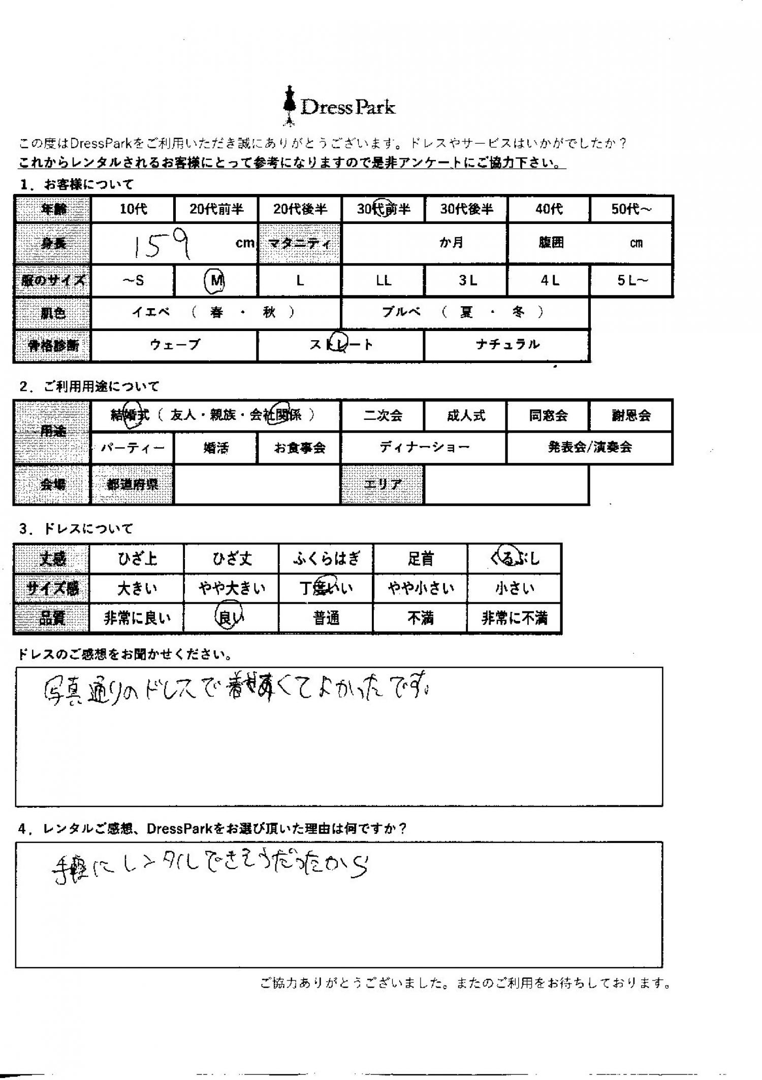 千葉県 Y.O様159㎝ Mサイズ #30代#M/L#155~159㎝#結婚式(会社関係)#千葉県 ◆レンタルしたドレスはこちら ◆レンタルしたサイズは:L ◆レンタルした日付:2025/10/18 ドレスの着用感 ◆点数: (4点) ◆丈感:くるぶし ◆サイズ感:丁度いい ◆品質:良い ◆骨格診断:ストレート ドレスの感想 写真通りのドレスで着やすくて良かったです。 レンタルのご感想、DressParkをお選び頂いた理由 手軽にレンタルできそうだったから。 CUSTOMER REVIEWS お客様の声 気になるカテゴリー別にご利用の感想をチェック! ◆AGE 年代で見る 10代 20代 30代 40代 50代~ ◆SIZE サイズで見る SS/S M/L 大きいサイズLL~ ◆HIGHT 身長で見る 140~149㎝ 150~154㎝ 155~159㎝ 160~164㎝ 165~169㎝ 170㎝以上 ◆マタニティ ~3か月 4~6か月 7~8か月 9~10か月 ◆肌色 イエベ ブルべ ◆骨格診断 ウェーブ ストレート ナチュラル ◆利用シーン 結婚式(友人) 結婚式(親族) 結婚式(会社関係) 二次会 成人式 謝恩会 パーティー その他 CUSTOMER REVIEWS都道府県別お客様の声 都道府県別にのお客様の声をチェック! 北海道 青森県 岩手県 宮城県 秋田県 山形県 福島県 茨城県 栃木県 群馬県 埼玉県 千葉県 東京都 神奈川県 新潟県 富山県 石川県 福井県 山梨県 長野県 岐阜県 静岡県 愛知県 三重県 滋賀県 京都府 大阪府 兵庫県 奈良県 和歌山県 鳥取県 島根県 岡山県 広島県 山口県 徳島県 香川県 愛媛県 高知県 福岡県 佐賀県 長崎県 熊本県 大分県 宮崎県 鹿児島県 沖縄県 CUSTOMER REVIEWSエリア別お客様の声 都道府県別にのお客様の声をチェック! 札幌 仙台 名古屋 軽井沢 金沢 神戸・芦屋 博多 那覇 梅田・新大阪 難波・心斎橋 鎌倉・湘南 横浜・みなとみらい 舞浜・浦安・幕張 大宮・浦和 青山・表参道 六本木・麻布 渋谷・恵比寿 新宿 池袋 銀座・丸の内 お台場・汐留 鹿児島市 郡山市 福島市 東予 甲府・石和 LINEでお問い合わせ このサイトではJavaScriptを使用しています