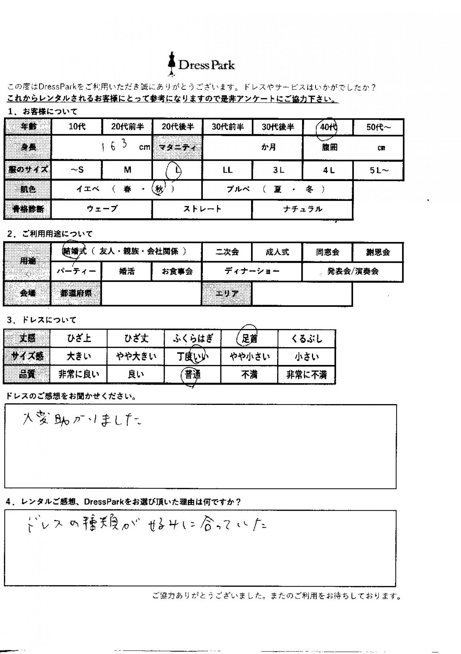 東京都 M.K様163㎝ Lサイズ #40代#M/L#160~164㎝#結婚式(友人)#東京都 ◆レンタルしたドレスはこちら ◆レンタルしたサイズは:L ◆レンタルした日付:2025/10/19 ドレスの着用感 ◆点数: (4点) ◆丈感:足首 ◆サイズ感:丁度いい ◆品質:普通 ◆肌色:イエベ ドレスの感想 大変助かりました。 レンタルのご感想、DressParkをお選び頂いた理由 ドレスの種類が好みに合っていた。 CUSTOMER REVIEWS お客様の声 気になるカテゴリー別にご利用の感想をチェック! ◆AGE 年代で見る 10代 20代 30代 40代 50代~ ◆SIZE サイズで見る SS/S M/L 大きいサイズLL~ ◆HIGHT 身長で見る 140~149㎝ 150~154㎝ 155~159㎝ 160~164㎝ 165~169㎝ 170㎝以上 ◆マタニティ ~3か月 4~6か月 7~8か月 9~10か月 ◆肌色 イエベ ブルべ ◆骨格診断 ウェーブ ストレート ナチュラル ◆利用シーン 結婚式(友人) 結婚式(親族) 結婚式(会社関係) 二次会 成人式 謝恩会 パーティー その他 CUSTOMER REVIEWS都道府県別お客様の声 都道府県別にのお客様の声をチェック! 北海道 青森県 岩手県 宮城県 秋田県 山形県 福島県 茨城県 栃木県 群馬県 埼玉県 千葉県 東京都 神奈川県 新潟県 富山県 石川県 福井県 山梨県 長野県 岐阜県 静岡県 愛知県 三重県 滋賀県 京都府 大阪府 兵庫県 奈良県 和歌山県 鳥取県 島根県 岡山県 広島県 山口県 徳島県 香川県 愛媛県 高知県 福岡県 佐賀県 長崎県 熊本県 大分県 宮崎県 鹿児島県 沖縄県 CUSTOMER REVIEWSエリア別お客様の声 都道府県別にのお客様の声をチェック! 札幌 仙台 名古屋 軽井沢 金沢 神戸・芦屋 博多 那覇 梅田・新大阪 難波・心斎橋 鎌倉・湘南 横浜・みなとみらい 舞浜・浦安・幕張 大宮・浦和 青山・表参道 六本木・麻布 渋谷・恵比寿 新宿 池袋 銀座・丸の内 お台場・汐留 鹿児島市 郡山市 福島市 東予 甲府・石和 LINEでお問い合わせ このサイトではJavaScriptを使用しています