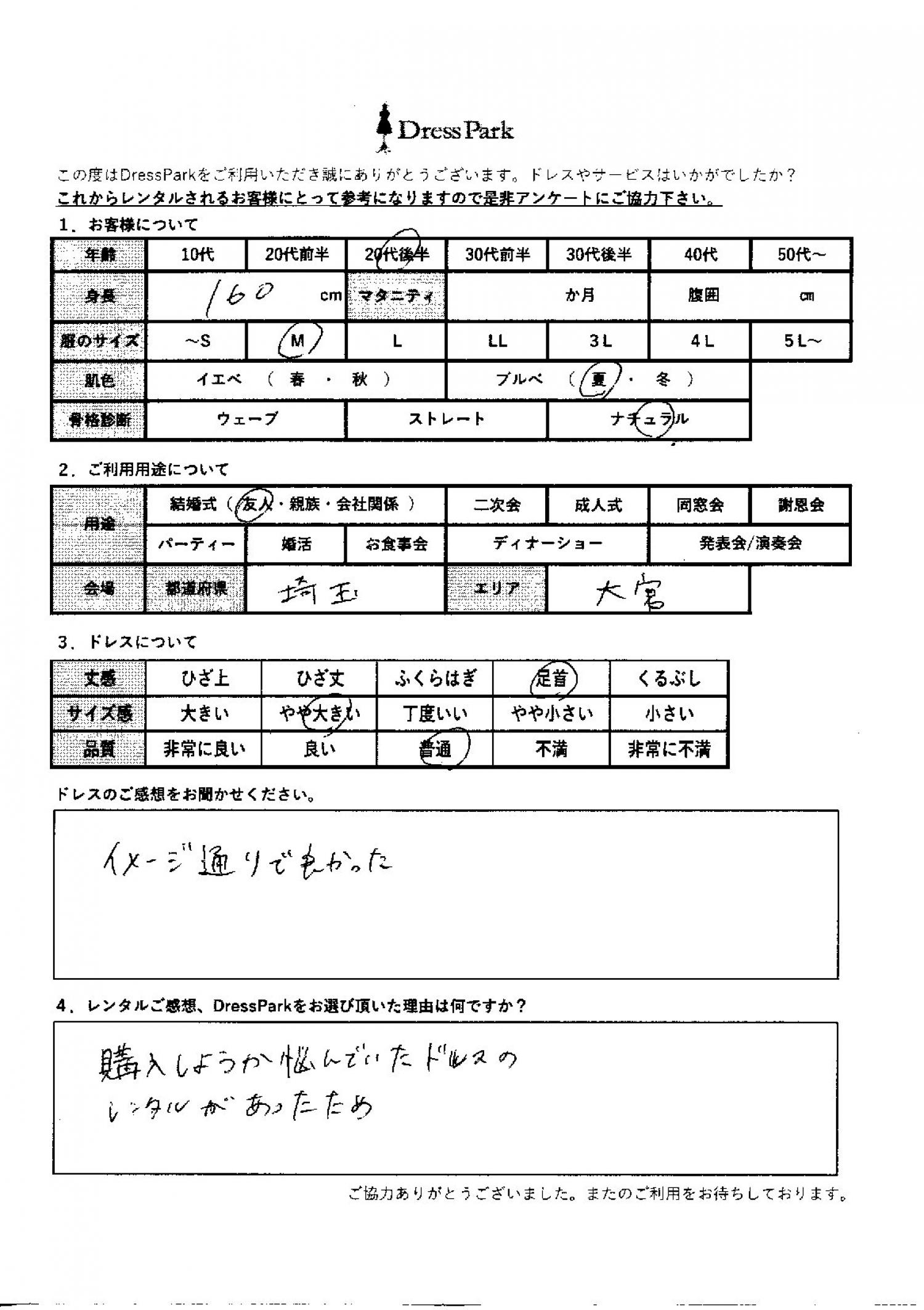 埼玉県 S.N様160㎝ Mサイズ大宮・浦和 #20代#M/L#160~164㎝#結婚式(友人)#埼玉県#大宮・浦和 ◆レンタルしたドレスはこちら ◆レンタルしたサイズは:M ◆レンタルした日付:2025/10/19 ドレスの着用感 ◆点数: (4点) ◆丈感:足首 ◆サイズ感:やや大きい ◆品質:普通 ◆肌色:ブルべ ◆骨格診断:ナチュラル ドレスの感想 イメージ通りでよかった。 レンタルのご感想、DressParkをお選び頂いた理由 購入しようか悩んでいたドレスのレンタルがあったため。 CUSTOMER REVIEWS お客様の声 気になるカテゴリー別にご利用の感想をチェック! ◆AGE 年代で見る 10代 20代 30代 40代 50代~ ◆SIZE サイズで見る SS/S M/L 大きいサイズLL~ ◆HIGHT 身長で見る 140~149㎝ 150~154㎝ 155~159㎝ 160~164㎝ 165~169㎝ 170㎝以上 ◆マタニティ ~3か月 4~6か月 7~8か月 9~10か月 ◆肌色 イエベ ブルべ ◆骨格診断 ウェーブ ストレート ナチュラル ◆利用シーン 結婚式(友人) 結婚式(親族) 結婚式(会社関係) 二次会 成人式 謝恩会 パーティー その他 CUSTOMER REVIEWS都道府県別お客様の声 都道府県別にのお客様の声をチェック! 北海道 青森県 岩手県 宮城県 秋田県 山形県 福島県 茨城県 栃木県 群馬県 埼玉県 千葉県 東京都 神奈川県 新潟県 富山県 石川県 福井県 山梨県 長野県 岐阜県 静岡県 愛知県 三重県 滋賀県 京都府 大阪府 兵庫県 奈良県 和歌山県 鳥取県 島根県 岡山県 広島県 山口県 徳島県 香川県 愛媛県 高知県 福岡県 佐賀県 長崎県 熊本県 大分県 宮崎県 鹿児島県 沖縄県 CUSTOMER REVIEWSエリア別お客様の声 都道府県別にのお客様の声をチェック! 札幌 仙台 名古屋 軽井沢 金沢 神戸・芦屋 博多 那覇 梅田・新大阪 難波・心斎橋 鎌倉・湘南 横浜・みなとみらい 舞浜・浦安・幕張 大宮・浦和 青山・表参道 六本木・麻布 渋谷・恵比寿 新宿 池袋 銀座・丸の内 お台場・汐留 鹿児島市 郡山市 福島市 東予 甲府・石和 LINEでお問い合わせ このサイトではJavaScriptを使用しています