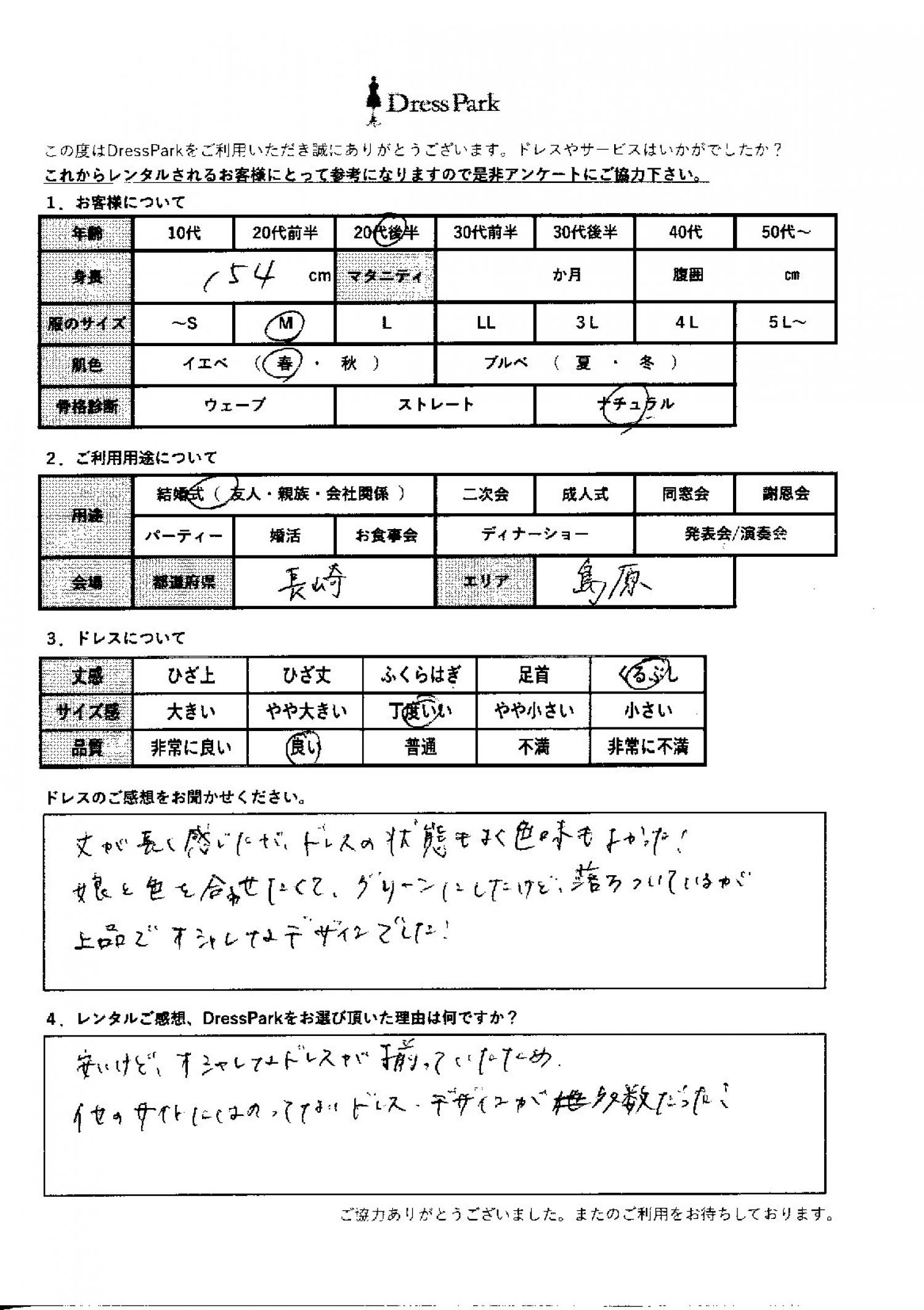 長崎県 N.K様154㎝ Mサイズ #20代#M/L#150~154㎝#結婚式(友人)#長崎県 ◆レンタルしたドレスはこちら ◆レンタルしたサイズは:M ◆レンタルした日付:2025/10/19 ドレスの着用感 ◆点数: (4点) ◆丈感:くるぶし ◆サイズ感:丁度いい ◆品質:良い ◆肌色:イエベ ◆骨格診断:ナチュラル ドレスの感想 長く感じたが、ドレスの状態も良く、色味も良かった!娘と色を合わせたくてグリーンにしたけど、落ち着いているが上品でおしゃれなデザインでした! レンタルのご感想、DressParkをお選び頂いた理由 安いけど、おしゃれなドレスが揃っていたため。他のサイトには載っていない。ドレス、デザインが多数だった! CUSTOMER REVIEWS お客様の声 気になるカテゴリー別にご利用の感想をチェック! ◆AGE 年代で見る 10代 20代 30代 40代 50代~ ◆SIZE サイズで見る SS/S M/L 大きいサイズLL~ ◆HIGHT 身長で見る 140~149㎝ 150~154㎝ 155~159㎝ 160~164㎝ 165~169㎝ 170㎝以上 ◆マタニティ ~3か月 4~6か月 7~8か月 9~10か月 ◆肌色 イエベ ブルべ ◆骨格診断 ウェーブ ストレート ナチュラル ◆利用シーン 結婚式(友人) 結婚式(親族) 結婚式(会社関係) 二次会 成人式 謝恩会 パーティー その他 CUSTOMER REVIEWS都道府県別お客様の声 都道府県別にのお客様の声をチェック! 北海道 青森県 岩手県 宮城県 秋田県 山形県 福島県 茨城県 栃木県 群馬県 埼玉県 千葉県 東京都 神奈川県 新潟県 富山県 石川県 福井県 山梨県 長野県 岐阜県 静岡県 愛知県 三重県 滋賀県 京都府 大阪府 兵庫県 奈良県 和歌山県 鳥取県 島根県 岡山県 広島県 山口県 徳島県 香川県 愛媛県 高知県 福岡県 佐賀県 長崎県 熊本県 大分県 宮崎県 鹿児島県 沖縄県 CUSTOMER REVIEWSエリア別お客様の声 都道府県別にのお客様の声をチェック! 札幌 仙台 名古屋 軽井沢 金沢 神戸・芦屋 博多 那覇 梅田・新大阪 難波・心斎橋 鎌倉・湘南 横浜・みなとみらい 舞浜・浦安・幕張 大宮・浦和 青山・表参道 六本木・麻布 渋谷・恵比寿 新宿 池袋 銀座・丸の内 お台場・汐留 鹿児島市 郡山市 福島市 東予 甲府・石和 LINEでお問い合わせ このサイトではJavaScriptを使用しています