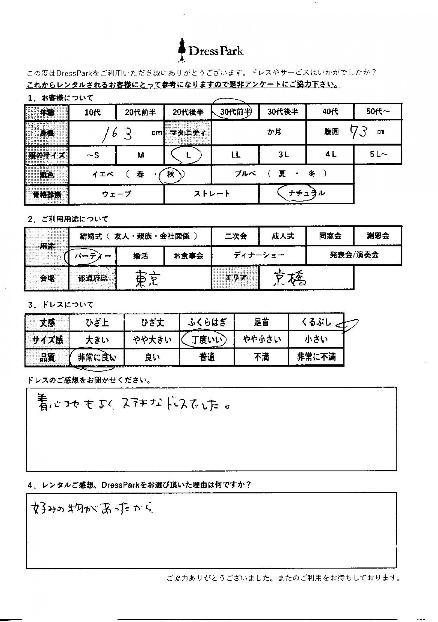 東京都 S.H様163㎝ Lサイズ #30代#M/L#160~164㎝#パーティー#東京都 ◆レンタルしたドレスはこちら ◆レンタルしたサイズは:L ◆レンタルした日付:2025/10/22 ドレスの着用感 ◆点数: (5点) ◆丈感:くるぶし ◆サイズ感:丁度いい ◆品質:非常に良い ◆肌色:イエベ ◆骨格診断:ナチュラル ドレスの感想 着心地も良く素敵なドレスでした。 レンタルのご感想、DressParkをお選び頂いた理由 好みのものがあったから。 CUSTOMER REVIEWS お客様の声 気になるカテゴリー別にご利用の感想をチェック! ◆AGE 年代で見る 10代 20代 30代 40代 50代~ ◆SIZE サイズで見る SS/S M/L 大きいサイズLL~ ◆HIGHT 身長で見る 140~149㎝ 150~154㎝ 155~159㎝ 160~164㎝ 165~169㎝ 170㎝以上 ◆マタニティ ~3か月 4~6か月 7~8か月 9~10か月 ◆肌色 イエベ ブルべ ◆骨格診断 ウェーブ ストレート ナチュラル ◆利用シーン 結婚式(友人) 結婚式(親族) 結婚式(会社関係) 二次会 成人式 謝恩会 パーティー その他 CUSTOMER REVIEWS都道府県別お客様の声 都道府県別にのお客様の声をチェック! 北海道 青森県 岩手県 宮城県 秋田県 山形県 福島県 茨城県 栃木県 群馬県 埼玉県 千葉県 東京都 神奈川県 新潟県 富山県 石川県 福井県 山梨県 長野県 岐阜県 静岡県 愛知県 三重県 滋賀県 京都府 大阪府 兵庫県 奈良県 和歌山県 鳥取県 島根県 岡山県 広島県 山口県 徳島県 香川県 愛媛県 高知県 福岡県 佐賀県 長崎県 熊本県 大分県 宮崎県 鹿児島県 沖縄県 CUSTOMER REVIEWSエリア別お客様の声 都道府県別にのお客様の声をチェック! 札幌 仙台 名古屋 軽井沢 金沢 神戸・芦屋 博多 那覇 梅田・新大阪 難波・心斎橋 鎌倉・湘南 横浜・みなとみらい 舞浜・浦安・幕張 大宮・浦和 青山・表参道 六本木・麻布 渋谷・恵比寿 新宿 池袋 銀座・丸の内 お台場・汐留 鹿児島市 郡山市 福島市 東予 甲府・石和 LINEでお問い合わせ このサイトではJavaScriptを使用しています